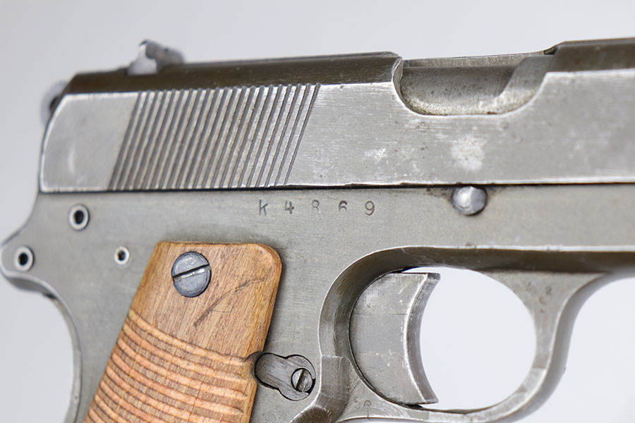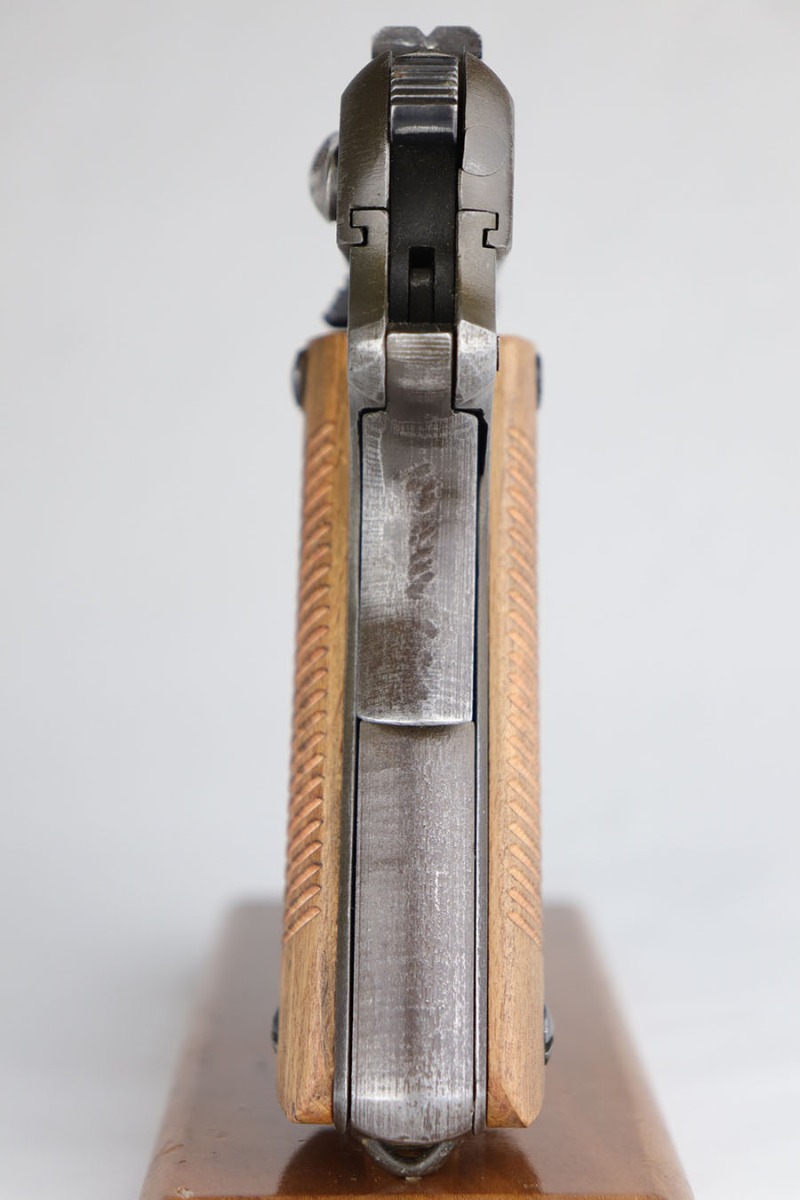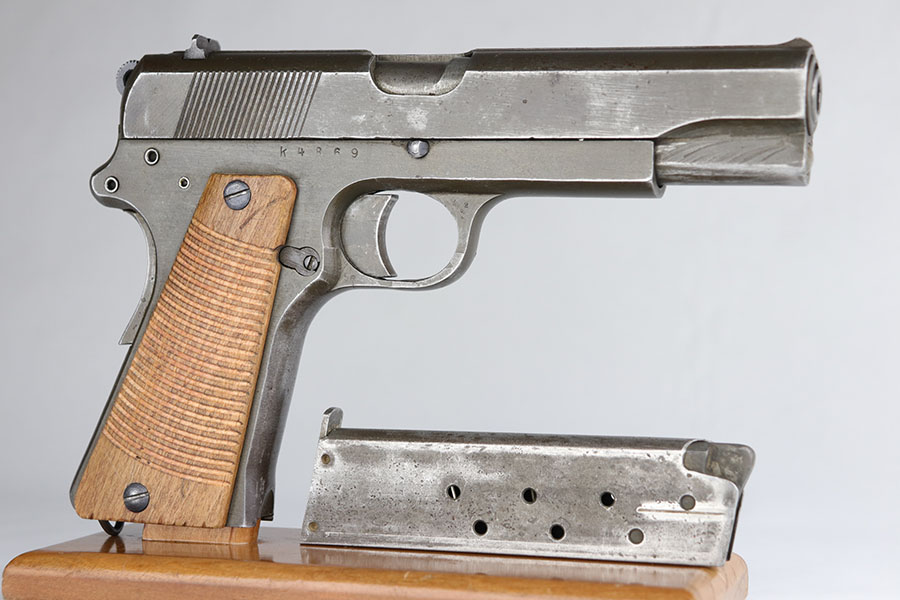 6/2/20 – This is an increasingly hard-to-find Steyr produced Radom with late-war phosphate finish. There were only ~22,000 of these produced! This pistol is all correct, matching and original with some blued small parts. The phosphate finish shows thinning on the straps, left face of the slide and high edges. Correct magazine with Steyr factory E/623 proof. Postwar wood grips. Minty bore.