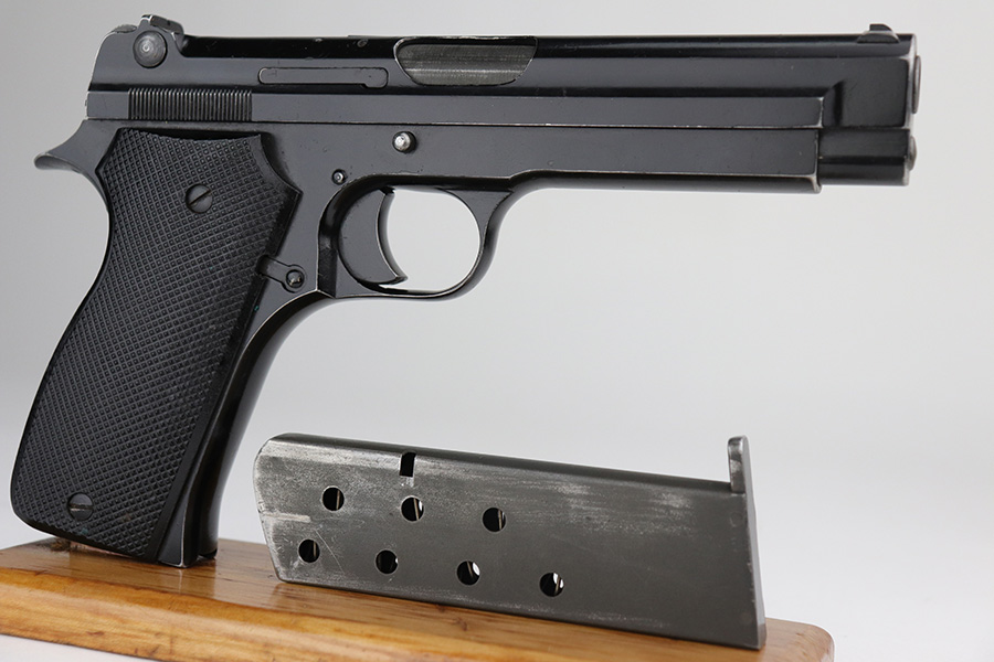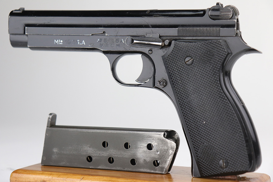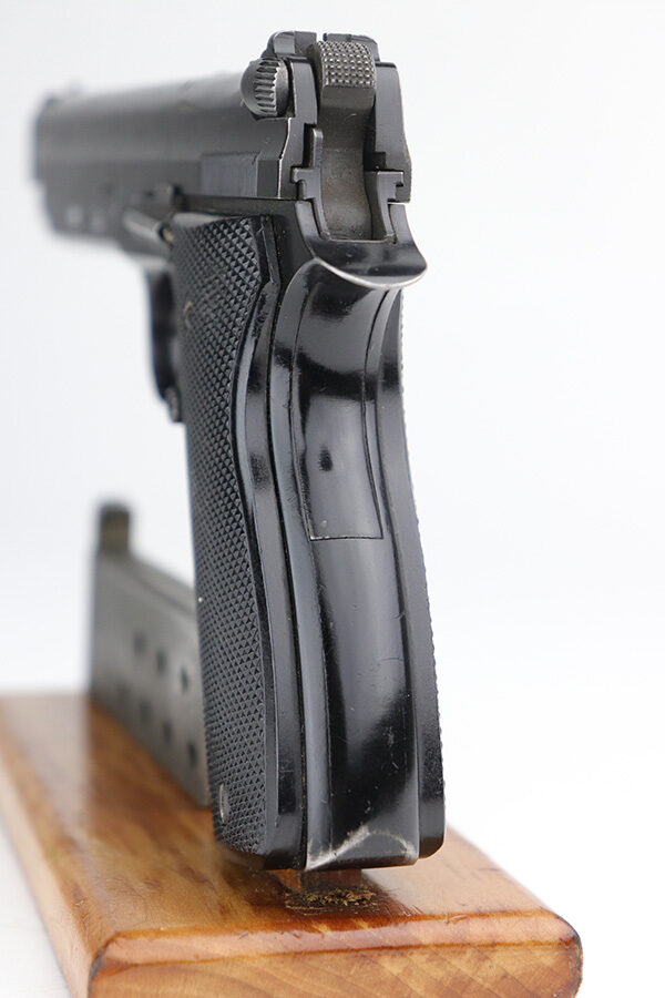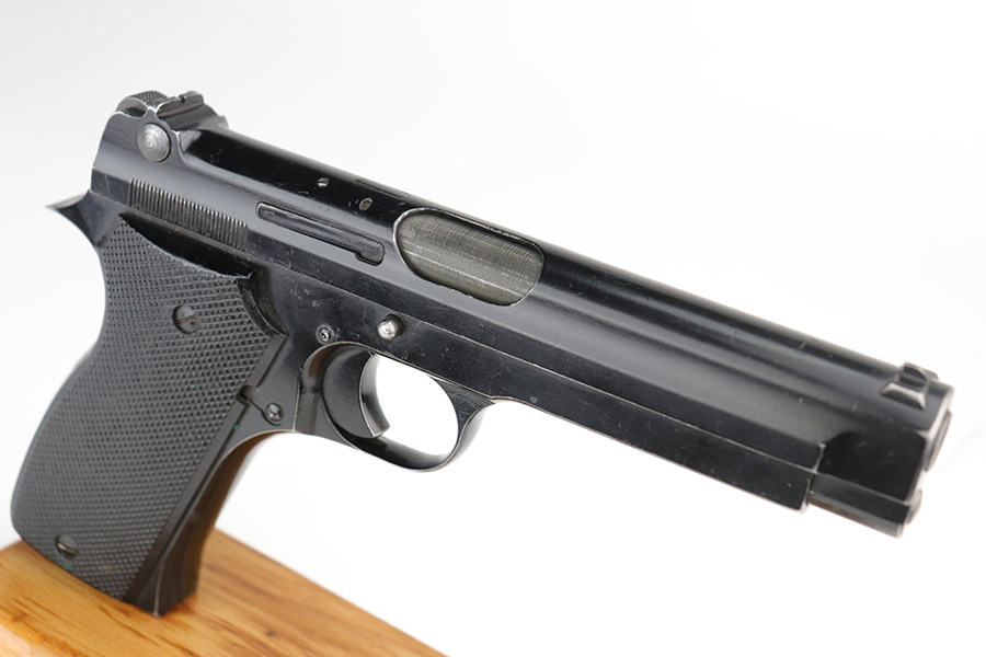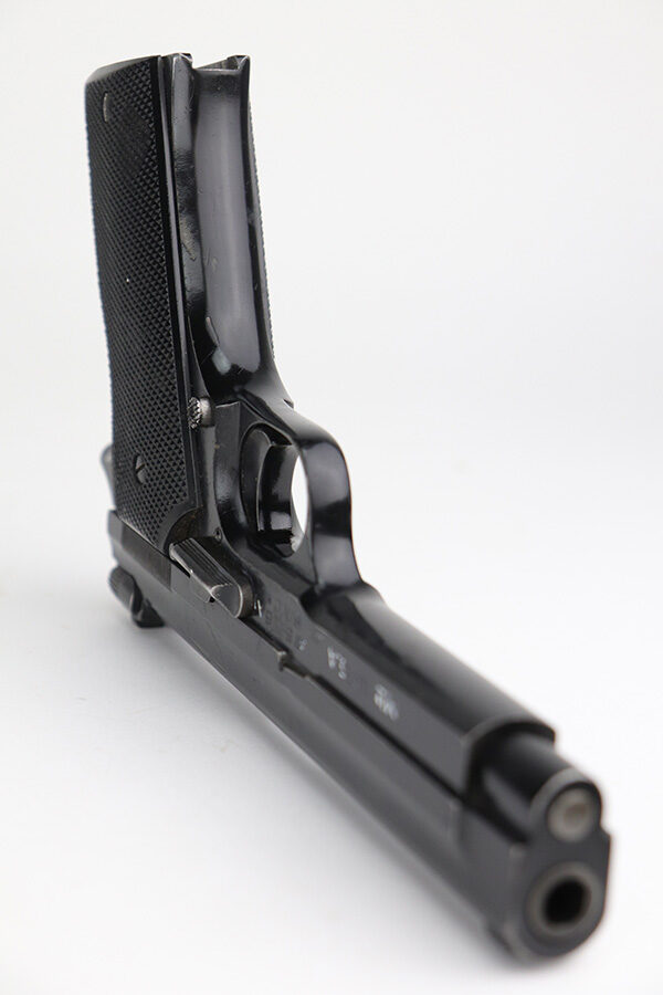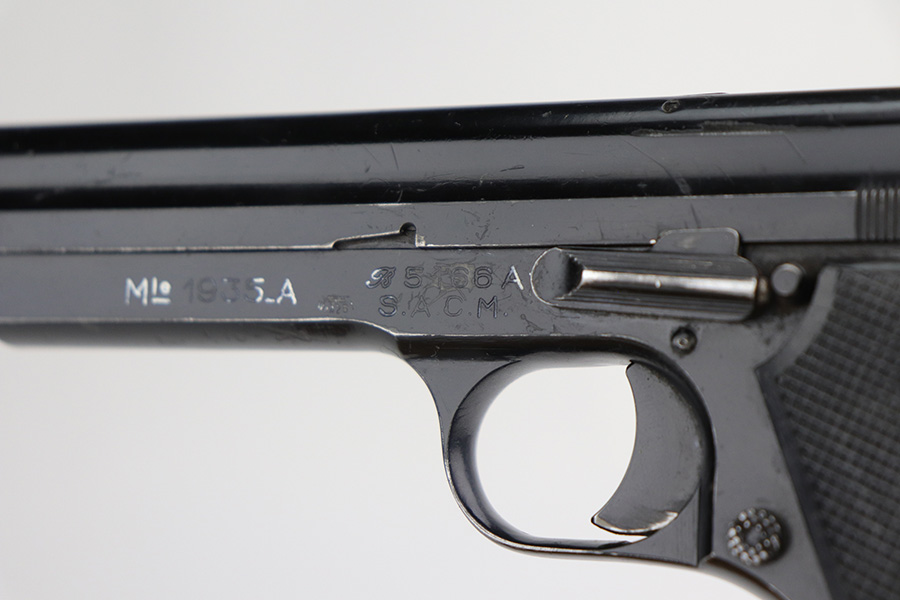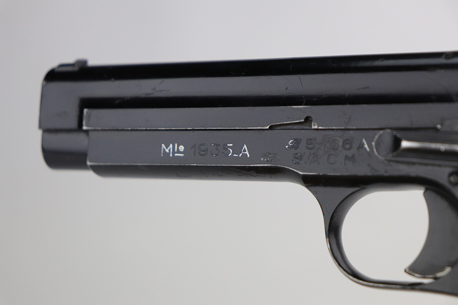 10/19/21 – This is an all original Nazi M1935-A, manufactured by SACM (Societe Alsacienne Construction Mecanique) in Cholet, France. The gun is in excellent original condition with a few minor areas of flaking, mostly on left side of slide or frame. It is Nazi-marked E/WaA251 on the left side of the slide, making this the more common 2nd variation model of these pistols. Overall, they remain fairly scarce for German Army pistols of that time, with only about ~24,000 produced. The serial dates this one to 1942-1943. Terrific bore. Excellent grips.