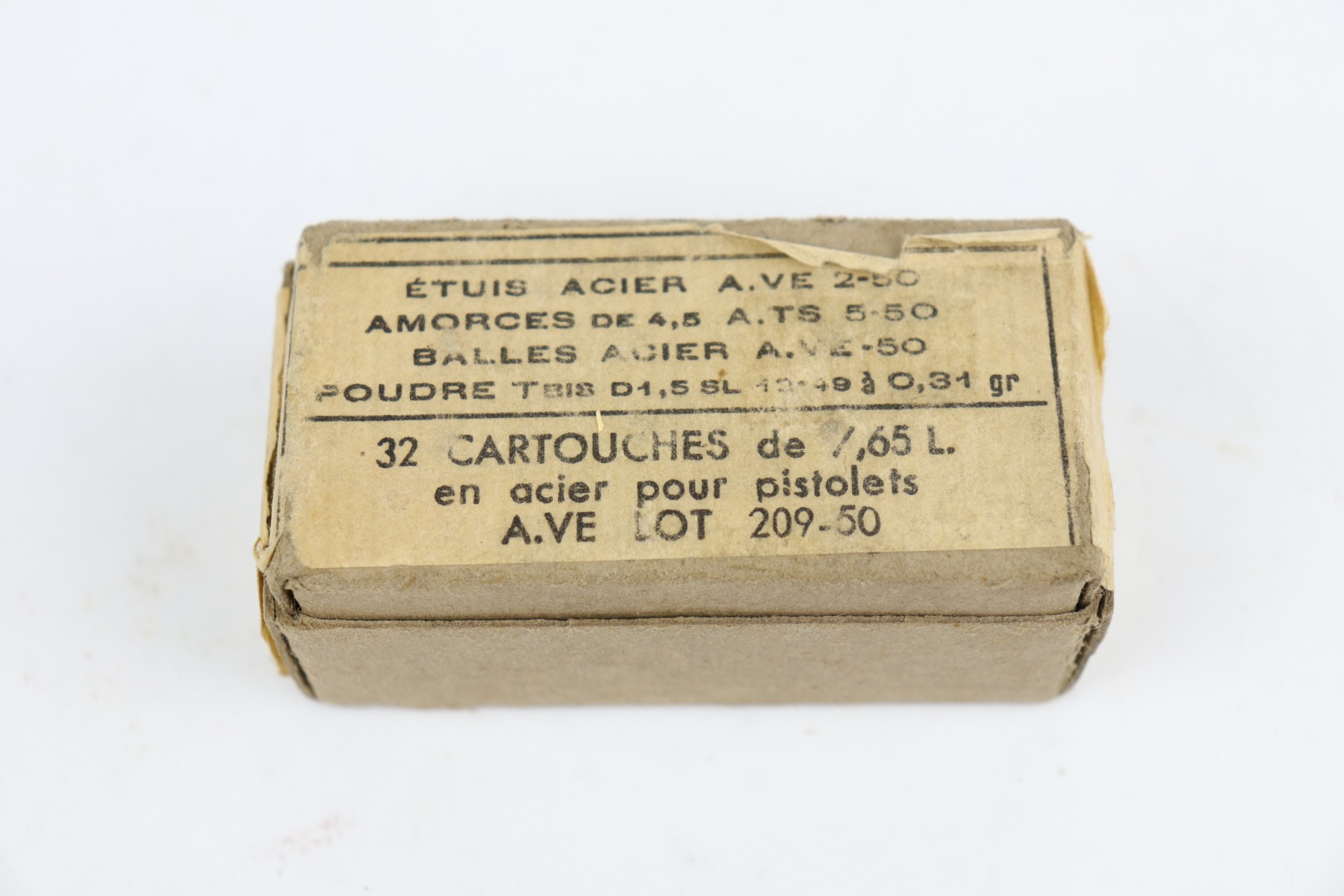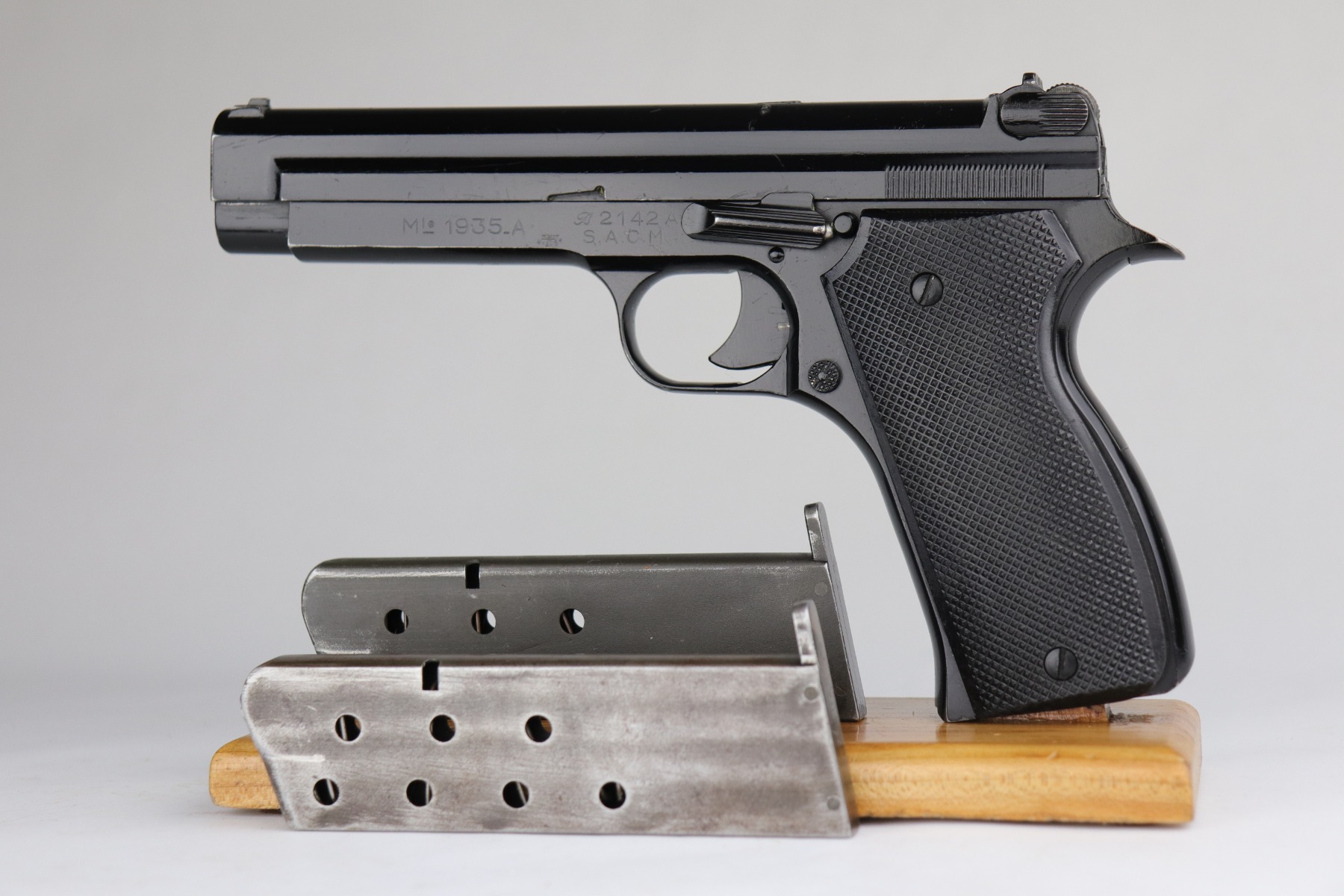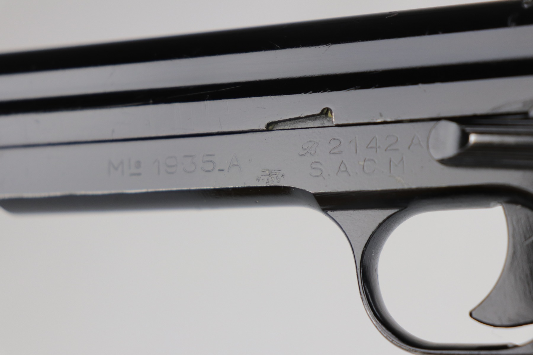 7/10/20 – This is a scarce S.A.C.M. M1935A that was issued to the German Army in the early 1940s. It’s all original with about 98% of the baked, black finish remaining. All major surface areas show minor wear or scuffs. The grips are excellent. The bore is very nice – shiny with strong rifling. It comes with two period correct magazines. It also comes with one box of original ammo.