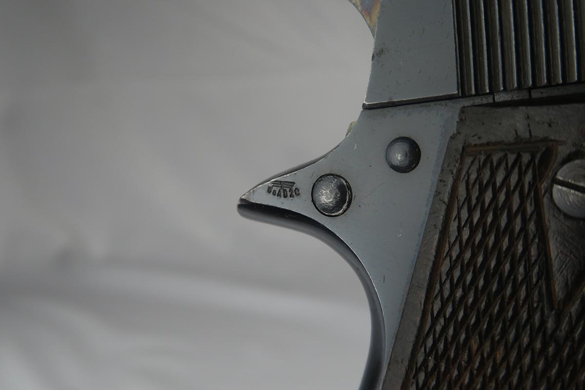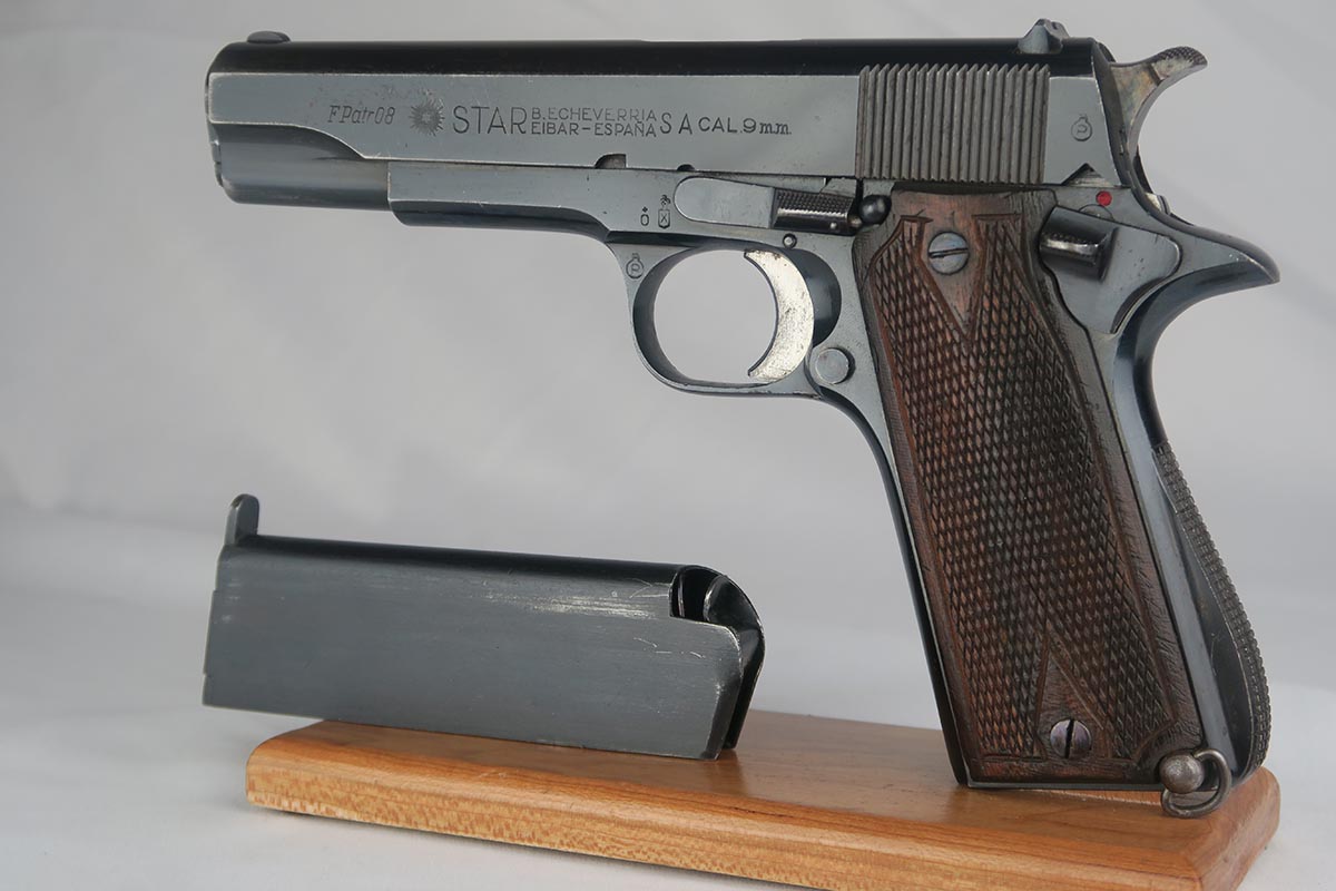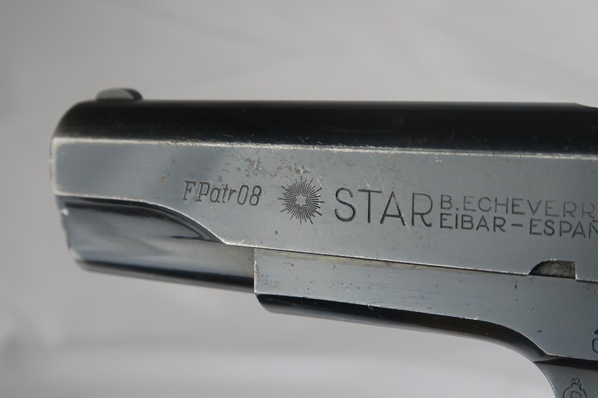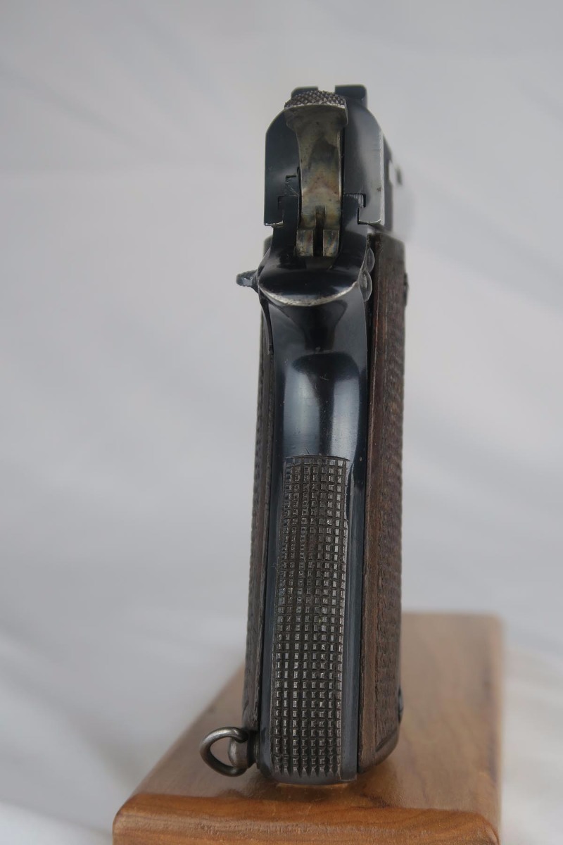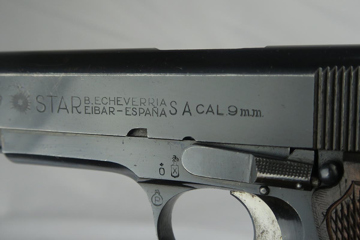 9/19/17 – This is a nice Star Model B with Nazi proof on the right side tang.  It is all original and correct with about 94-95% high-polish blue remaining.  There is some high edge wear on both sides of the slide, as well as some finish loss on the underside of the slide toward the muzzle.  The firm of Star Bonifacio Echeverria SA, located in Eibar, Spain, originated in 1905 but the factory was destroyed during the Spanish Civil War (1936-1939).  It was rebuilt adjacent to the original site, and during WW2 it supplied about 25,000 pistols to the German Army in France.  There are two serial ranges for these contracts, with this pistol falling correctly into the second batch and given an E/WaAD20 acceptance stamp.  The grips and magazine are all original and in very good to excellent condition.  Excellent bore.