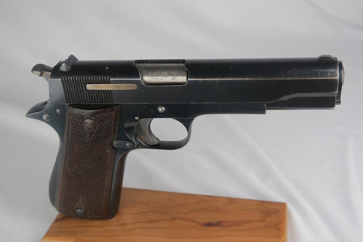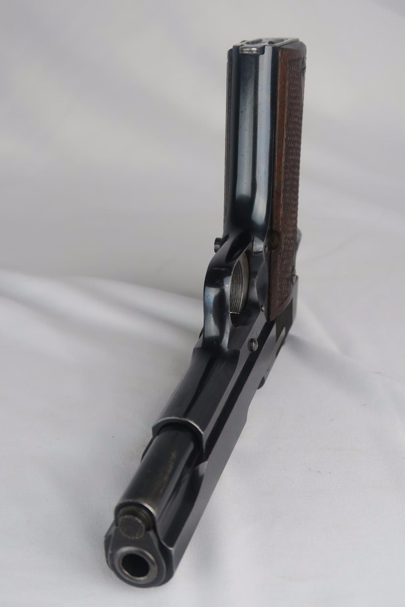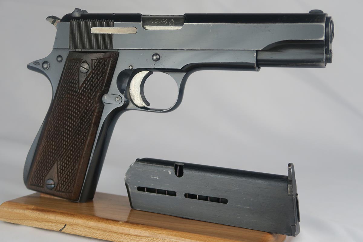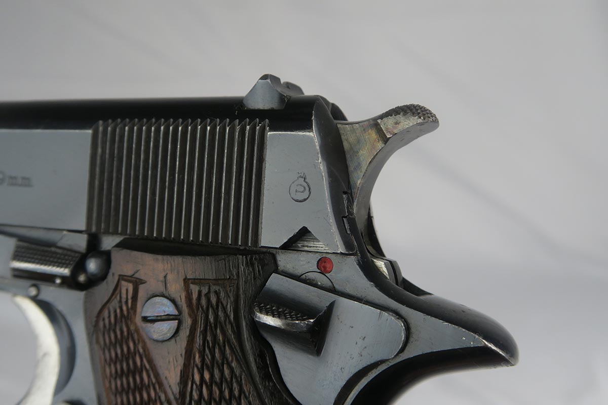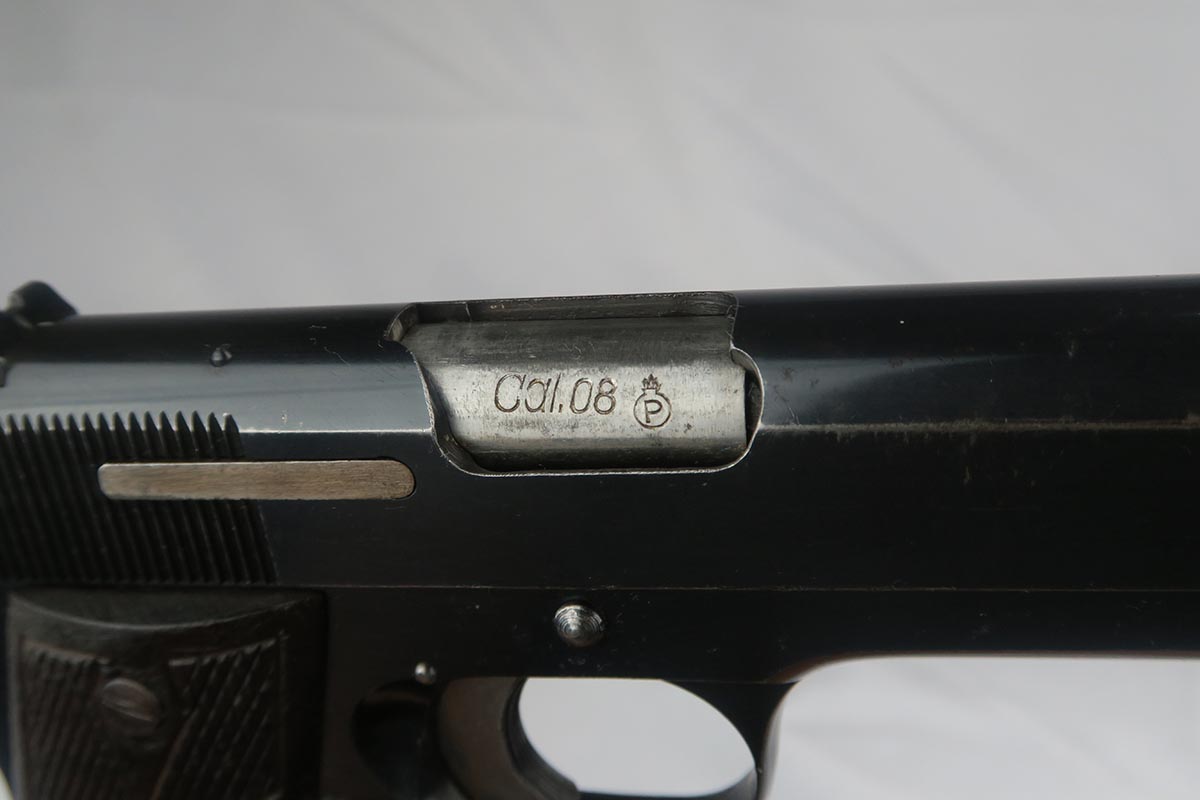 9/19/17 – This is a nice Star Model B with Nazi proof on the right side tang.  It is all original and correct with about 94-95% high-polish blue remaining.  There is some high edge wear on both sides of the slide, as well as some finish loss on the underside of the slide toward the muzzle.  The firm of Star Bonifacio Echeverria SA, located in Eibar, Spain, originated in 1905 but the factory was destroyed during the Spanish Civil War (1936-1939).  It was rebuilt adjacent to the original site, and during WW2 it supplied about 25,000 pistols to the German Army in France.  There are two serial ranges for these contracts, with this pistol falling correctly into the second batch and given an E/WaAD20 acceptance stamp.  The grips and magazine are all original and in very good to excellent condition.  Excellent bore.