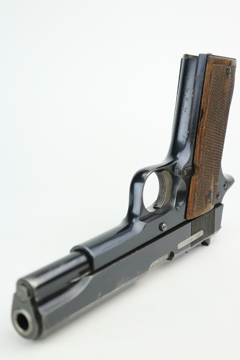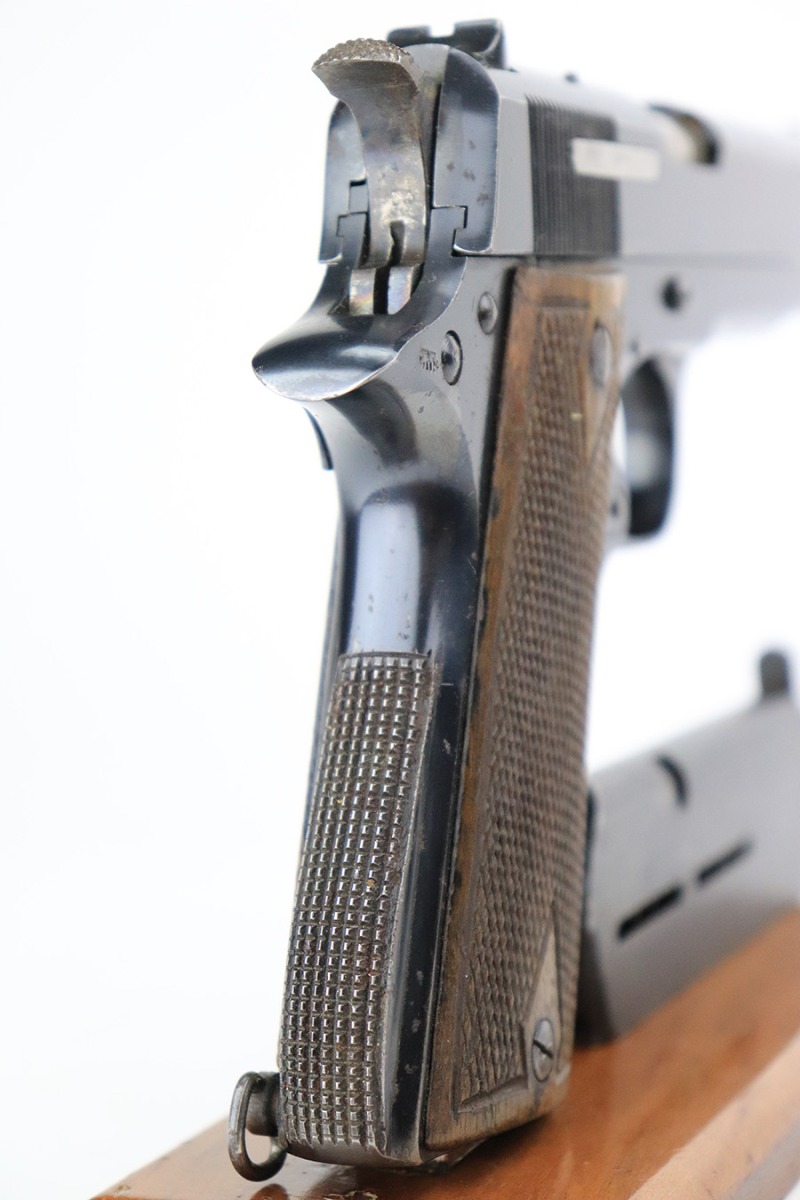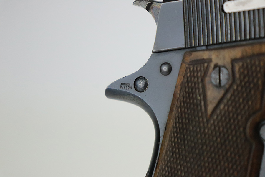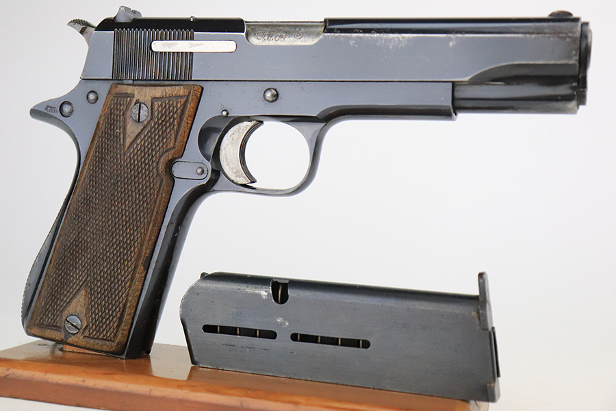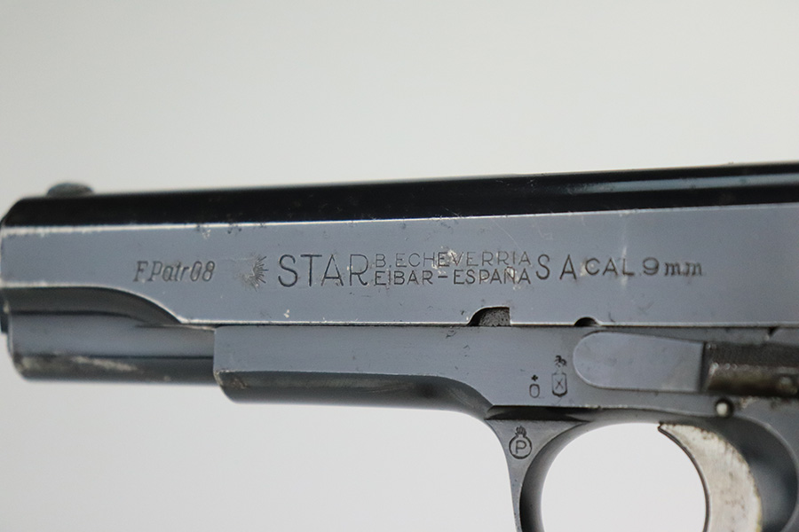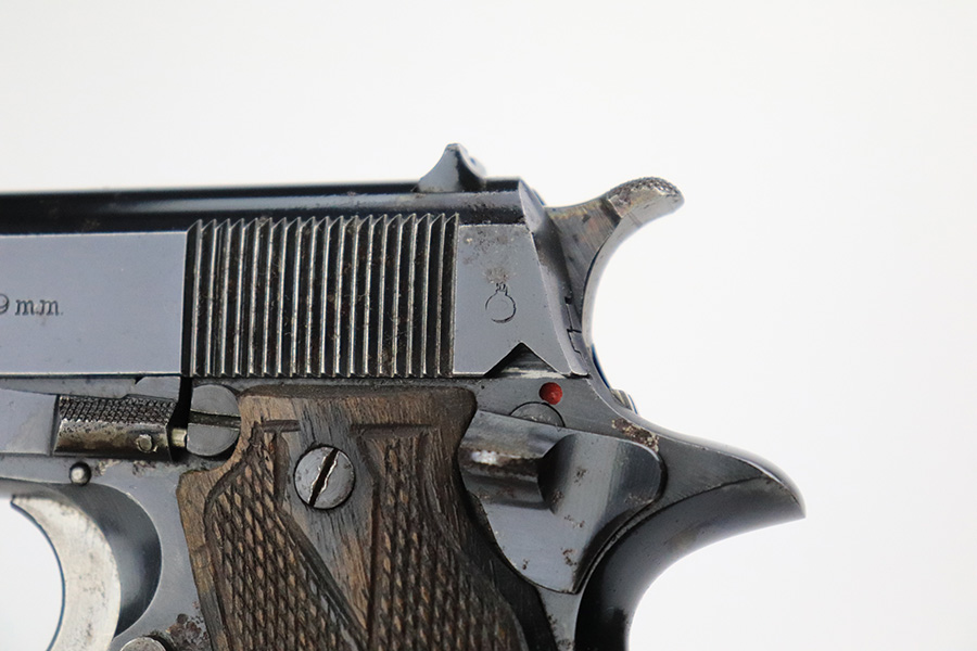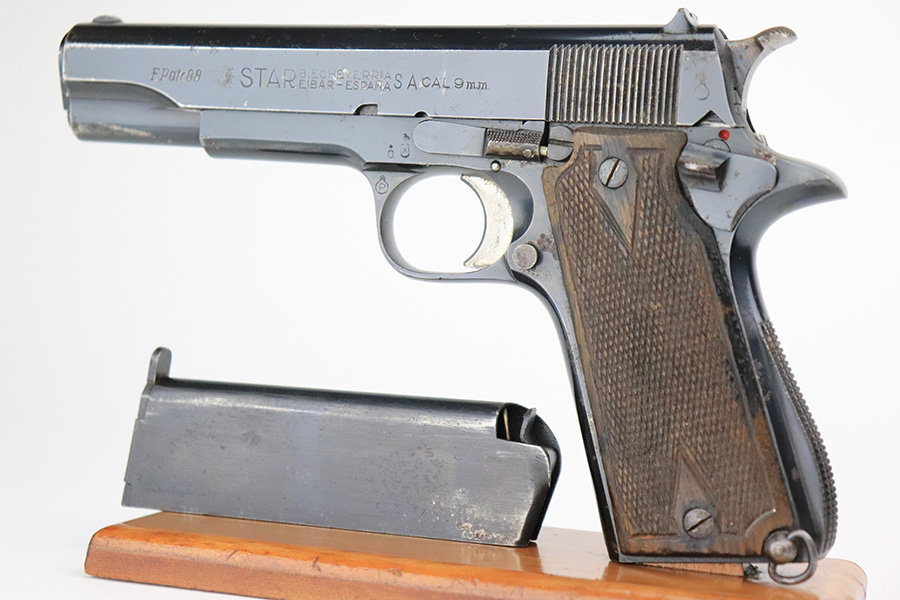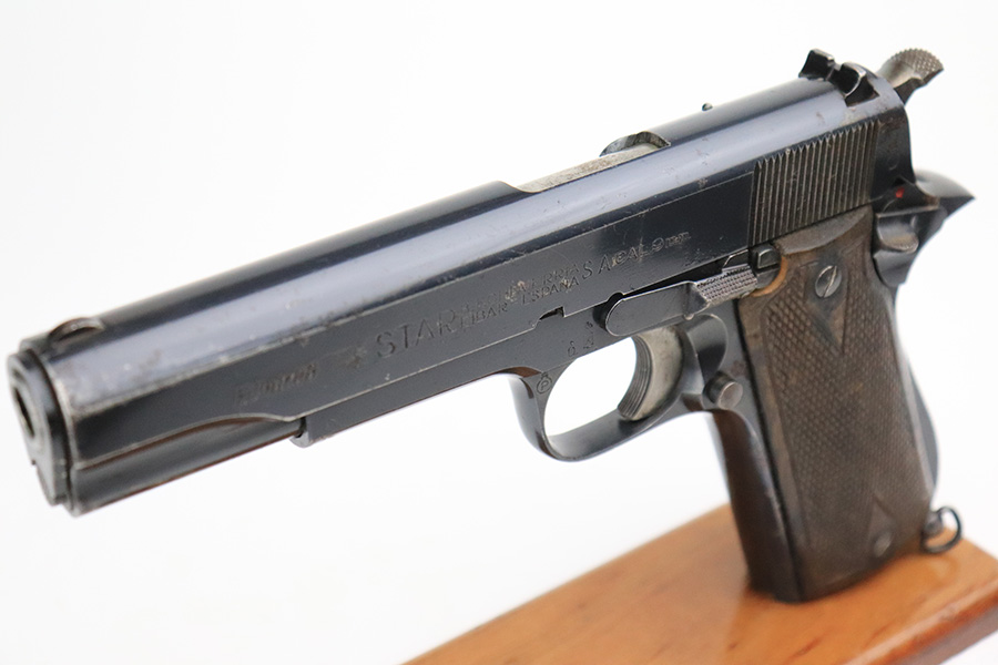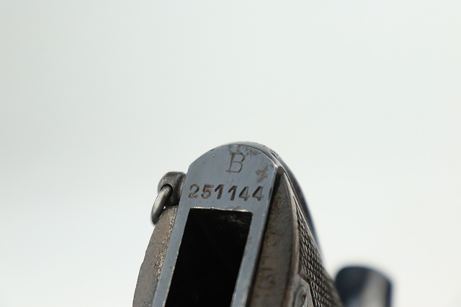 6/9/22 – This is a very nice example of a Spanish Star Model B issued to the Nazi military during WW2. It is all matching and has the proper “Waffen D20” Nazi military acceptance proof on the right side of the tang. The firm of Star Bonifacio Echeverria SA, located in Eibar, Spain, originated in 1905 but the factory was destroyed during the Spanish Civil War (1936-1939). It was rebuilt adjacent to the original site, and during WW2 it supplied about 25,000 pistols to the German Army in France. There are two serial ranges for these contracts, with this pistol falling correctly into the second batch. It has retained about 94% of its original high polish finish. There is minor wear around the high edges and areas of spotty discoloration and minor pitting here and there on the gun throughout. It is most noticeable on the left side. Comes with fairly worn period-correct wood grips and one proper magazine. Excellent bore – shiny with strong rifling.