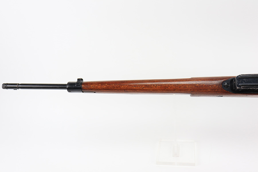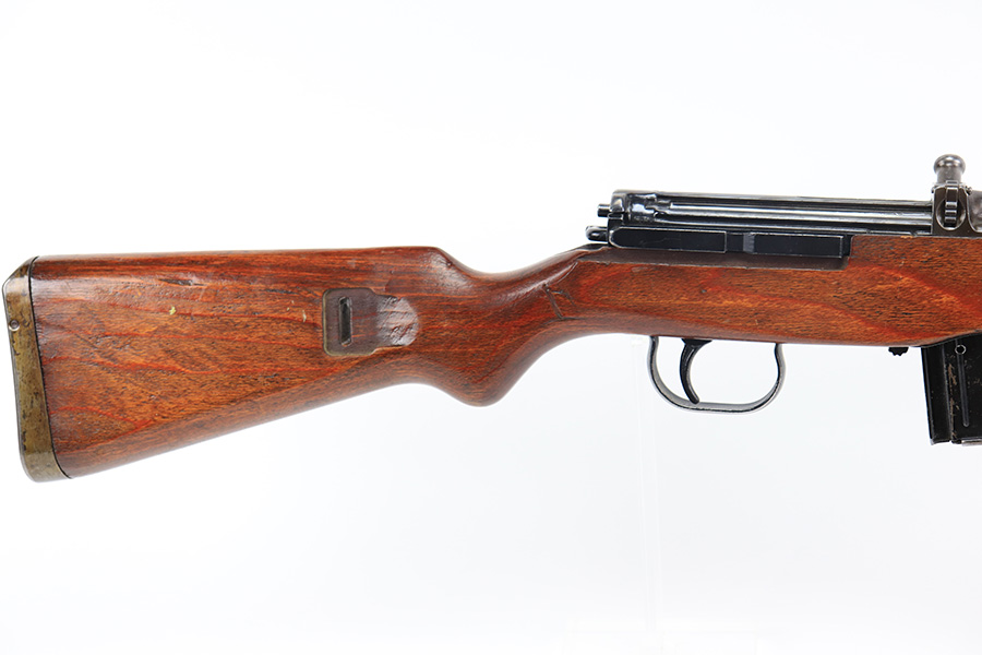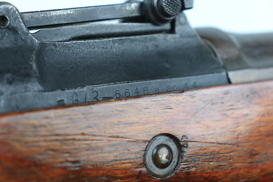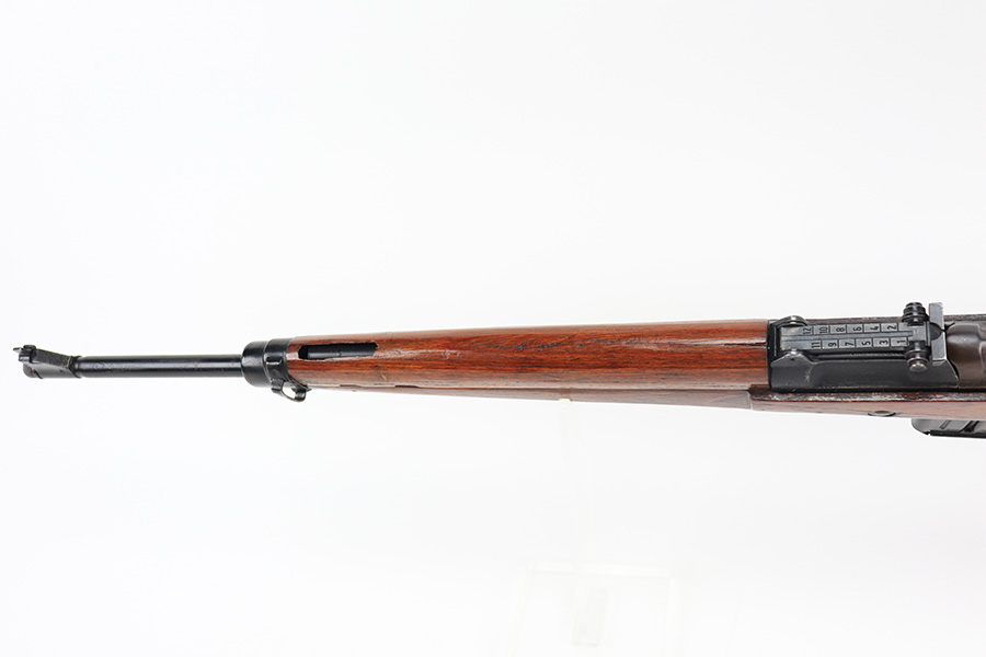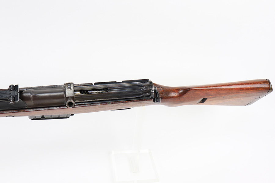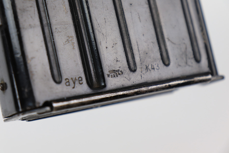 4/11/22 – This is a scarce Walther G.43 rifle from 1944. This one is all matching numbers, including receiver, bolt and stock. The serial on the stock is faint, as the stock was lightly sanded and had some lacquer applied. Interestingly, the stock was also custom modified and has a groove/depression on each side of the rifle. There is also an area milled out of the handguard. The wood is in good condition otherwise, with a few gouges on the right side but no cracks. The receiver of the rifle has excellent late-war finish but it does appear the bolt carrier was refinished. Magazine is period original and marked ‘aye’ with sharp waffenamt. It also has a couple of holes milled out on each side, not sure why, but it appears to function correctly. Bore has strong rifling but some frost and freckling through the grooves.