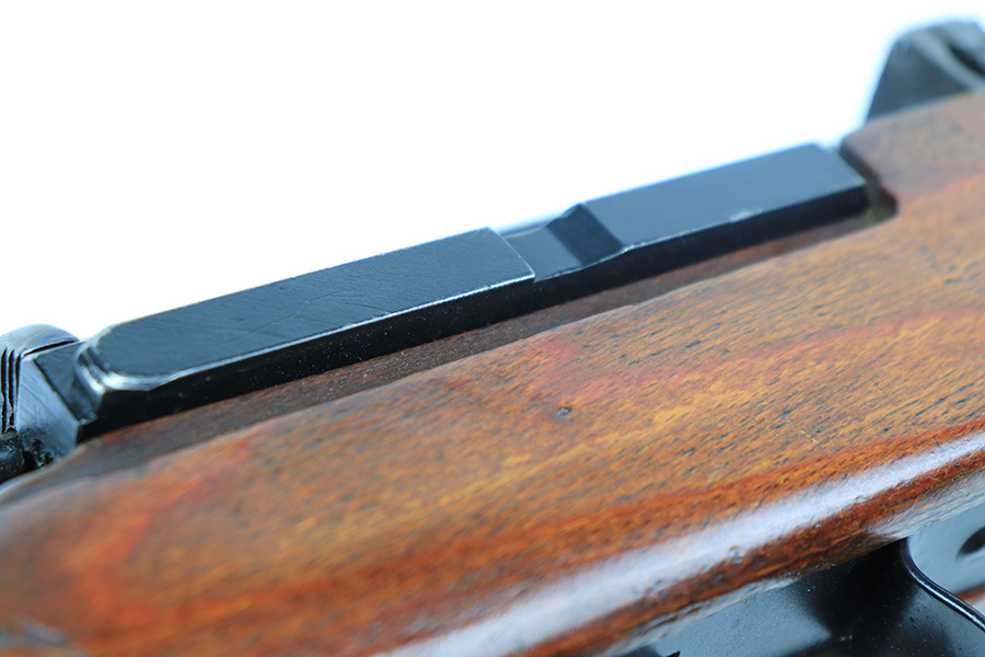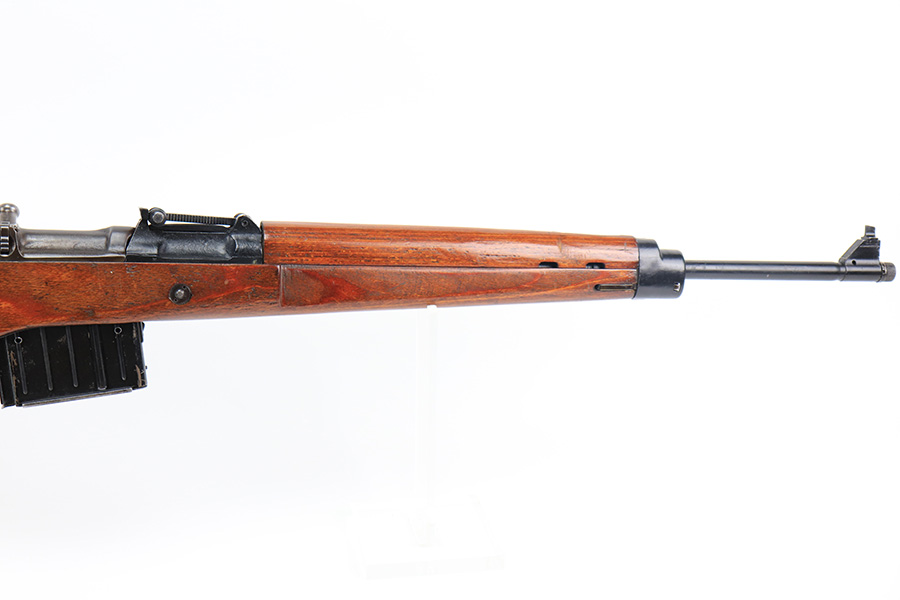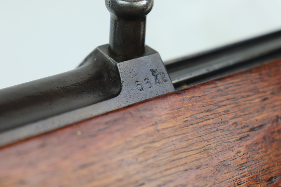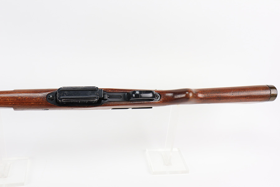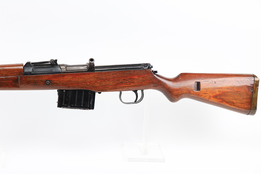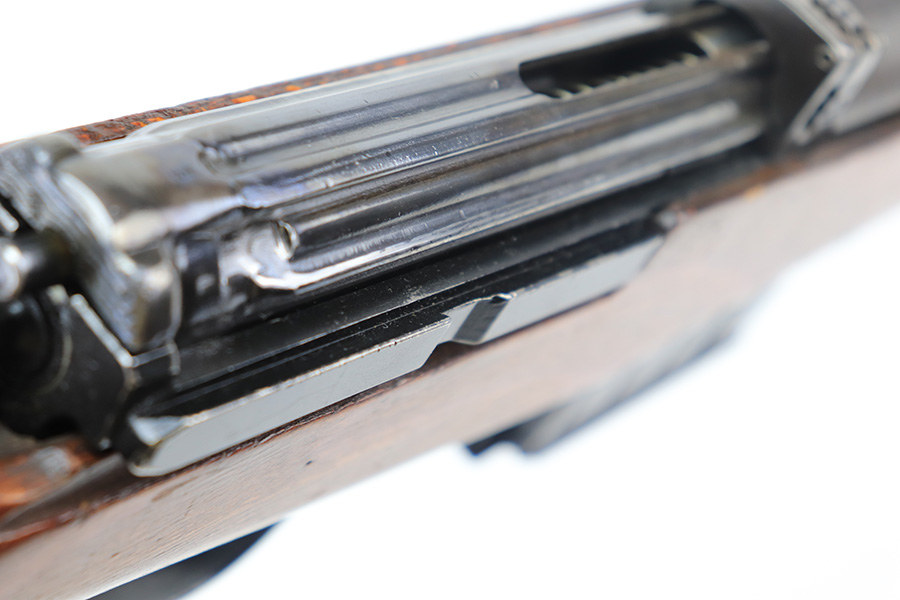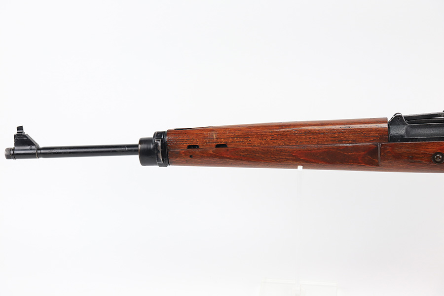 4/11/22 – This is a scarce Walther G.43 rifle from 1944. This one is all matching numbers, including receiver, bolt and stock. The serial on the stock is faint, as the stock was lightly sanded and had some lacquer applied. Interestingly, the stock was also custom modified and has a groove/depression on each side of the rifle. There is also an area milled out of the handguard. The wood is in good condition otherwise, with a few gouges on the right side but no cracks. The receiver of the rifle has excellent late-war finish but it does appear the bolt carrier was refinished. Magazine is period original and marked ‘aye’ with sharp waffenamt. It also has a couple of holes milled out on each side, not sure why, but it appears to function correctly. Bore has strong rifling but some frost and freckling through the grooves.