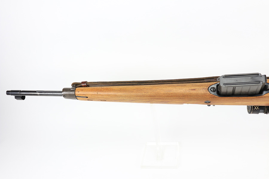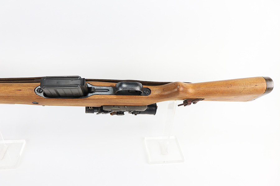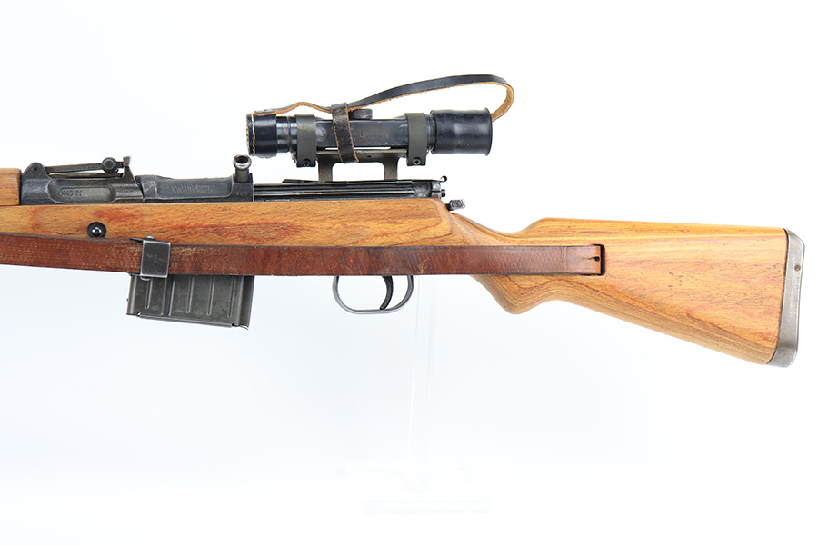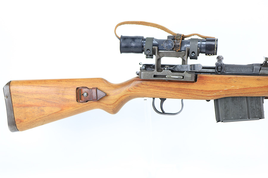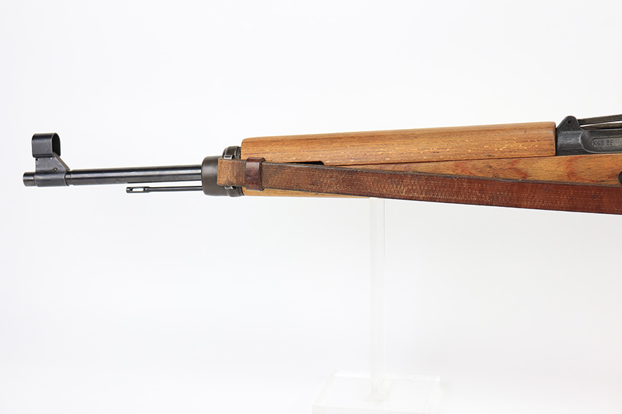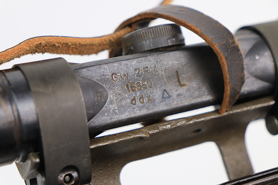 2/23/22 – This is a terrific Walther G43 sniper rifle, marked ac 44 on the receiver. All numbered parts are matching, though the stock was lightly sanded and serial is not visible anymore. Excellent finish on metal parts with minimal thinning. The rifle is all original and correct, with multiple proper waffen proofs on the stock, receiver and scope mount. The stock waffenamts are also faint though due to sanding. Rifle has proper cleaning rod and site hood present, spare firing pin and an original sling. Original magazine is K43 marked with maker ‘gcb’ but appears refinished. The mount has Walther WaA359 proofs. Scope is WW2 original, with crystal clear optics. It’s a rare Luftwaffe example with large ‘L’ on the side. Marked Gw ZF4, then ddx. Excellent bore.