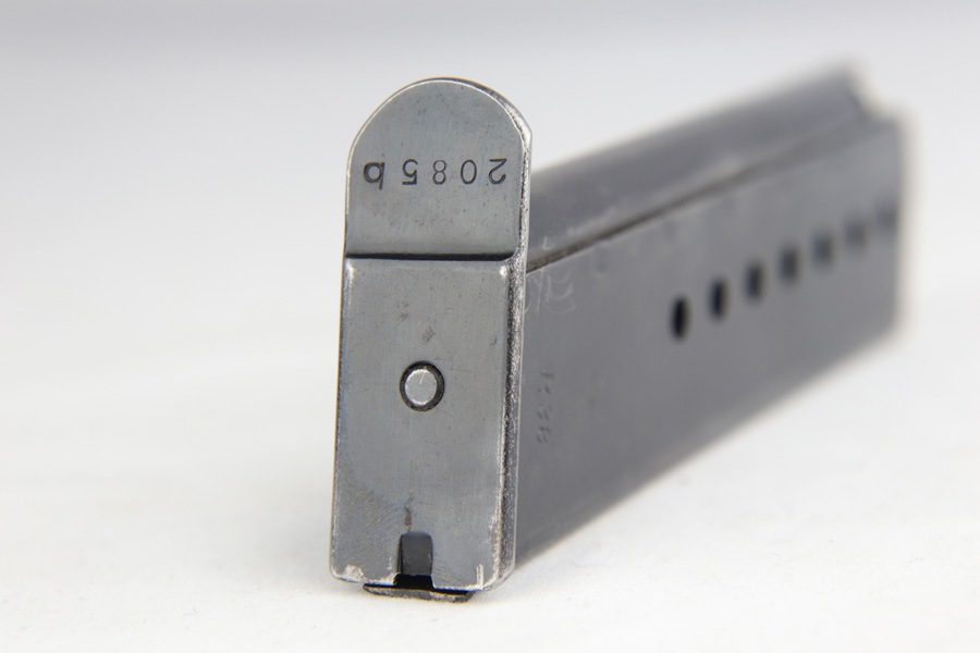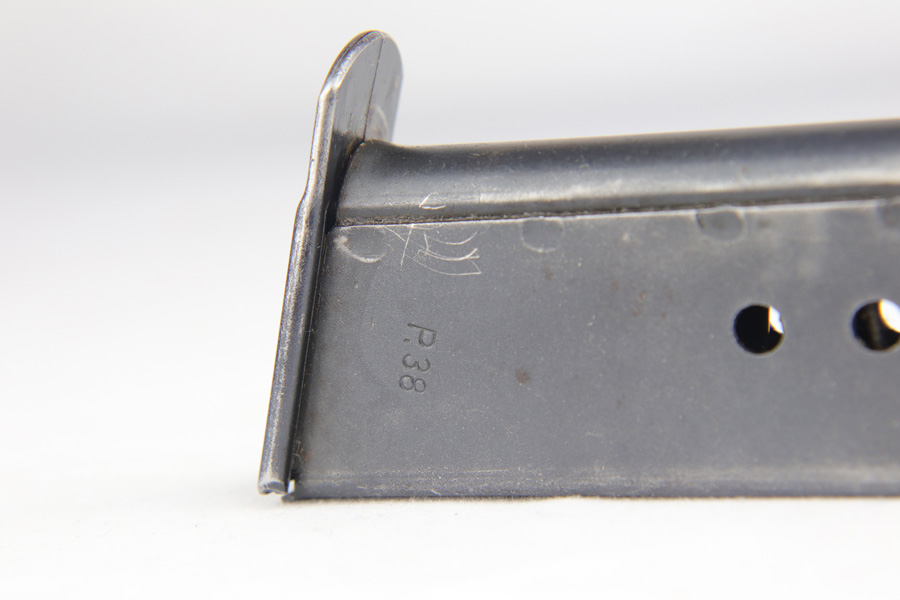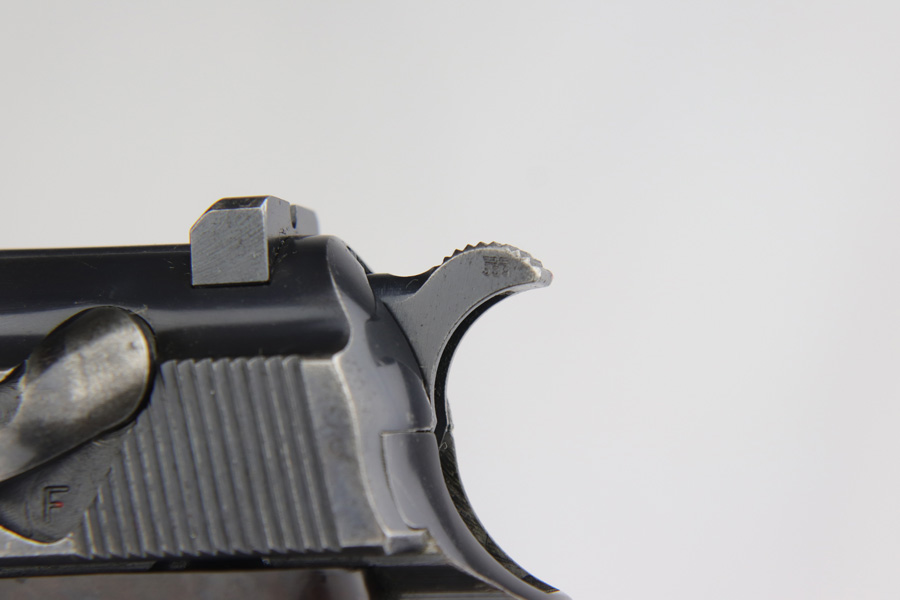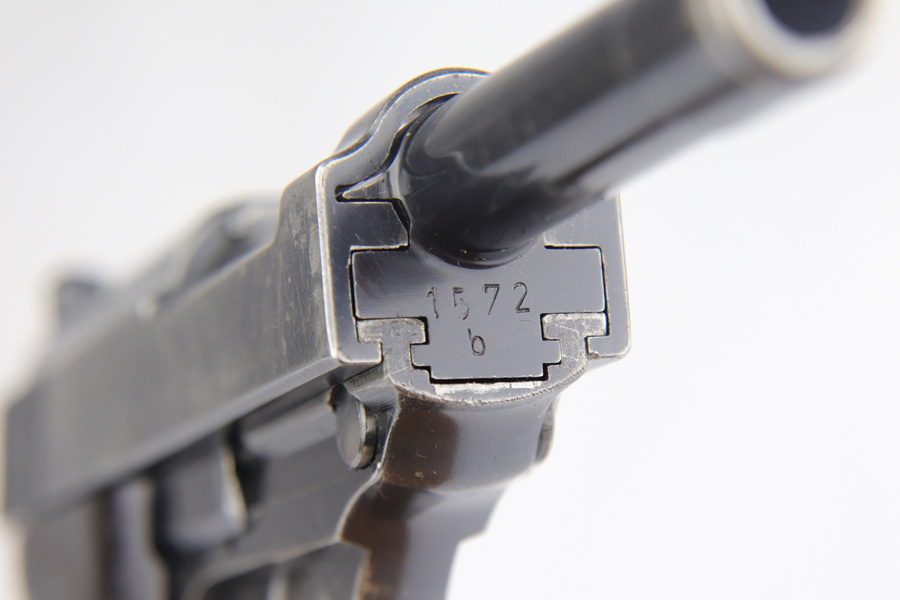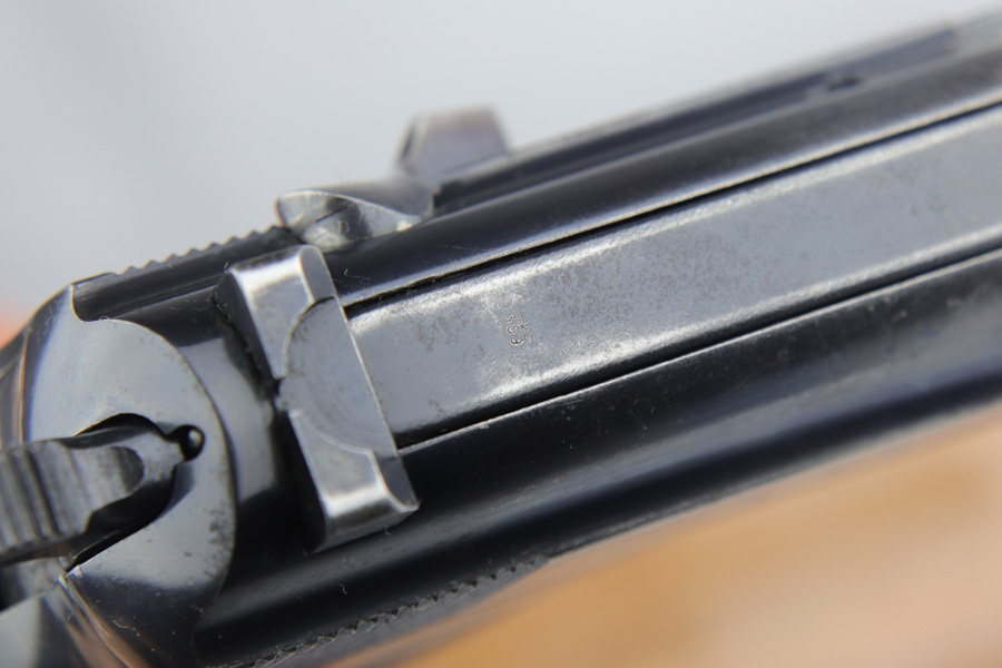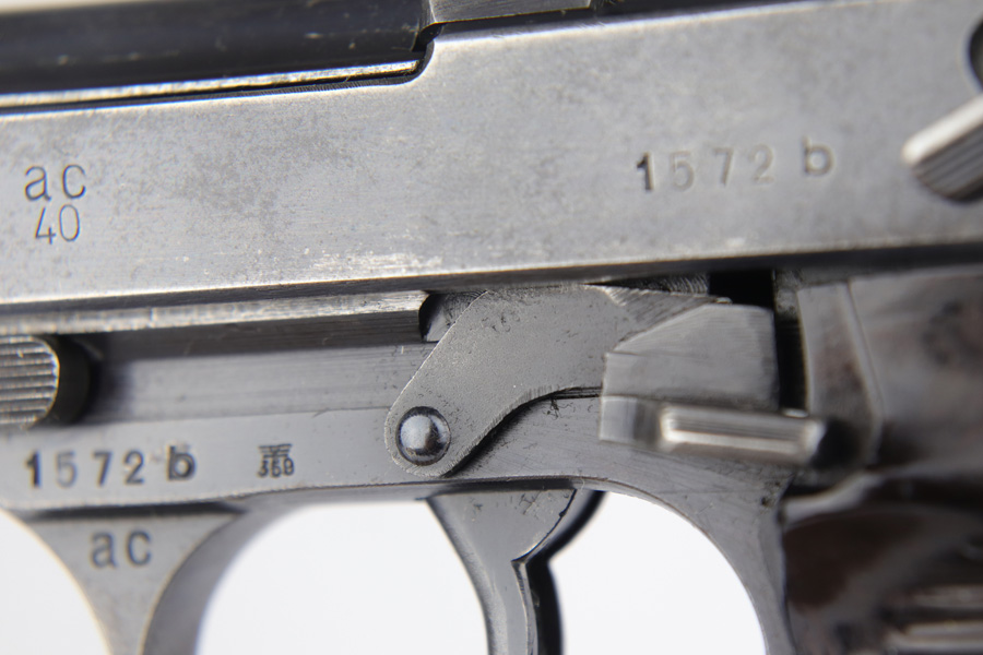 1/30/19 – This is a scarce Walther P.38, marked ac 40 on slide, one of only ~12,000 produced. This is a lower production total than early zero series Walthers or first-year production Mauser byf 42’s. The original finish on this one rates at about 80%, with the majority of thinning on the front strap and the right side of the slide. The pistol is all matching aside from the magazine, which is numbered to a different pistol but just a few hundred digits off and in the proper serial block. The grips are waffen proofed and matching numbered to the gun. Excellent bore. De-cocker is functioning properly.