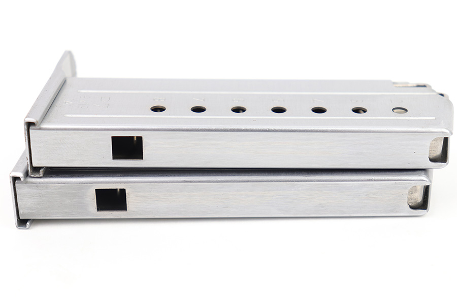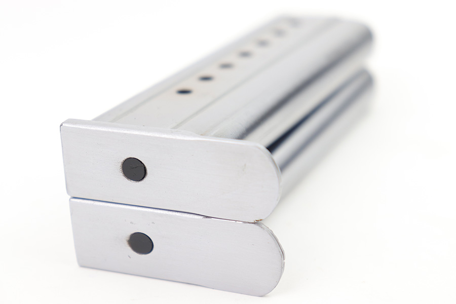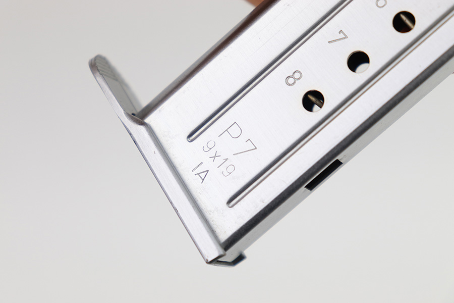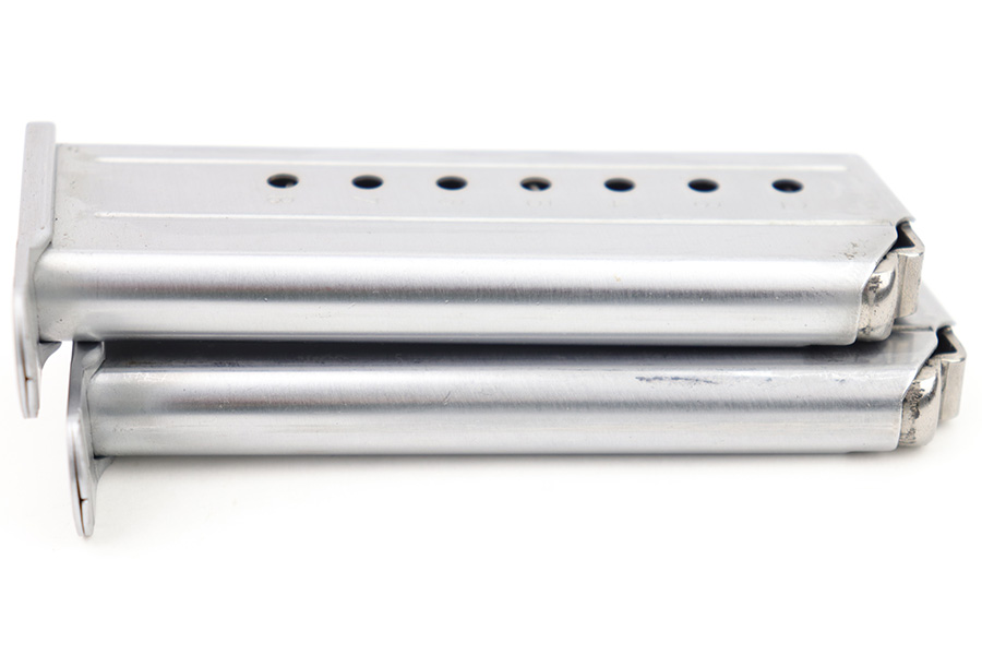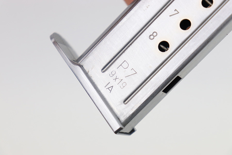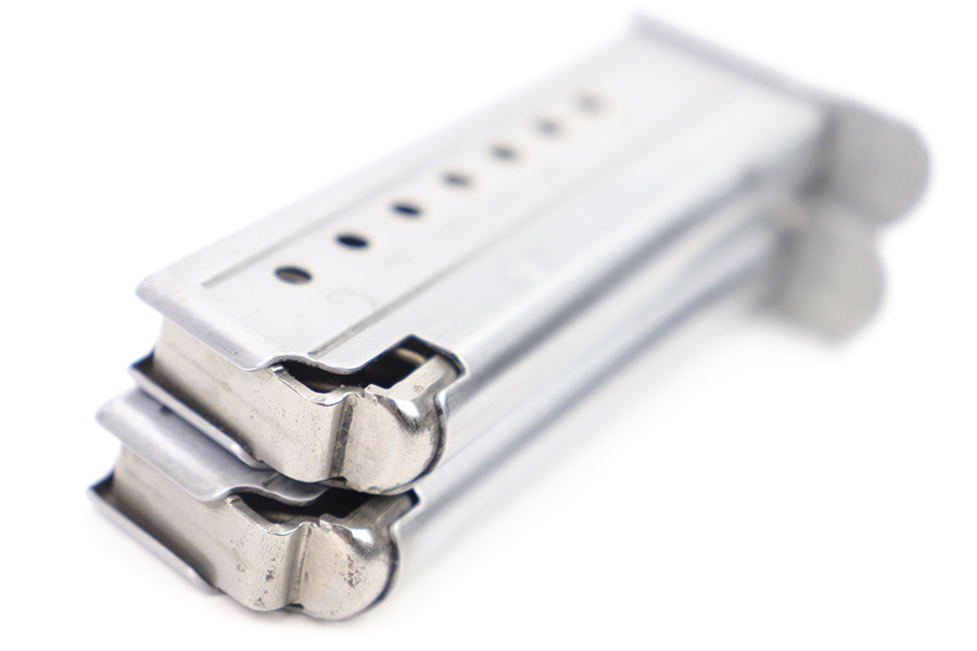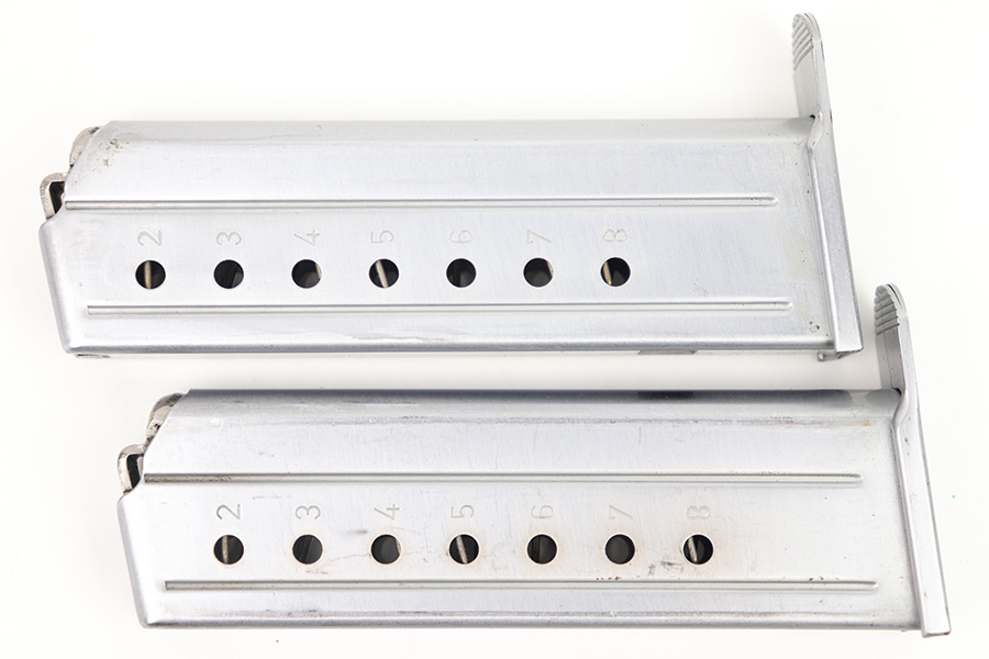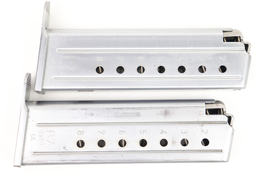 3/8/23 – Price is for BOTH magazines. These are 9mm H&K P7 pistol magazines in nickel. The nickel finish is more desirable and is excellent throughout both magazines with some mild surface patina. Strong, functional springs.