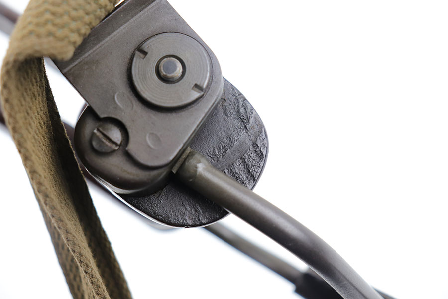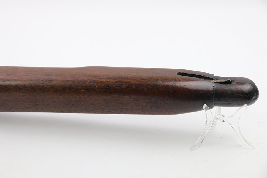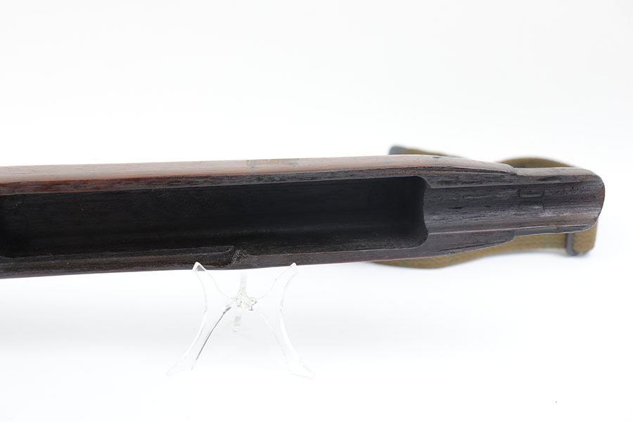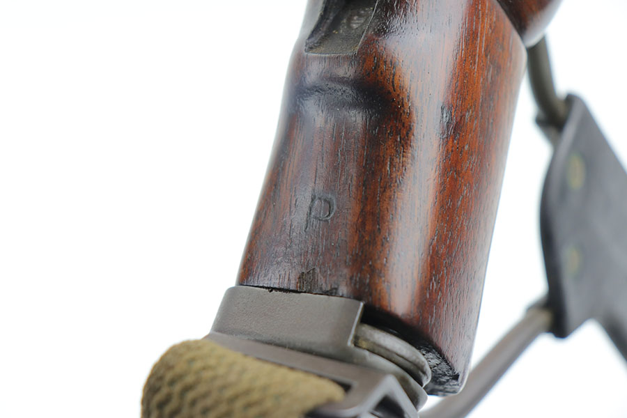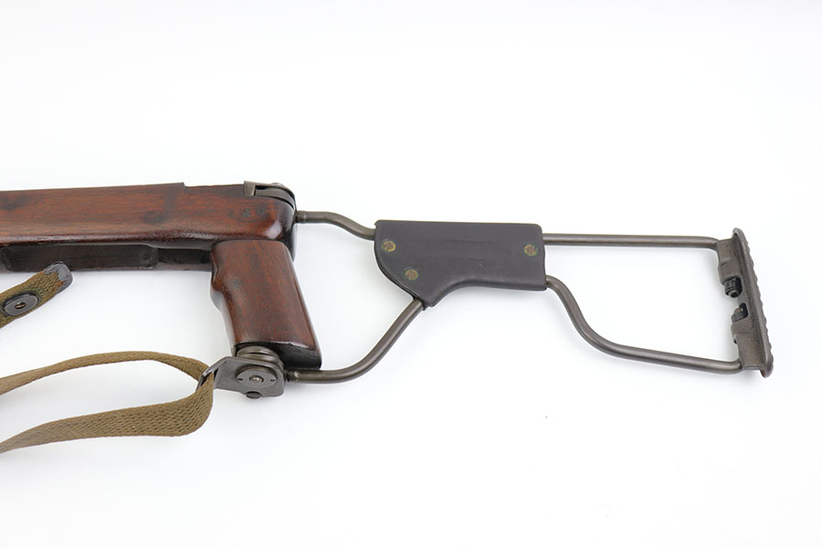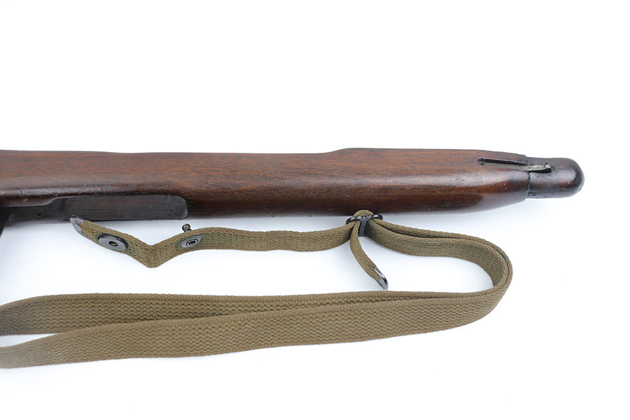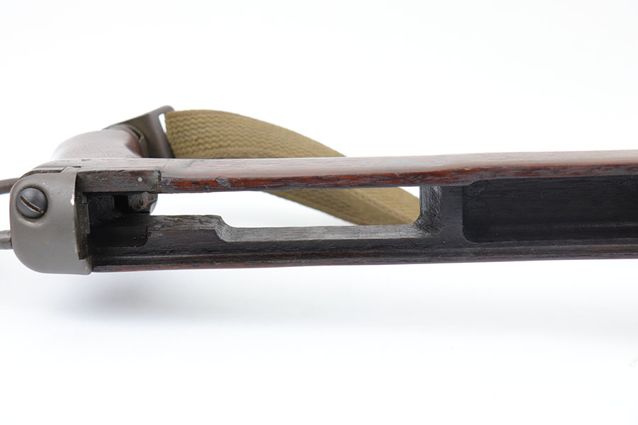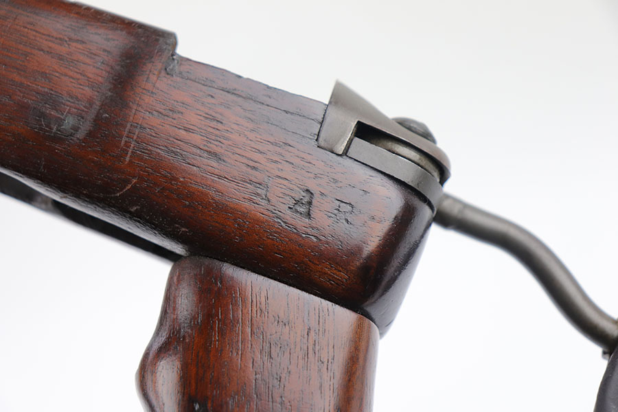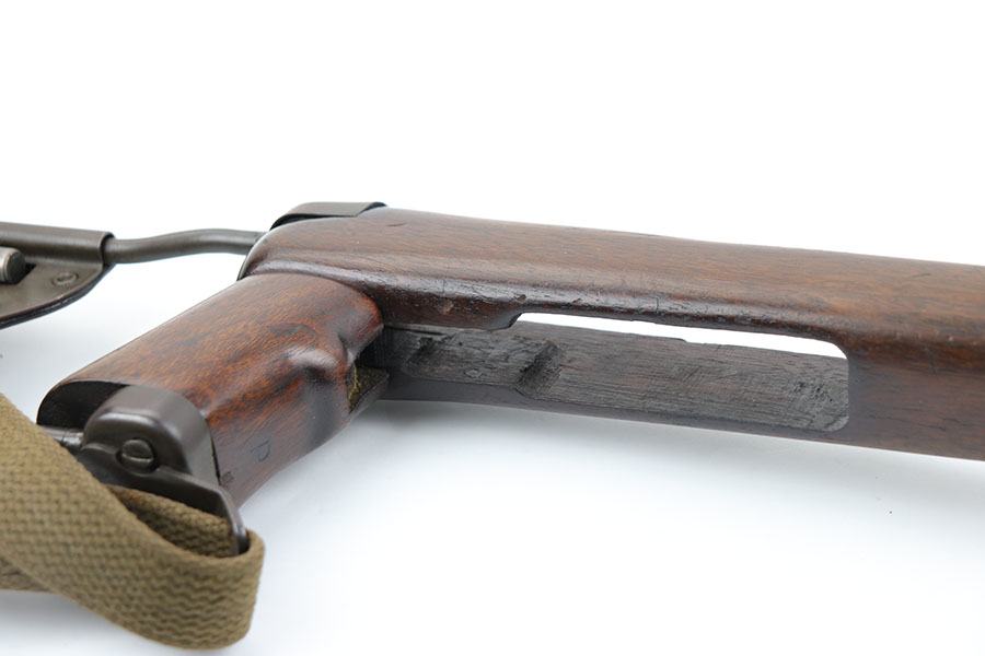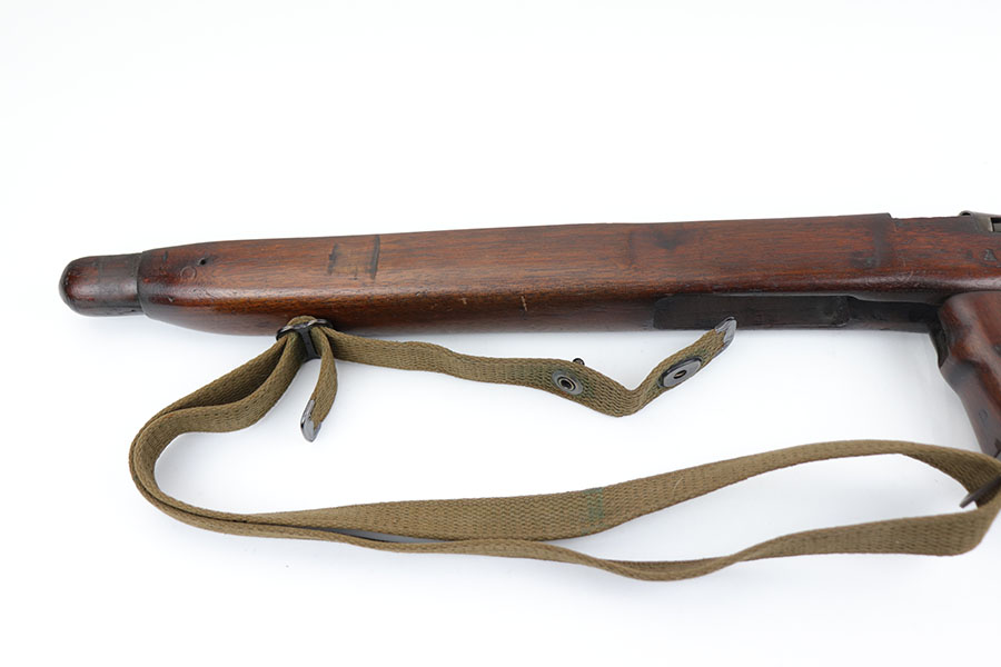3/10/20 – This is a scarce M1-A1 Paratrooper carbine stock that was likely re-worked for the Korean War. Early low wood with no pot belly. Excellent wood condition with the standard indents on the left side that result from the stock being folded into it. Comes with original folding stock and cheekpad. Pistol grip has the World War II crossed cannons cartouche on it. Left side has an arsenal proof (AAR). Comes with original, early sling.