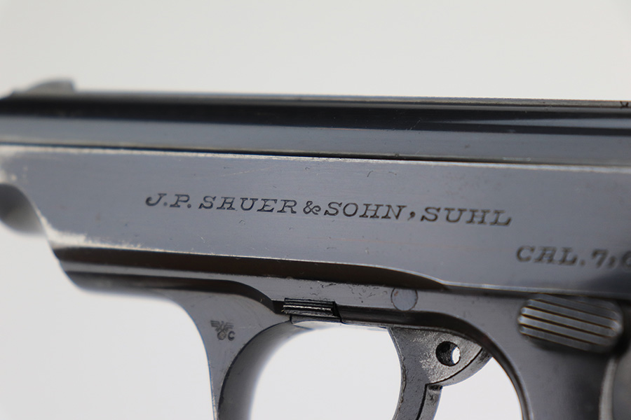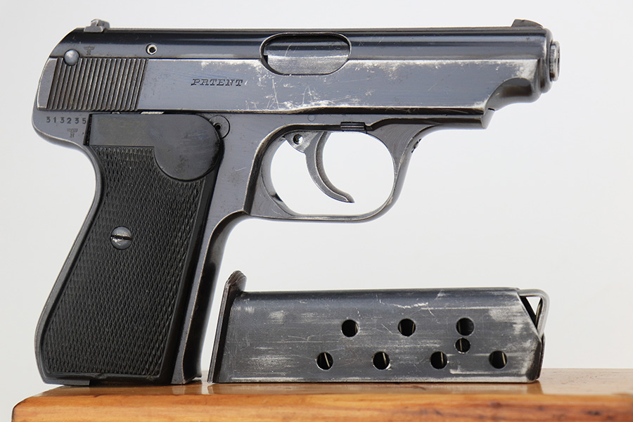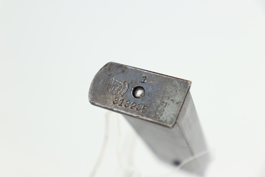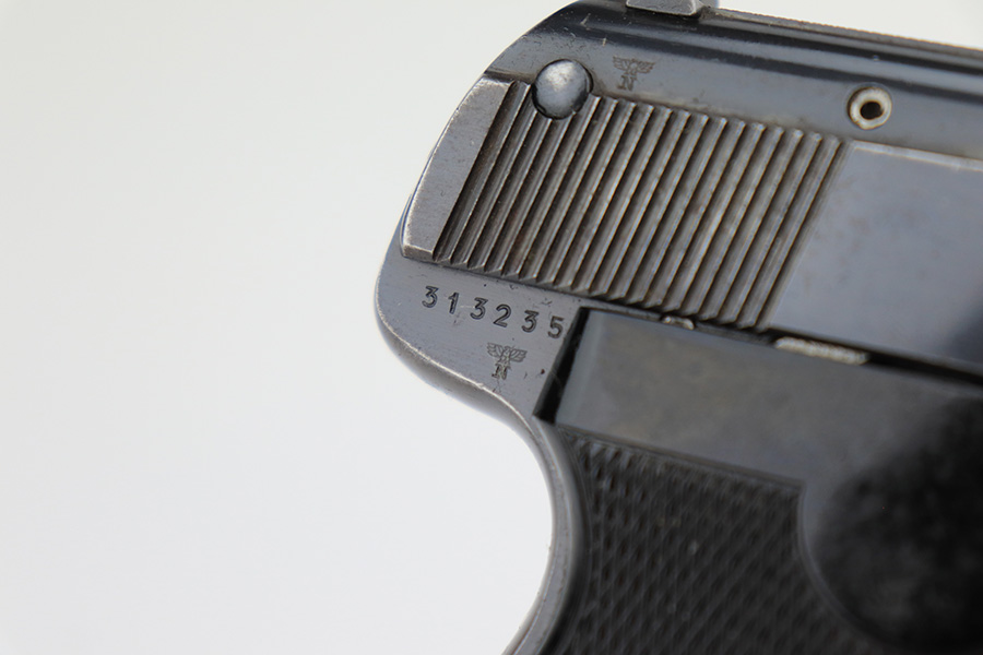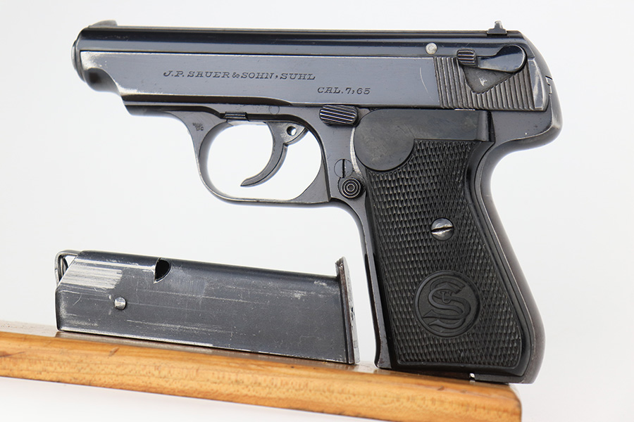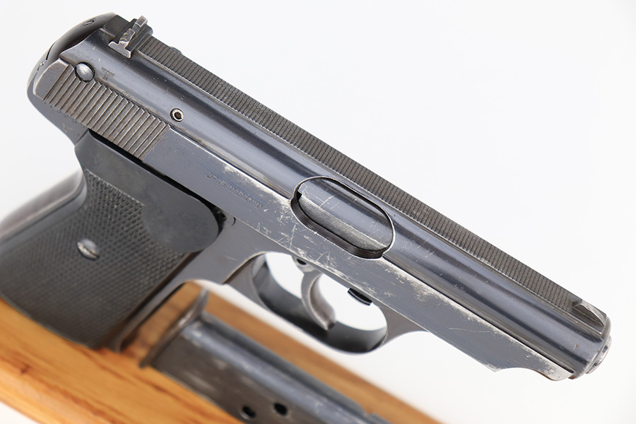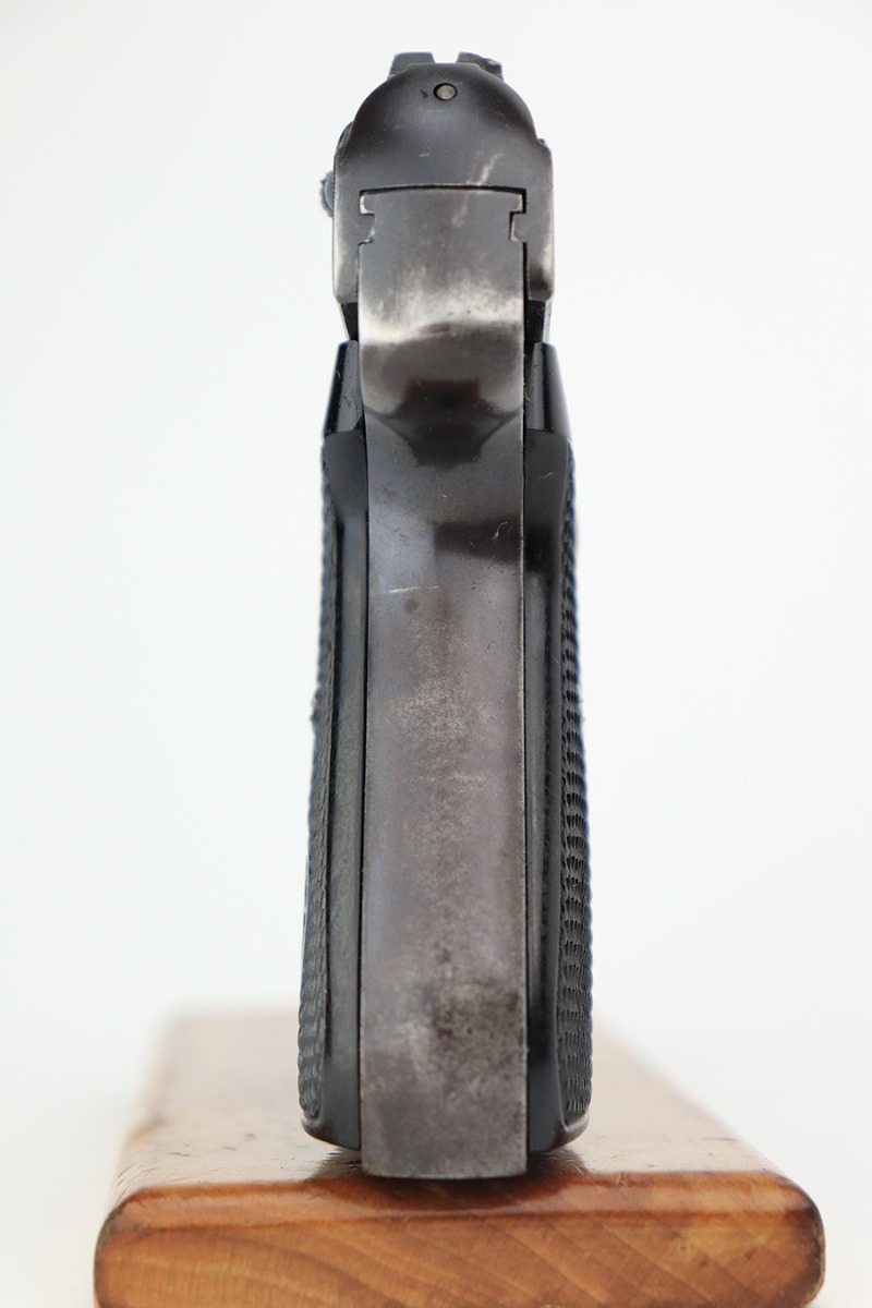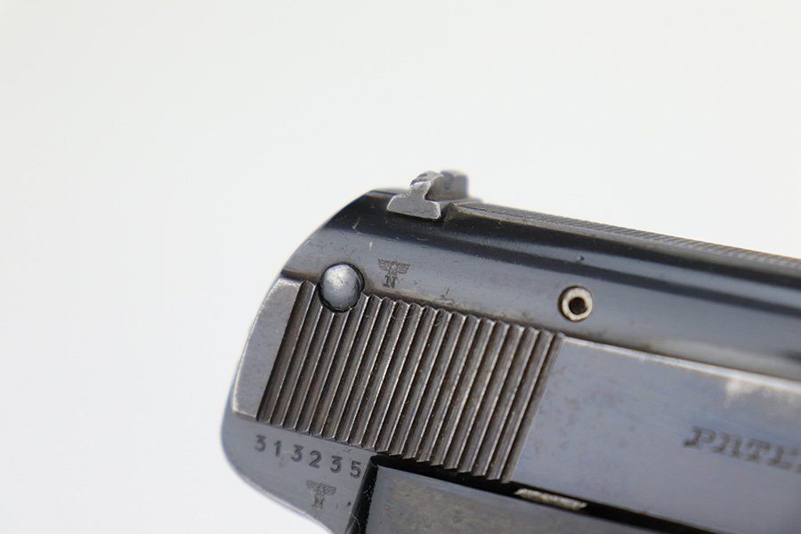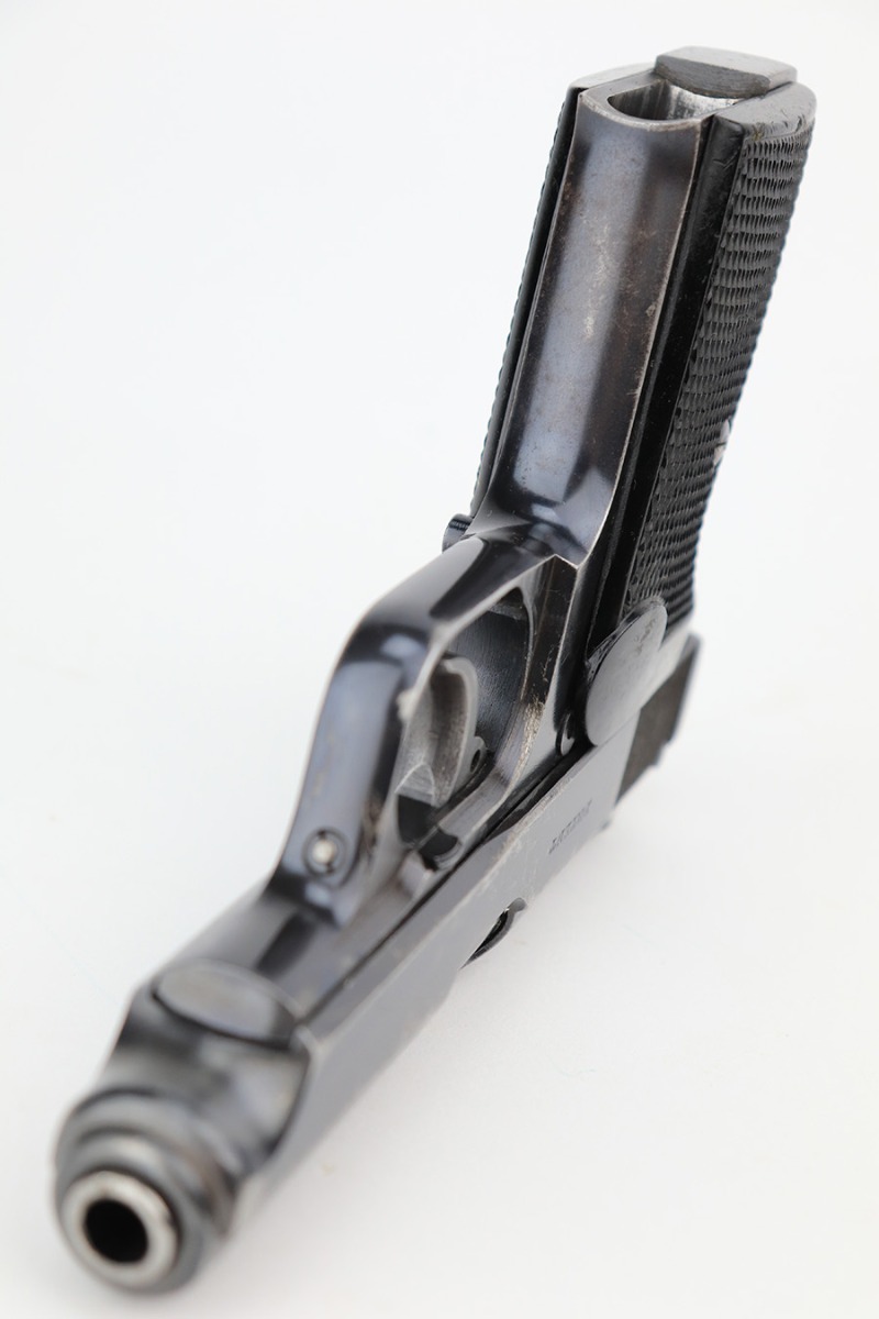 4/7/23 – This is a fairly rare and early Sauer 38h with high-polish finish and police Eagle/C acceptance proof. This one is matching and comes with an original matching police arsenal-numbered magazine. The gun itself has retained about 90% of its original high polish finish. The majority of the finish loss comes in the form of spotty wear and some light scratches along the right side of the slide. There is also minor muzzle wear and some minor thinning with freckling on the front strap. Excellent period-correct black bakelite grips. Minty bore.
