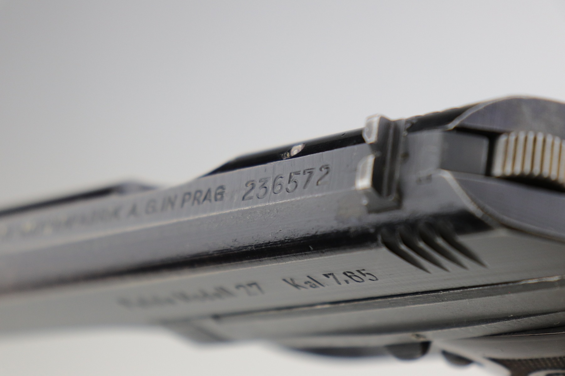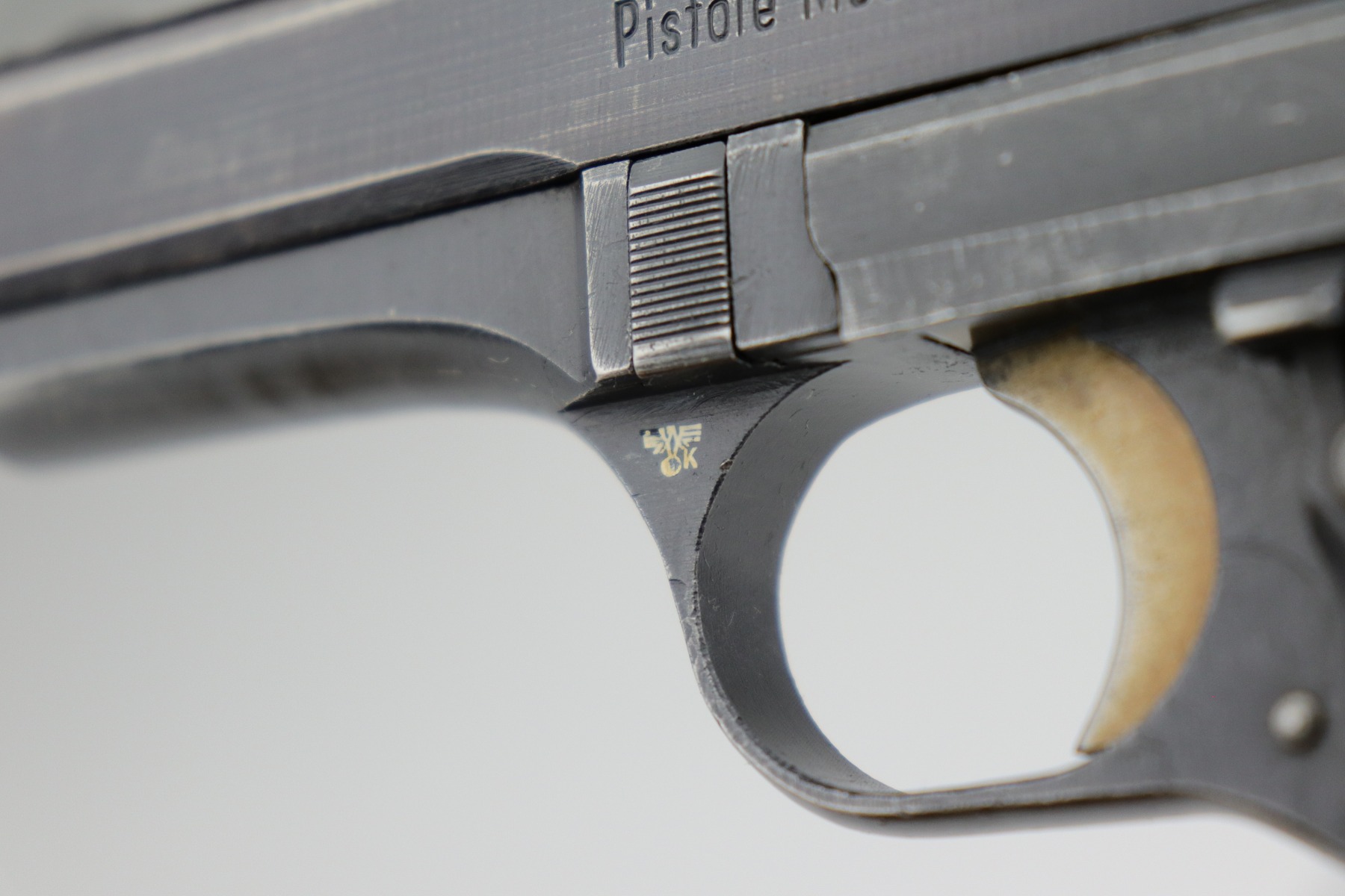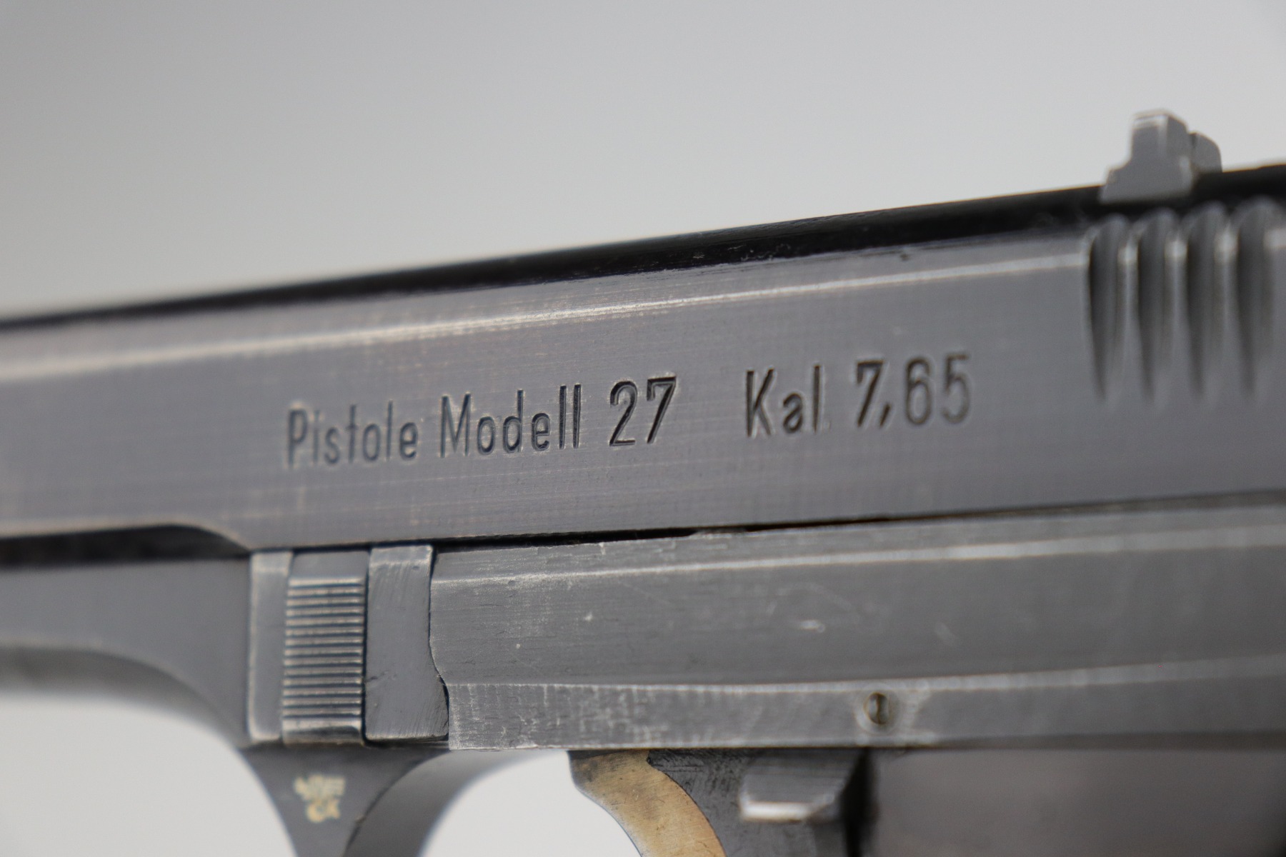 1/5/21 – This is an excellent example of a CZ 27 that was issued to the Nazi police force during WW2. This one has a scarce “Eagle K” marking. This variation is scarce as only about 5,500 of these guns were produced. This one is all correct and in excellent condition. It has retained about 96% of its original finish. There is minor thinning on the front strap and along the slide. There is also minor wear on the high edges of the slide. It has a nice grip with small chips in the bottom corners. It comes with an original matching magazine. The bore is near-mint.