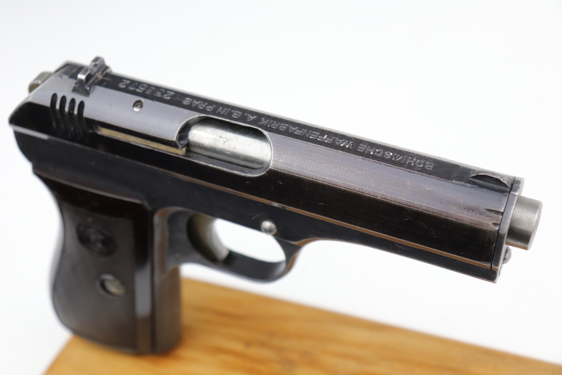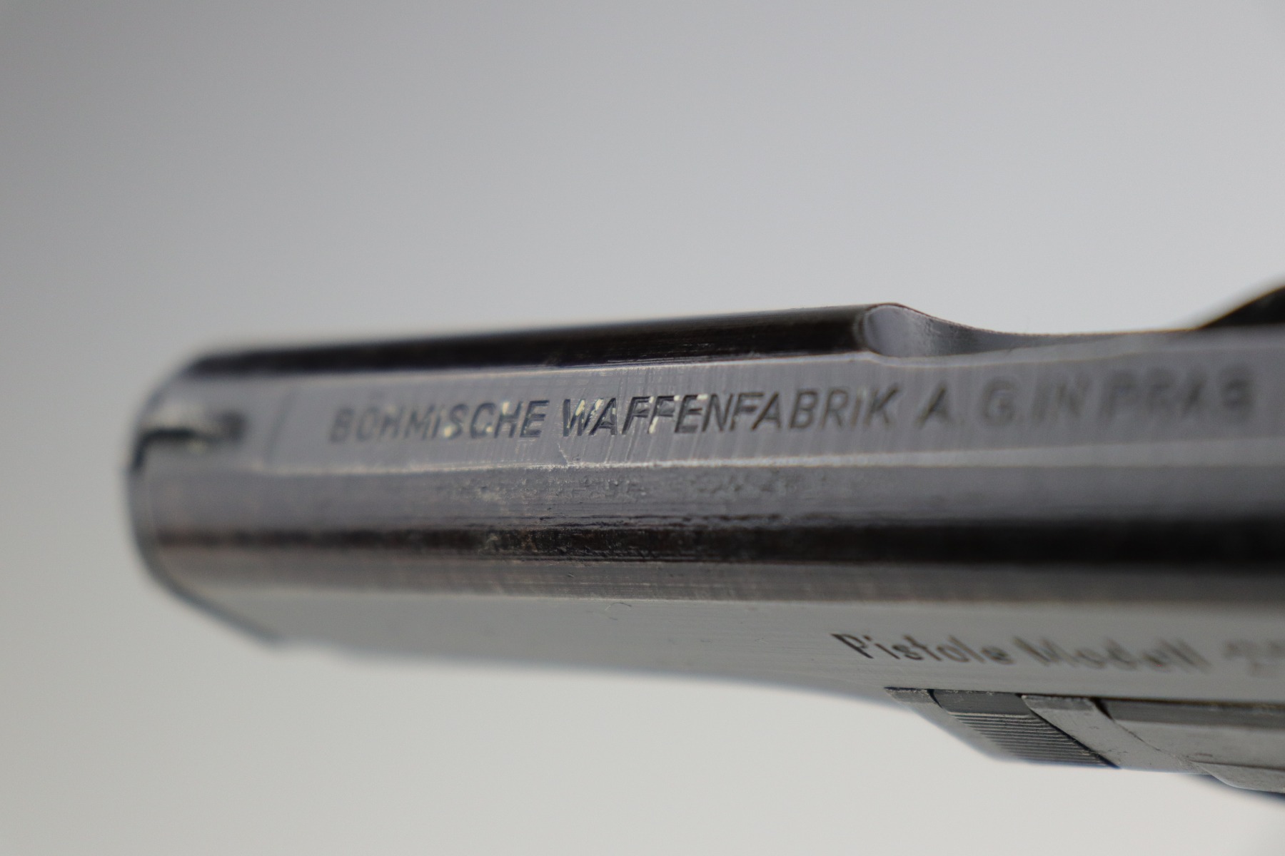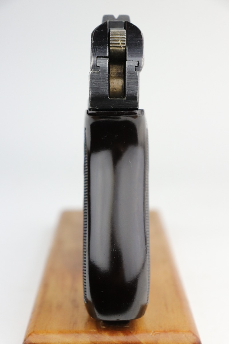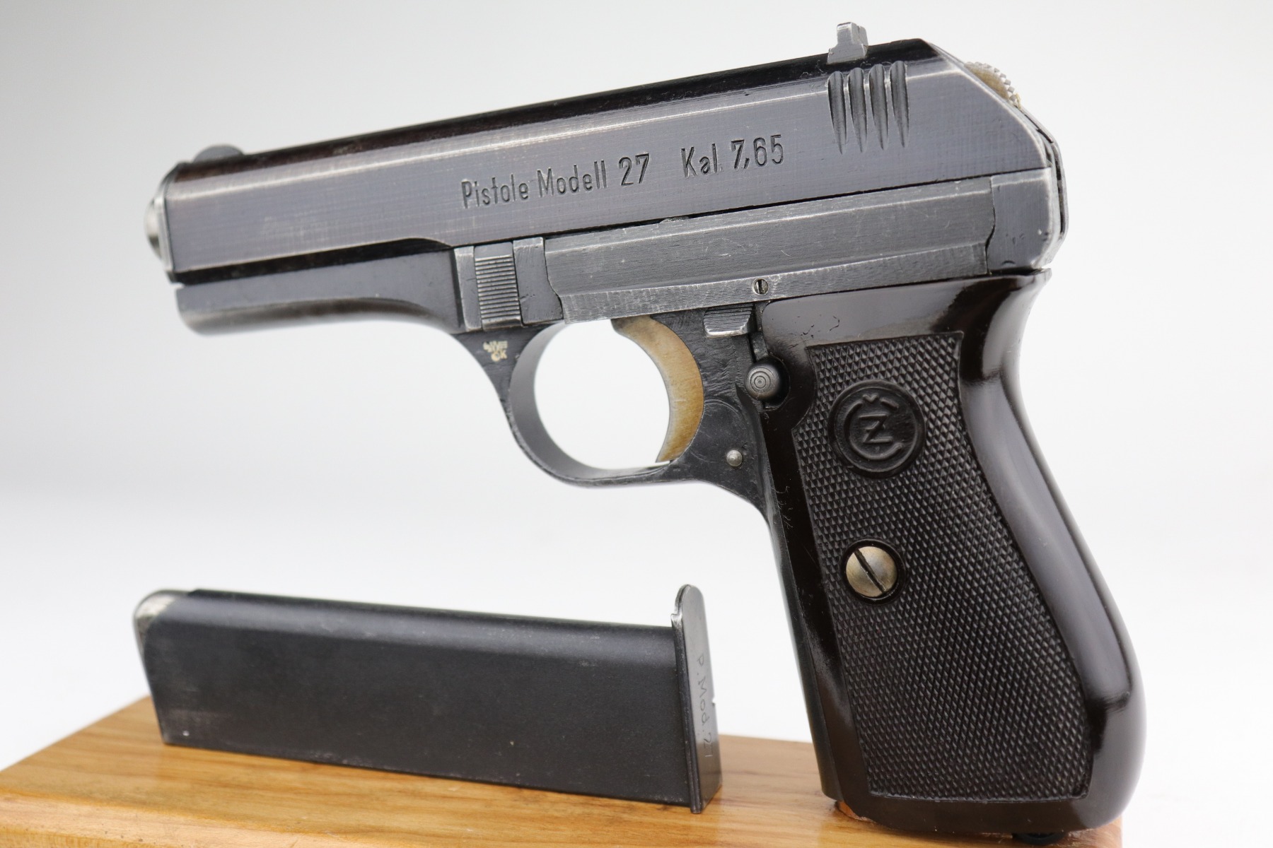 1/5/21 – This is an excellent example of a CZ 27 that was issued to the Nazi police force during WW2. This one has a scarce “Eagle K” marking. This variation is scarce as only about 5,500 of these guns were produced. This one is all correct and in excellent condition. It has retained about 96% of its original finish. There is minor thinning on the front strap and along the slide. There is also minor wear on the high edges of the slide. It has a nice grip with small chips in the bottom corners. It comes with an original matching magazine. The bore is near-mint.