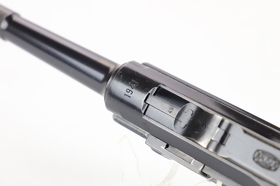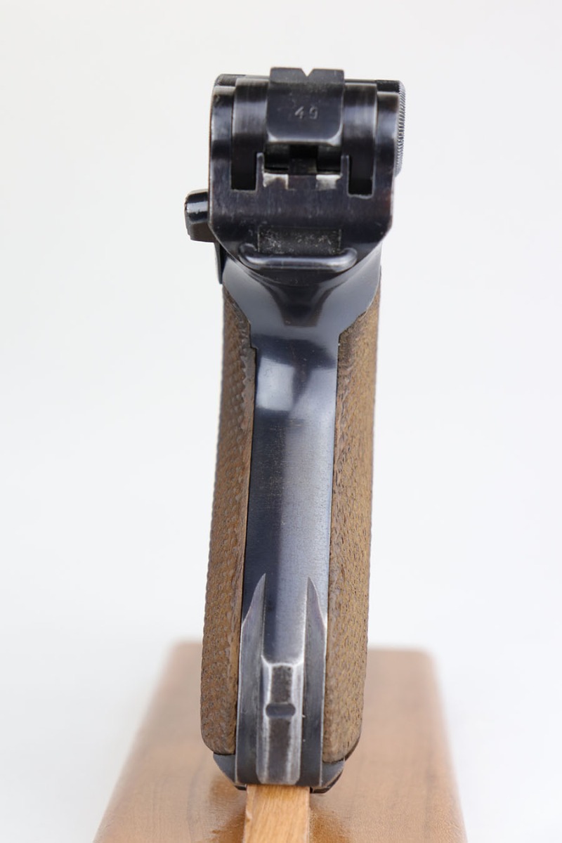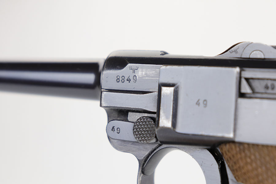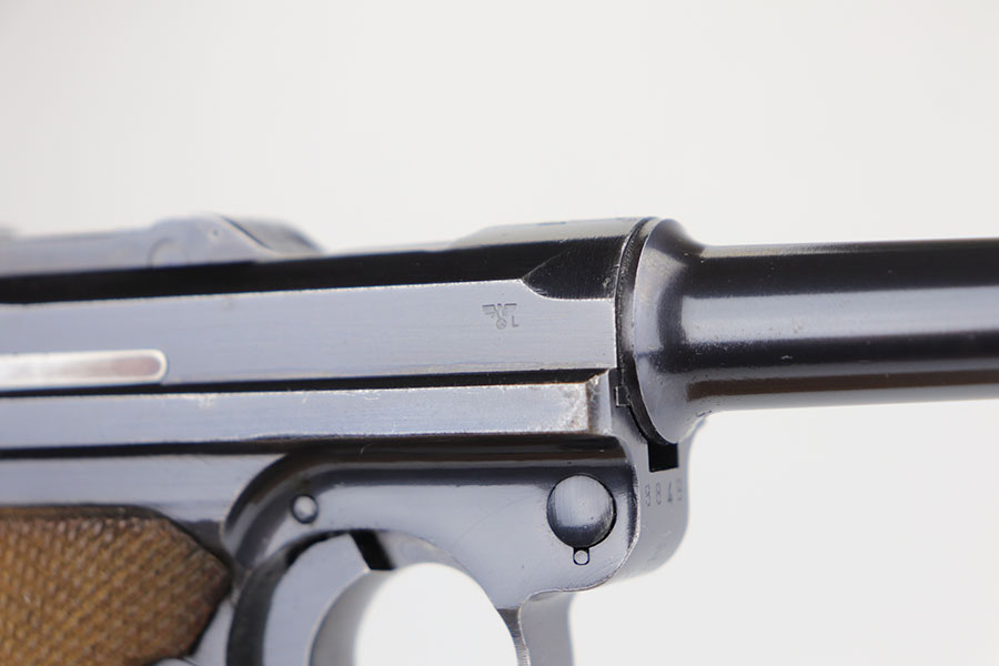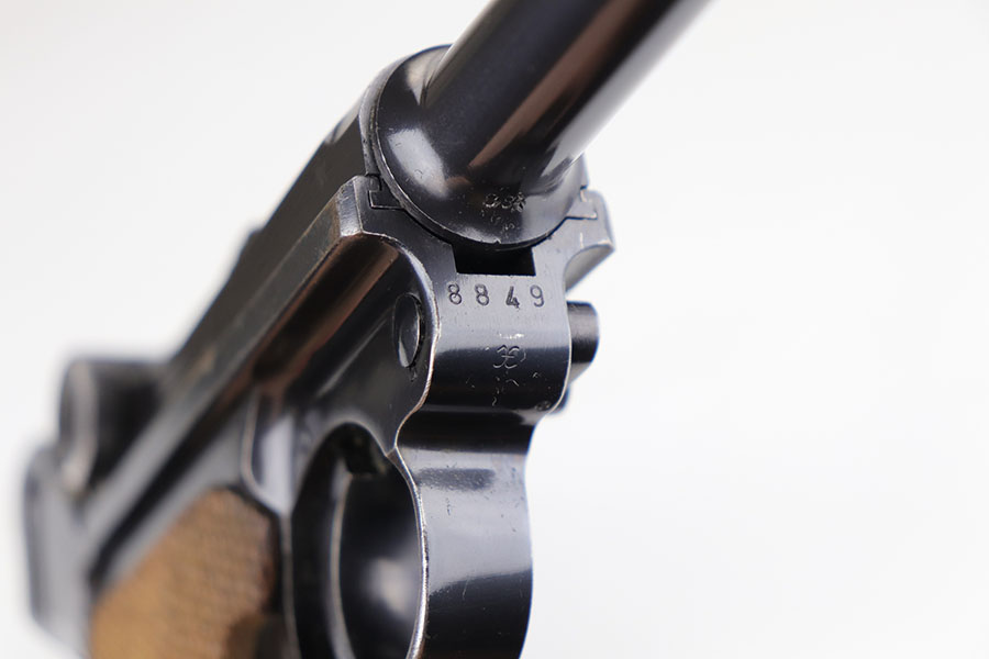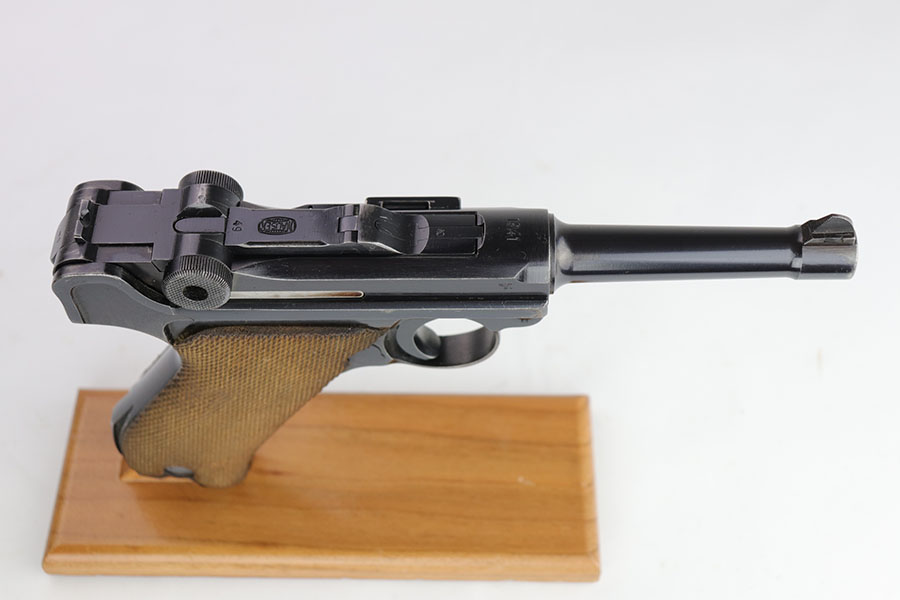 4/10/20 – This is a very nice example of a rare Police Mauser Luger from 1941. There were only about 19,000 Lugers produced with Police Eagle/L proof on receiver, and only about 6,500 in 1941. The pistol is all matching with minor finish loss on sideplate, muzzle, and bottom of the front strap. Mint bore and excellent grips. The grips are unnumbered and marked E/655. Comes with scarce unnumbered ‘fxo’ mag.
