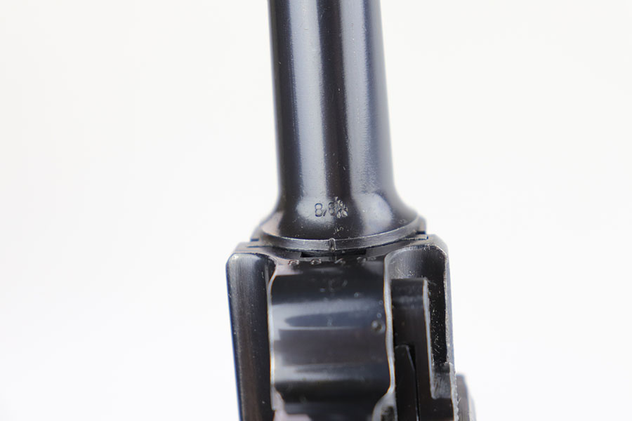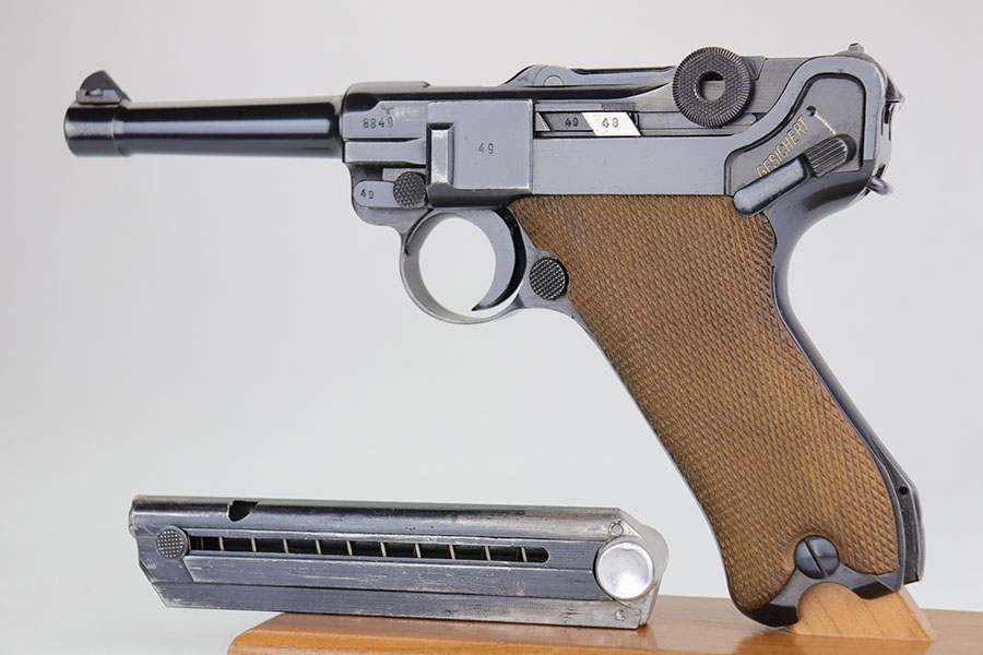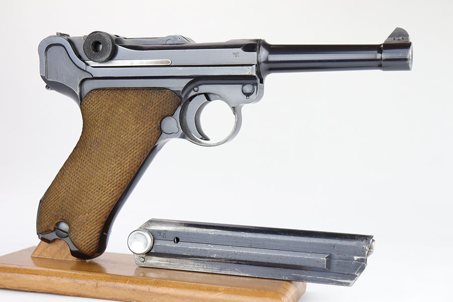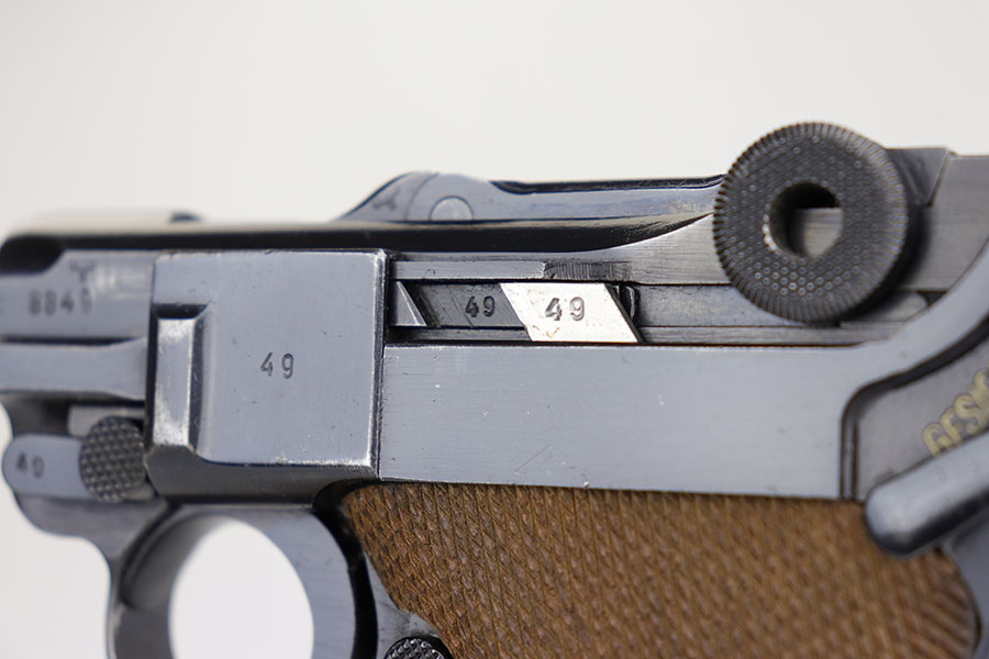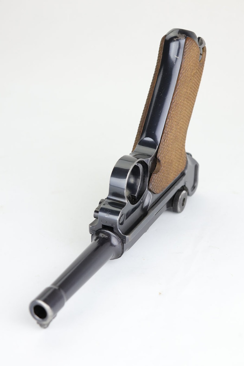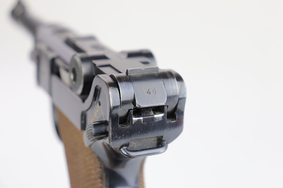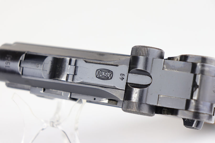 4/10/20 – This is a very nice example of a rare Police Mauser Luger from 1941. There were only about 19,000 Lugers produced with Police Eagle/L proof on receiver, and only about 6,500 in 1941. The pistol is all matching with minor finish loss on sideplate, muzzle, and bottom of the front strap. Mint bore and excellent grips. The grips are unnumbered and marked E/655. Comes with scarce unnumbered ‘fxo’ mag.