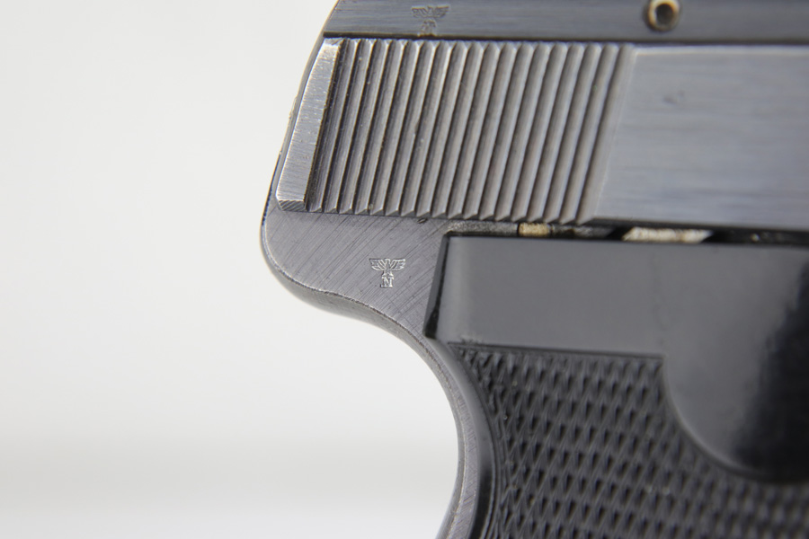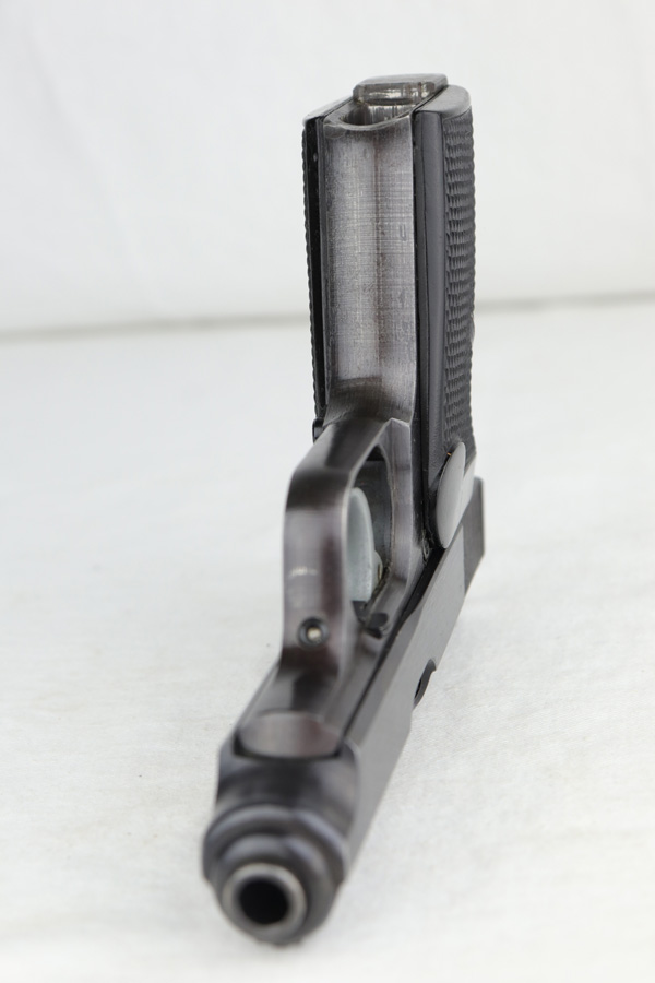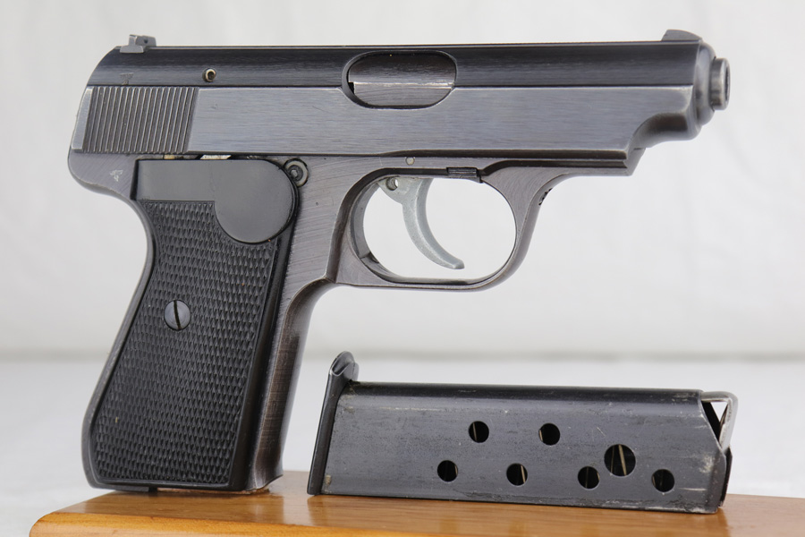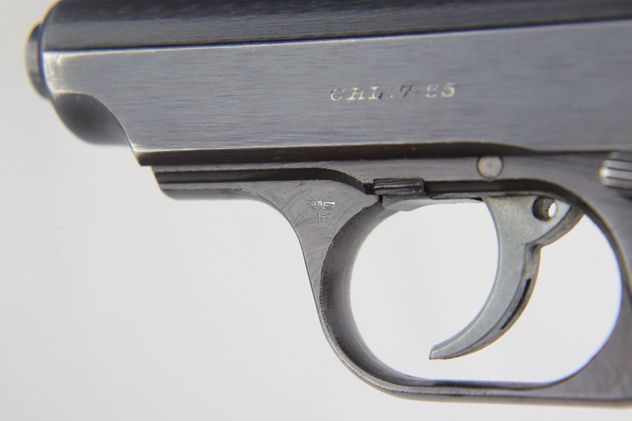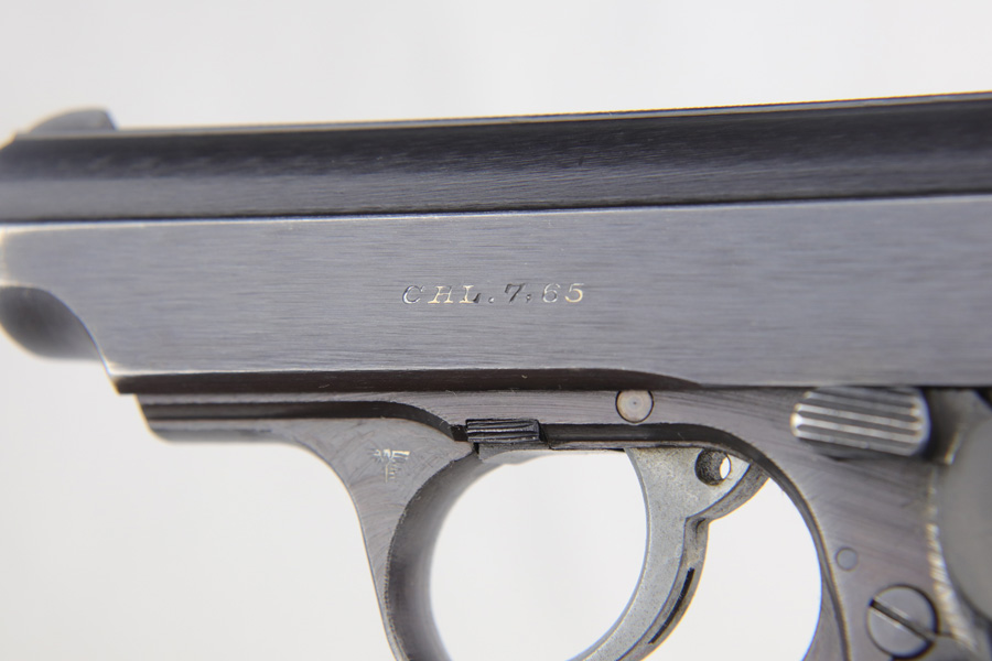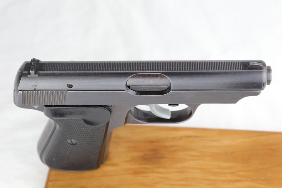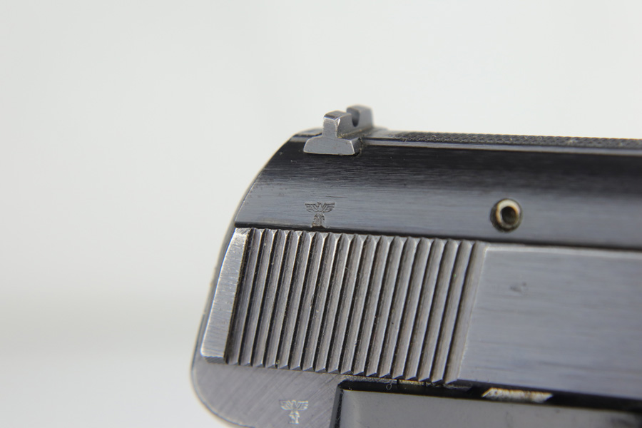 1/24/19 – With only 7,500 produced, this is the scarcest Police Sauer 38h variation. It is Eagle/F marked on trigger guard and all matching and original. The military style blue rates at 95-96% with basic muzzle and high edge thinning, but majority of finish loss seen as minor thinning of the straps. Minty bore. Half-moon mag.