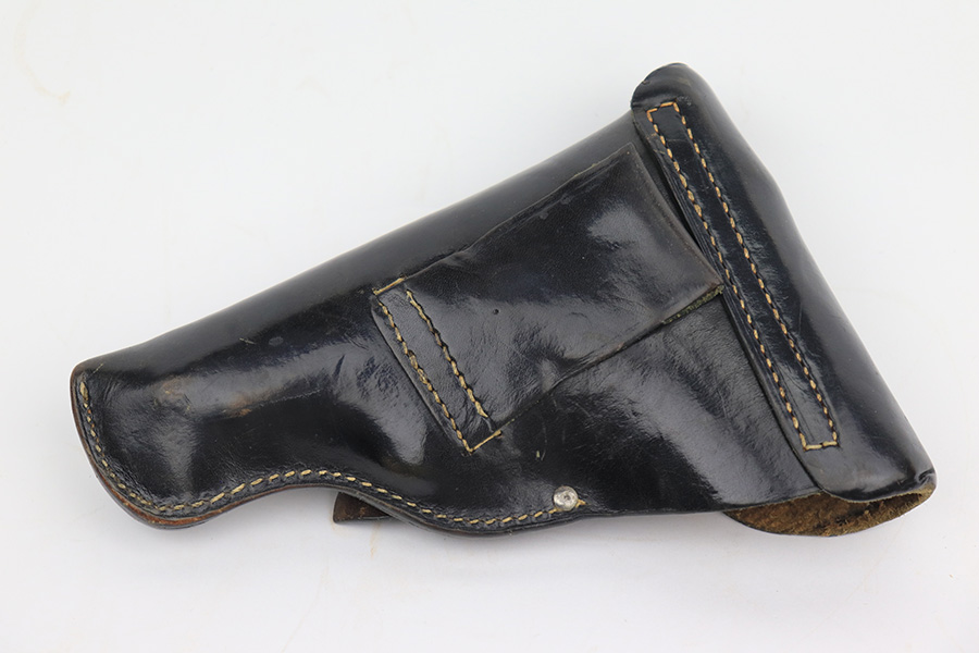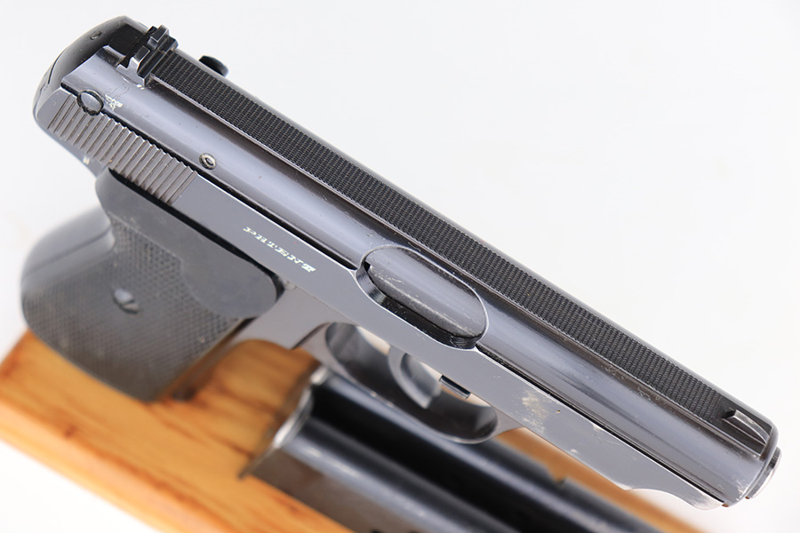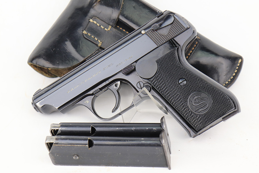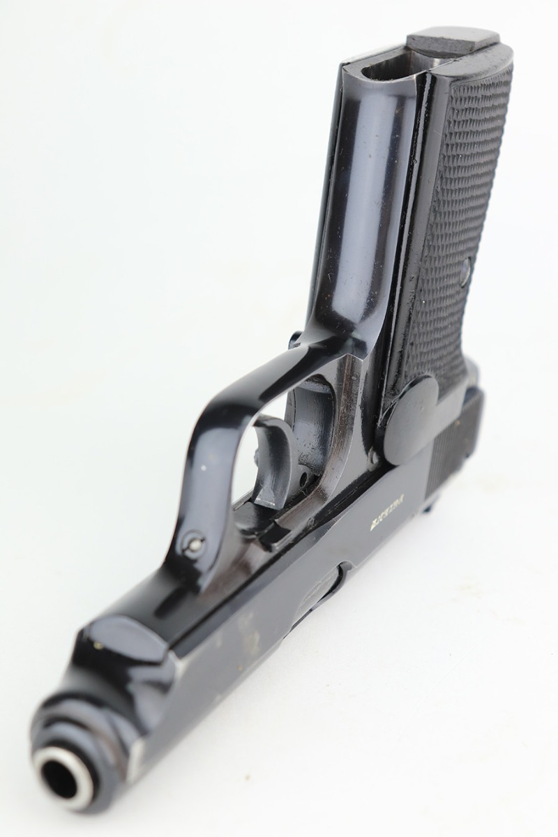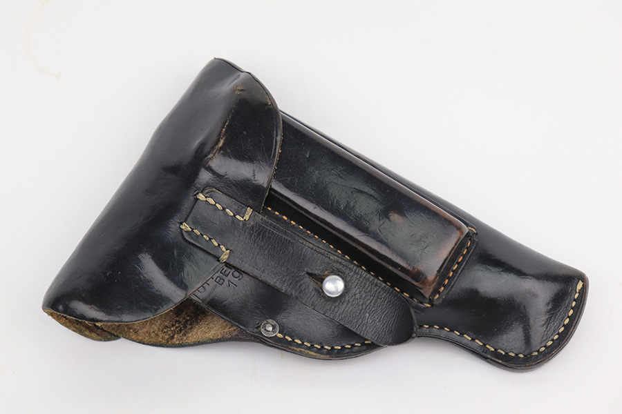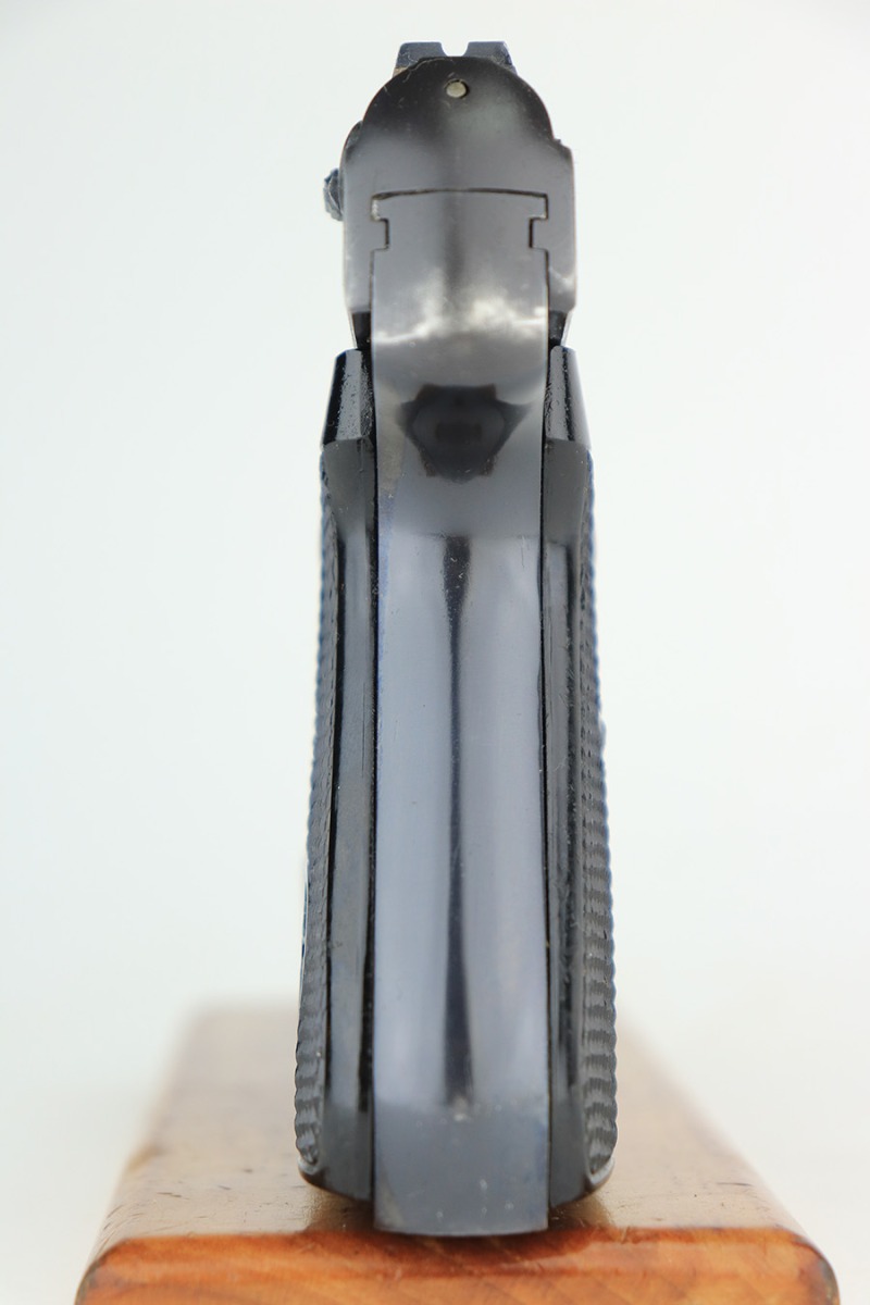 3/16/23 – This is a fairly rare and early Sauer 38h with high-polish finish and police Eagle/C acceptance proof. This one is matching and comes as a rig with a very nice 19141-dated black leather police holster and two period-correct but un-numbered magazines. The gun itself has retained about 96-97% of its original high polish finish with very minor muzzle wear and a spot of wear on the right side of the slide. Very minor wear on the tang. Excellent period-correct black bakelite grips. Mint bore.