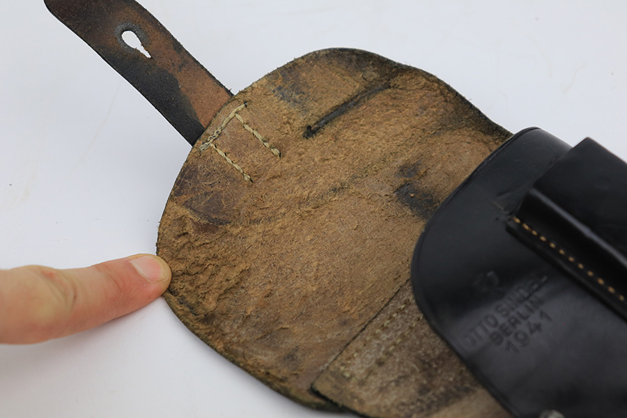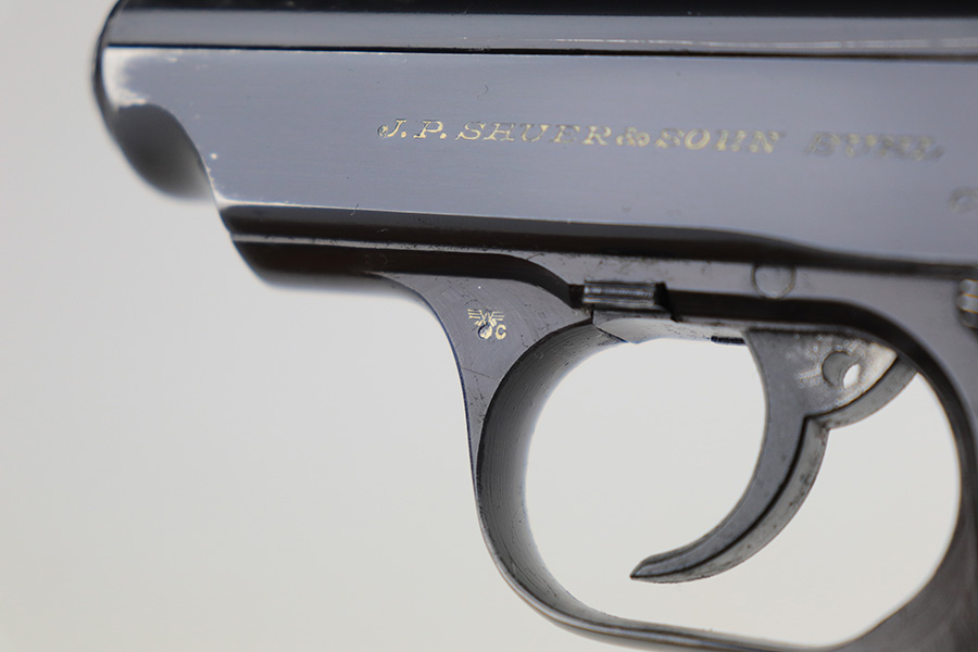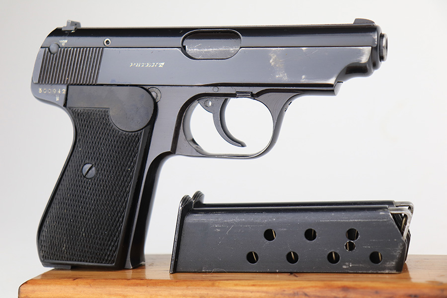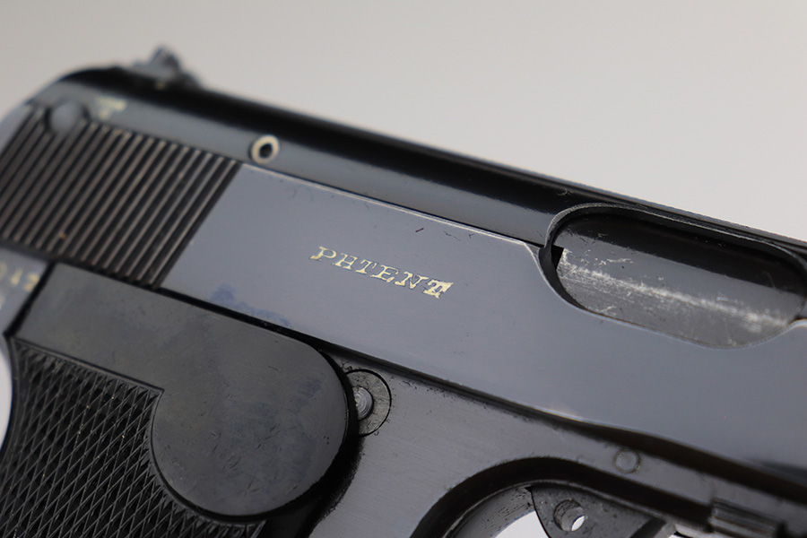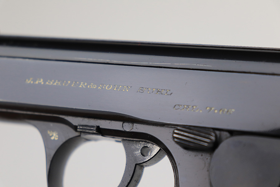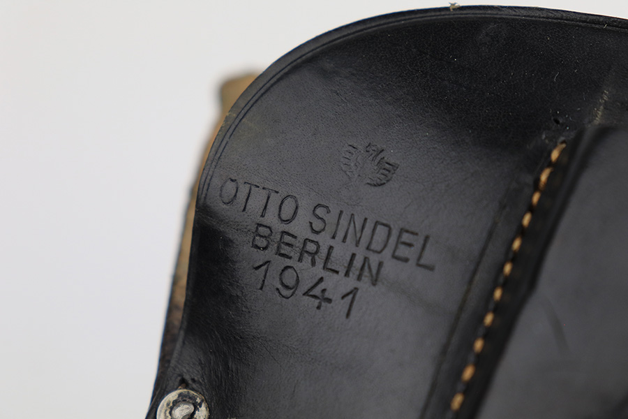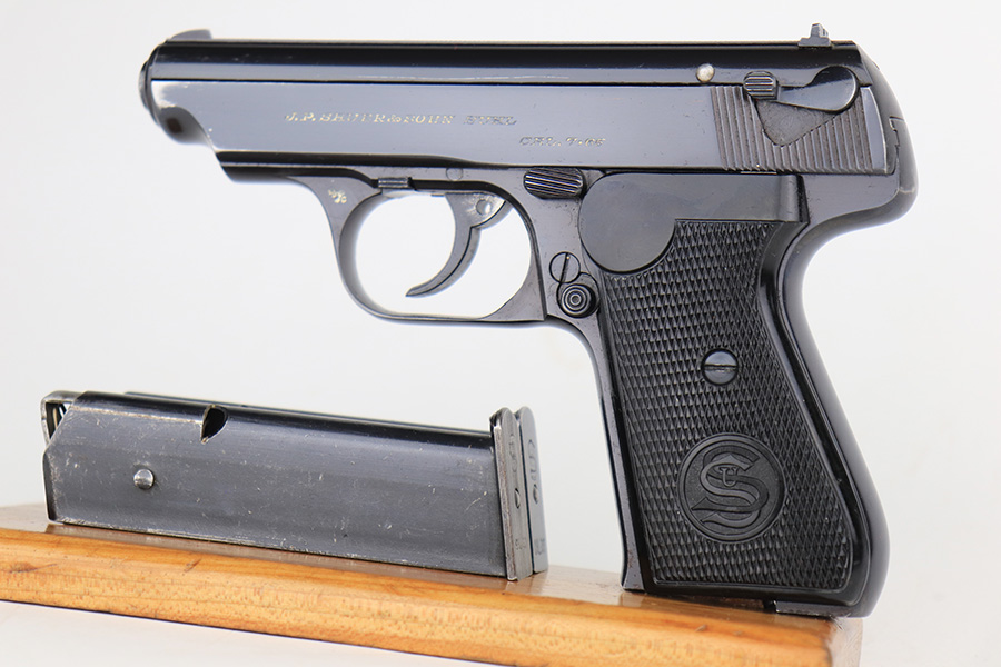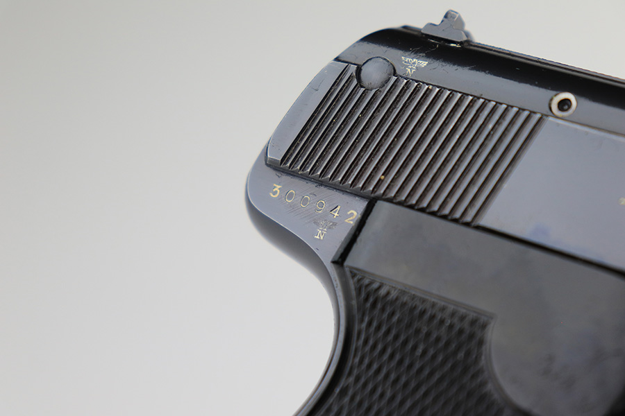 3/16/23 – This is a fairly rare and early Sauer 38h with high-polish finish and police Eagle/C acceptance proof. This one is matching and comes as a rig with a very nice 19141-dated black leather police holster and two period-correct but un-numbered magazines. The gun itself has retained about 96-97% of its original high polish finish with very minor muzzle wear and a spot of wear on the right side of the slide. Very minor wear on the tang. Excellent period-correct black bakelite grips. Mint bore.