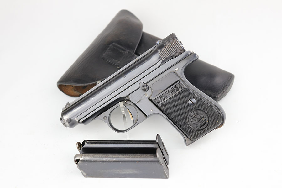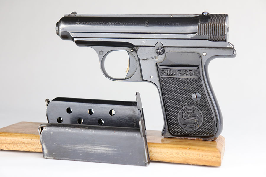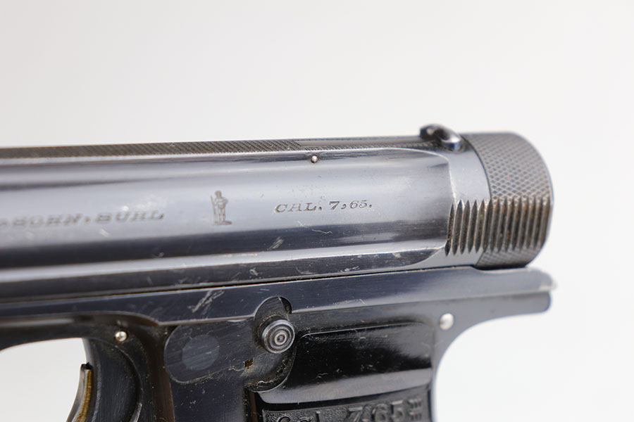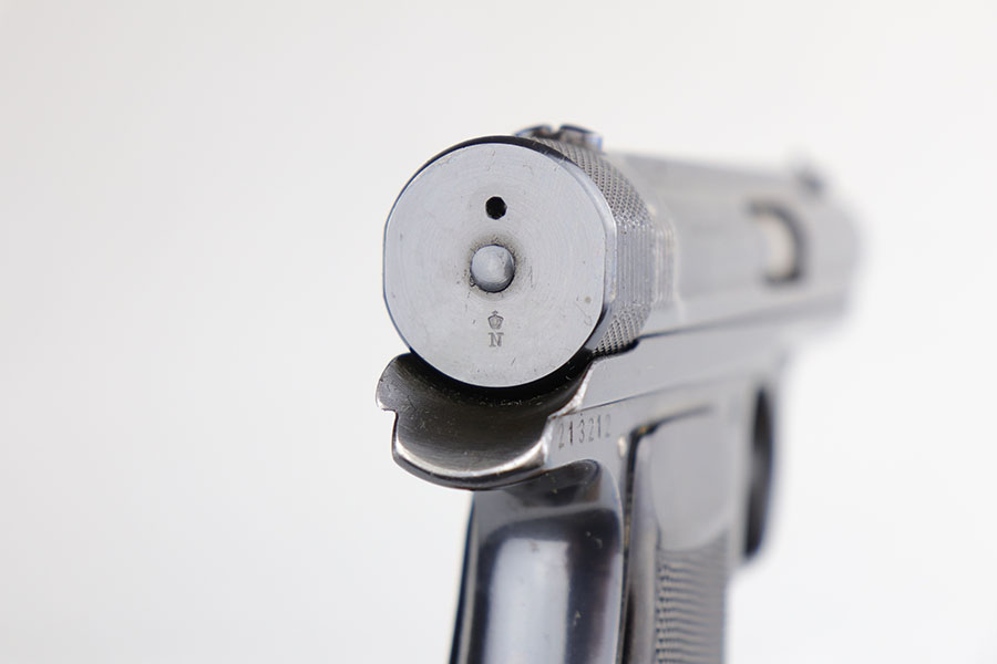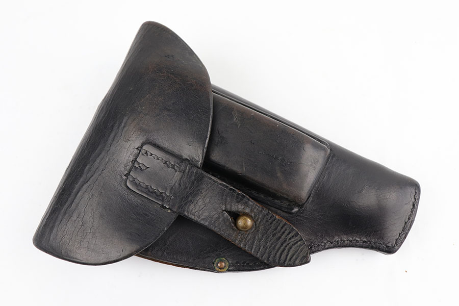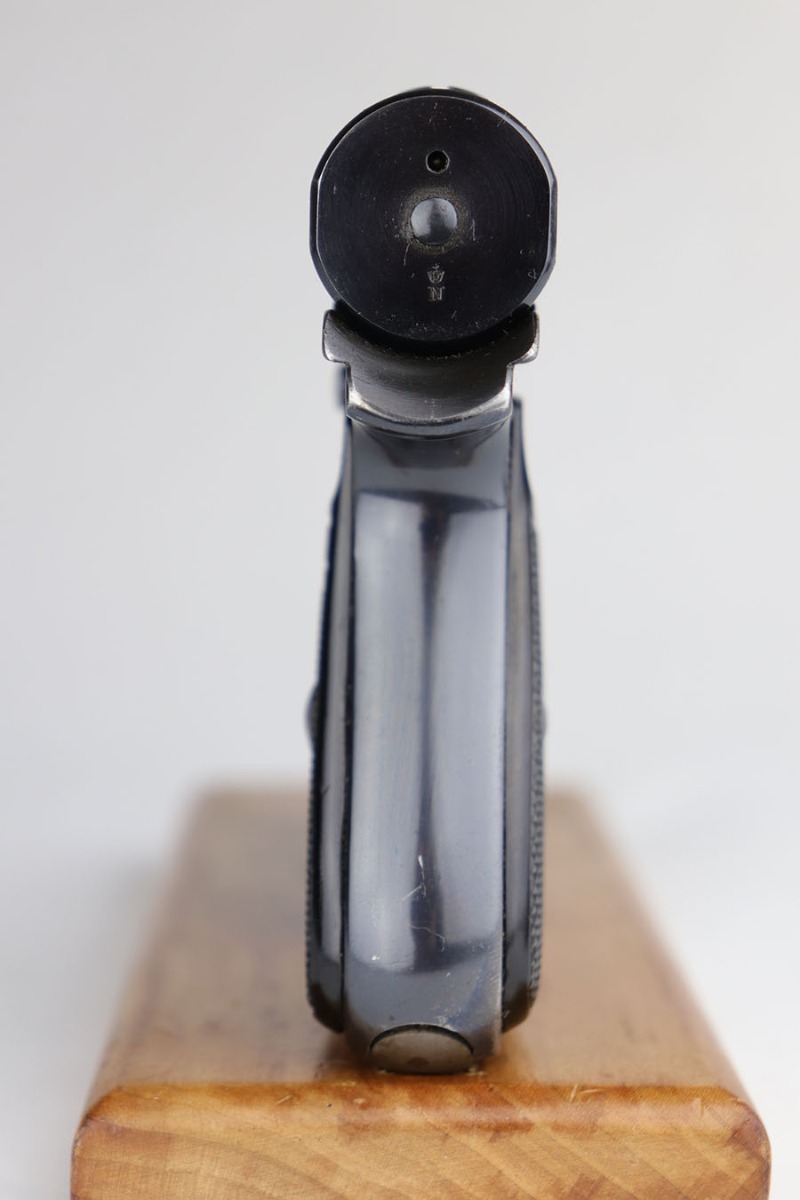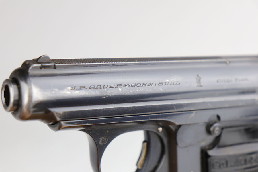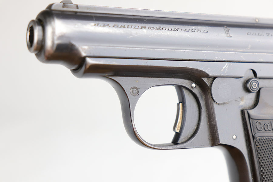 5/29/20 – This is a fairly rare Sauer Behordenmodell rig that is a Prussian State Police issued pistol, as indicated by the Starburst/K proof on the holster and left side of frame pistol. The gun is all original with about 93-94% blue remaining. There’s muzzle and high wear on both sides of the pistol, and a few minor surface scratches on the left side of the frame. Excellent straps and minty grips. Bore is mint too. Rig includes a total of two correct magazines, and is completed by the police style holster. It’s 1938 dated and Berlin marked with some cracking along the top flap but no major defects otherwise.