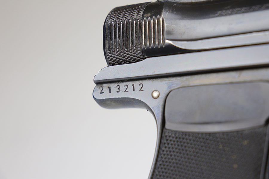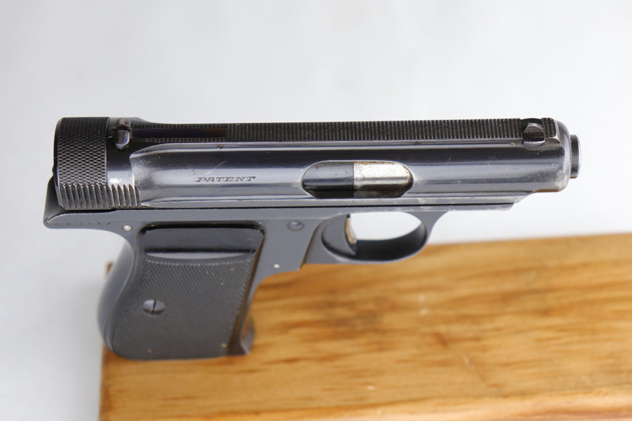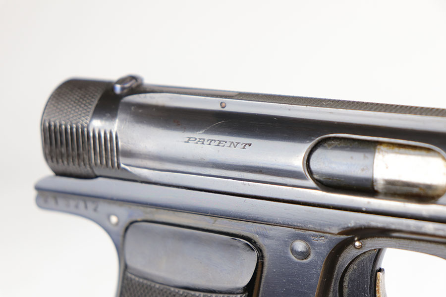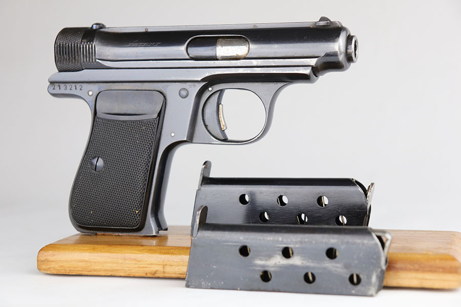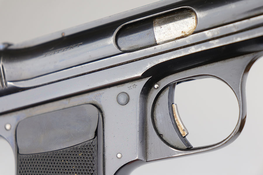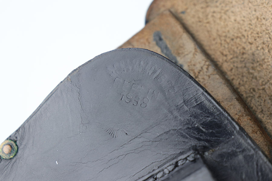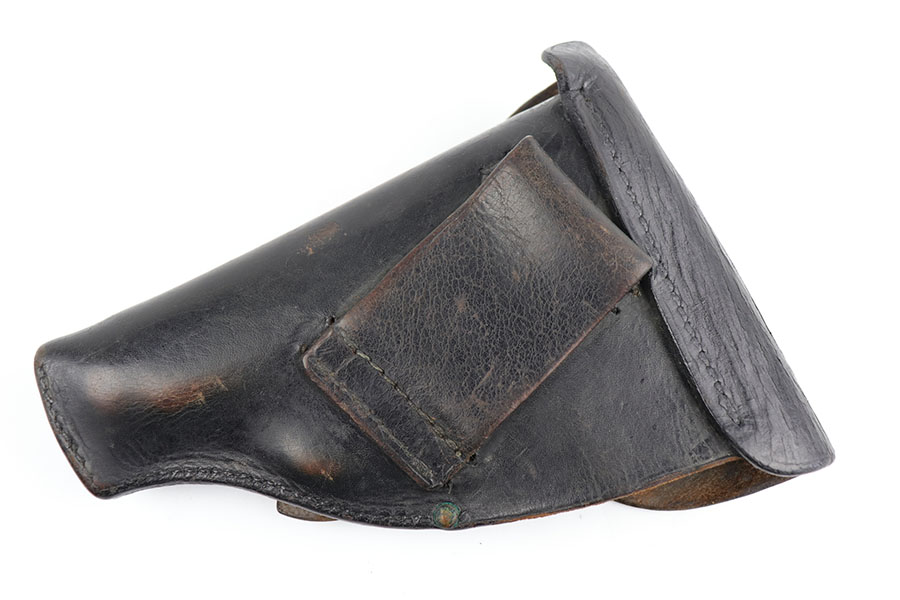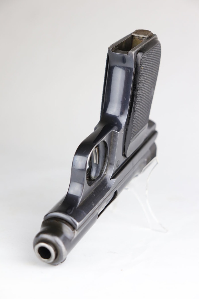 5/29/20 – This is a fairly rare Sauer Behordenmodell rig that is a Prussian State Police issued pistol, as indicated by the Starburst/K proof on the holster and left side of frame pistol. The gun is all original with about 93-94% blue remaining. There’s muzzle and high wear on both sides of the pistol, and a few minor surface scratches on the left side of the frame. Excellent straps and minty grips. Bore is mint too. Rig includes a total of two correct magazines, and is completed by the police style holster. It’s 1938 dated and Berlin marked with some cracking along the top flap but no major defects otherwise.