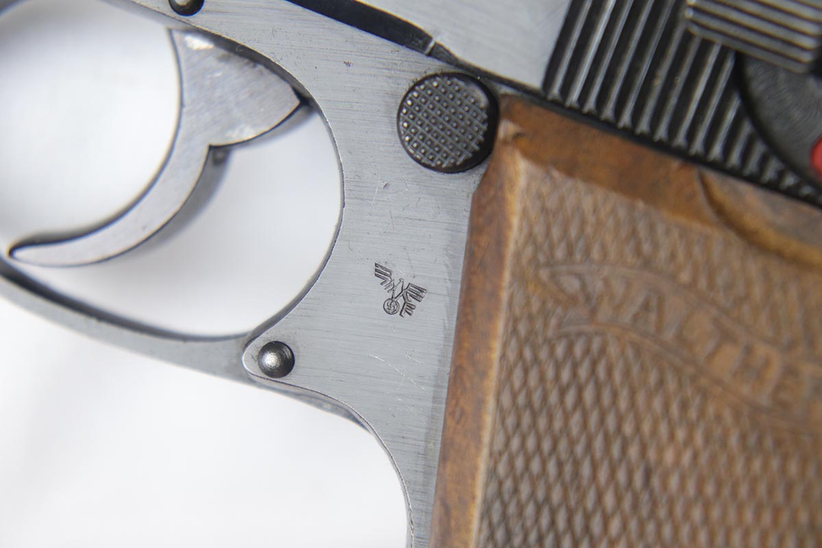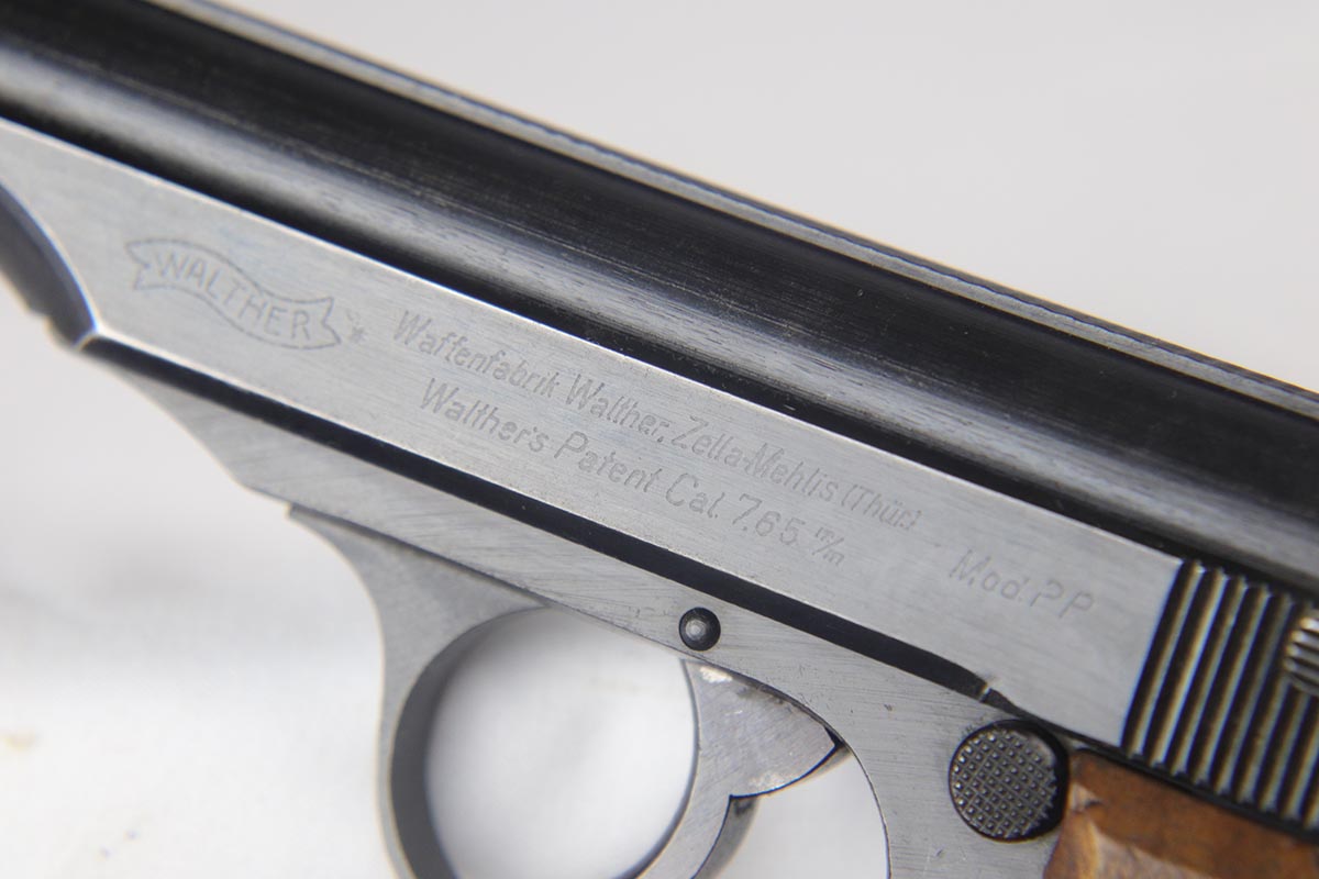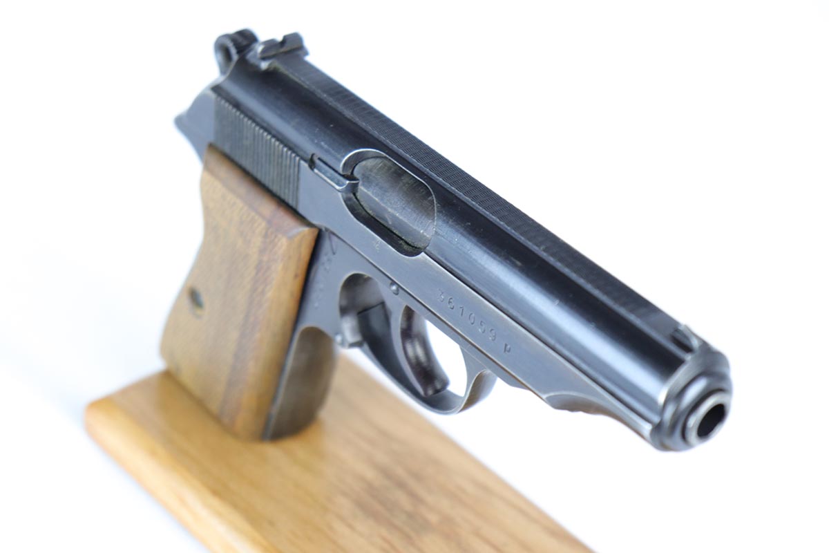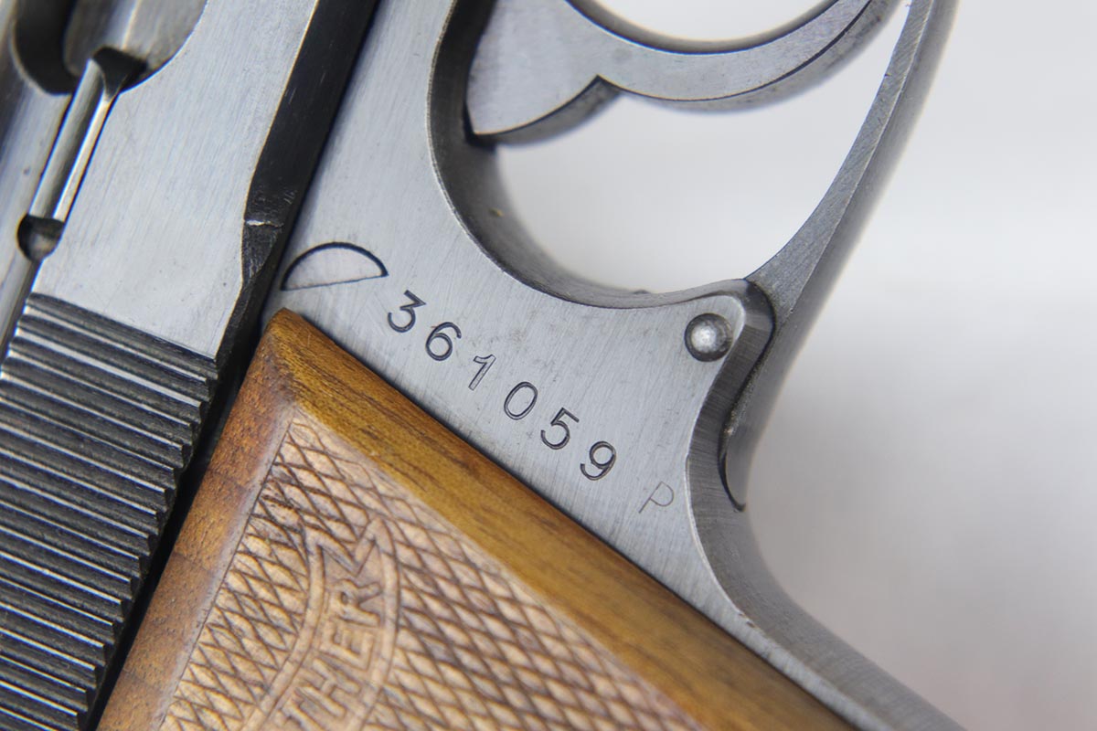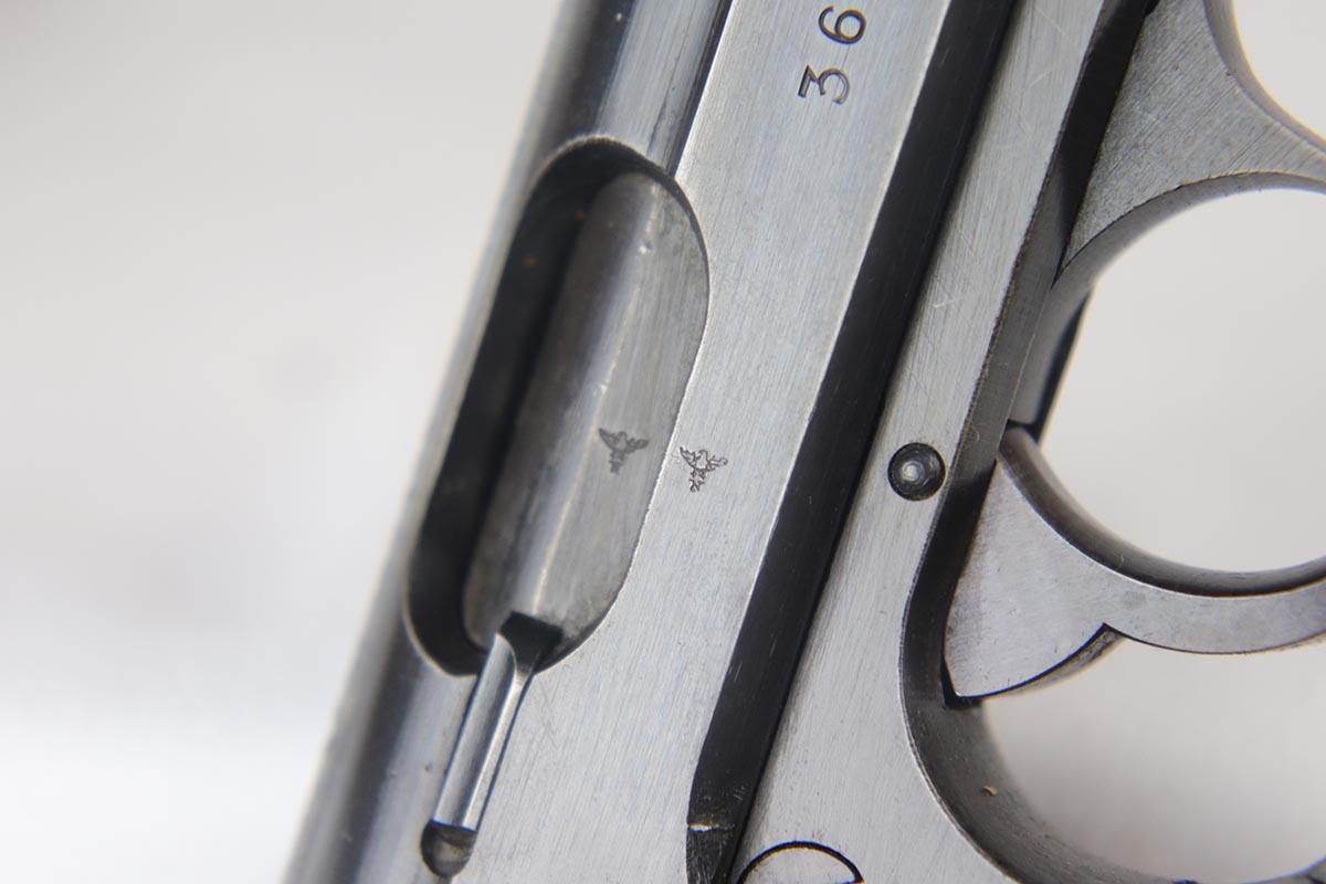 6/26/18 – This is a scarce Walther PP that was issued to the German police during World War II, with Eagle over F proof on left side frame. There were only 5,000 of this variation produced during the war. The pistol is matching and original with ~90% military blue remaining. There is edge thinning throughout, and uniform thinning of the straps. The late-war wood grips are in great condition. Excellent bore. Comes with an unmarked period holster.