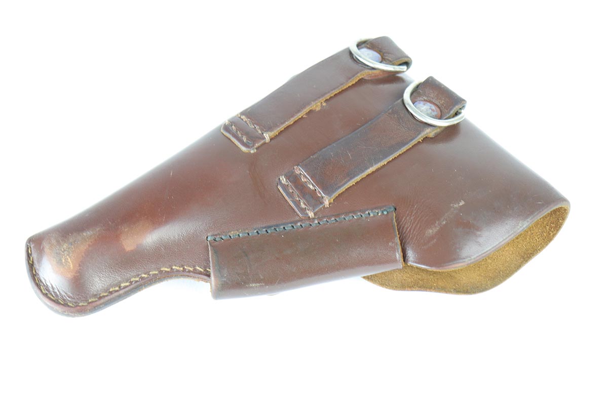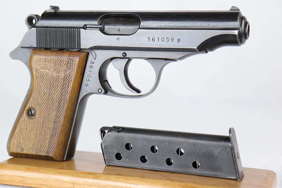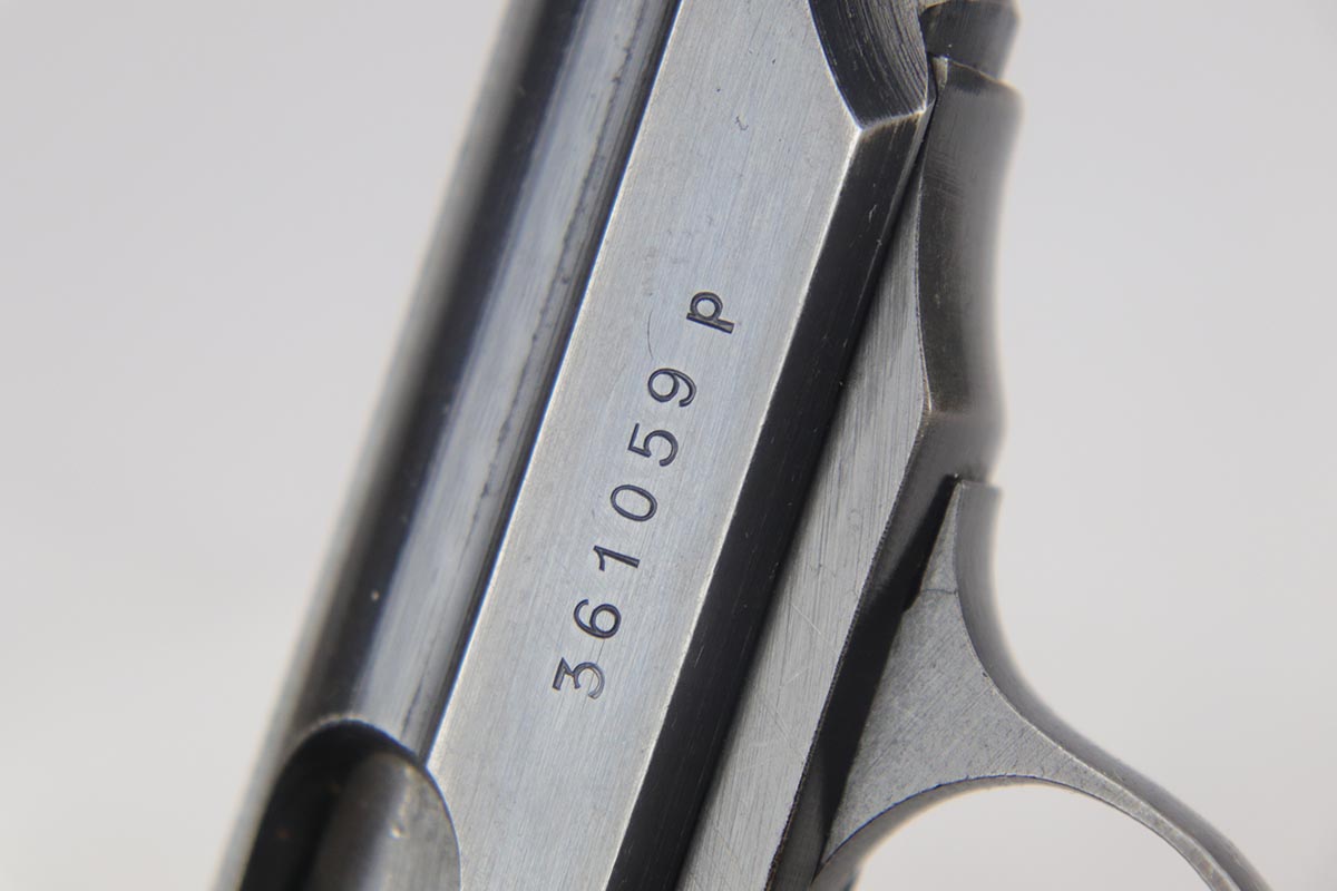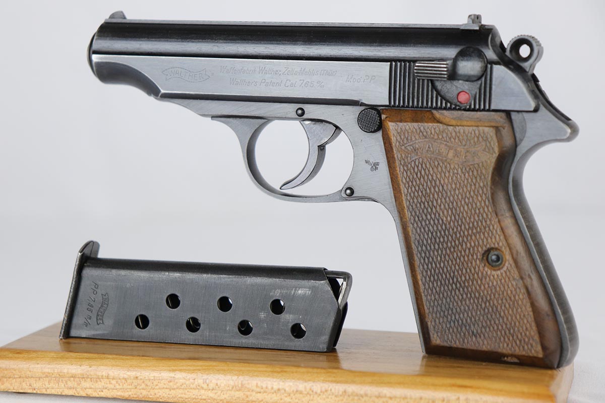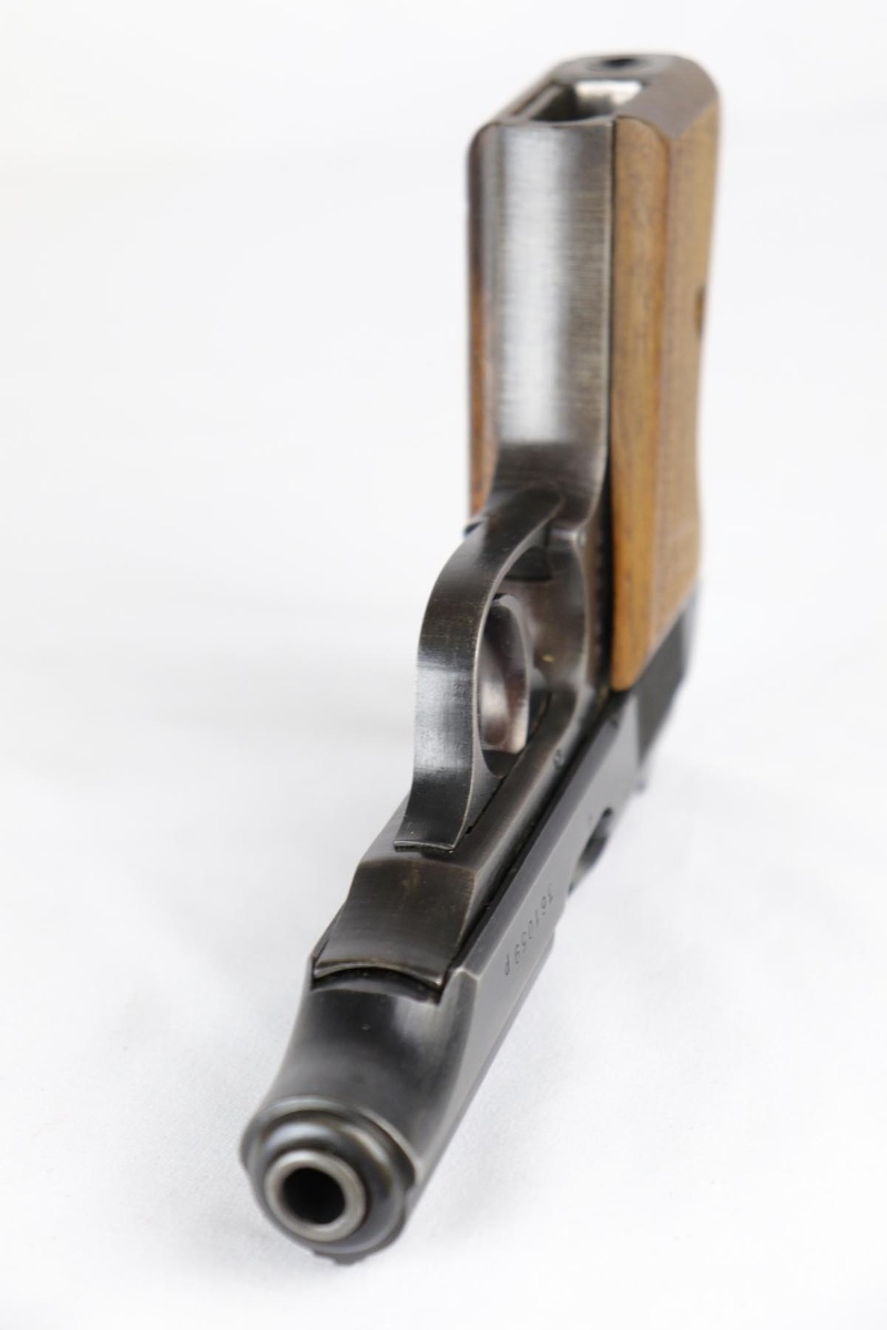 6/26/18 – This is a scarce Walther PP that was issued to the German police during World War II, with Eagle over F proof on left side frame. There were only 5,000 of this variation produced during the war. The pistol is matching and original with ~90% military blue remaining. There is edge thinning throughout, and uniform thinning of the straps. The late-war wood grips are in great condition. Excellent bore. Comes with an unmarked period holster.