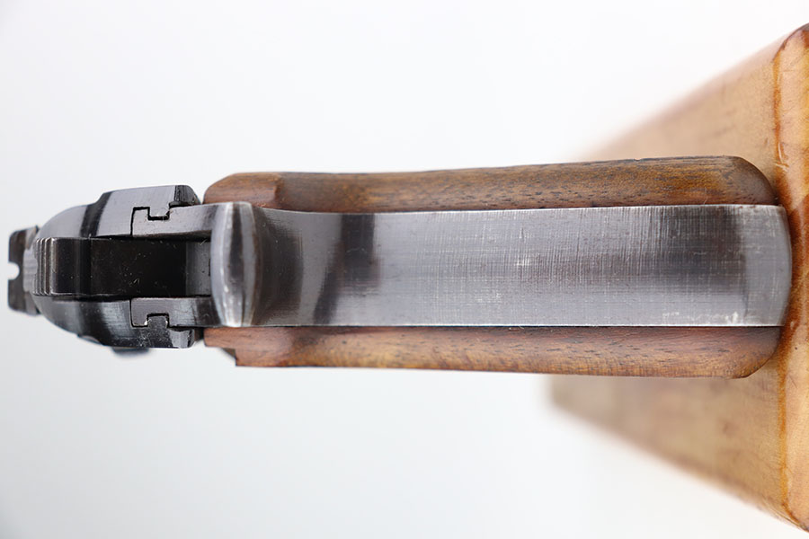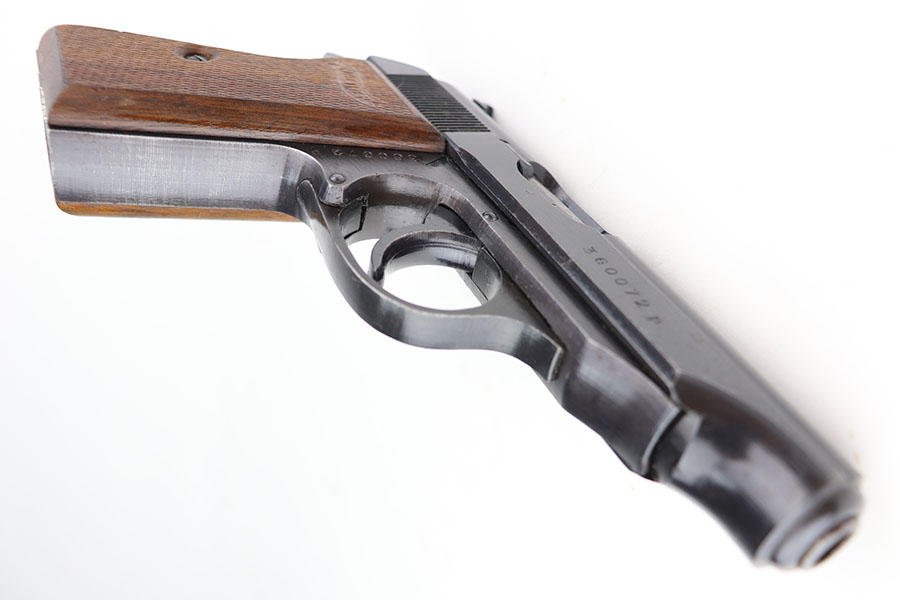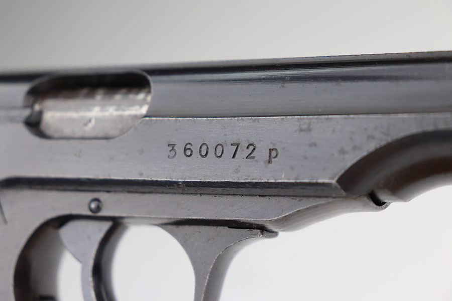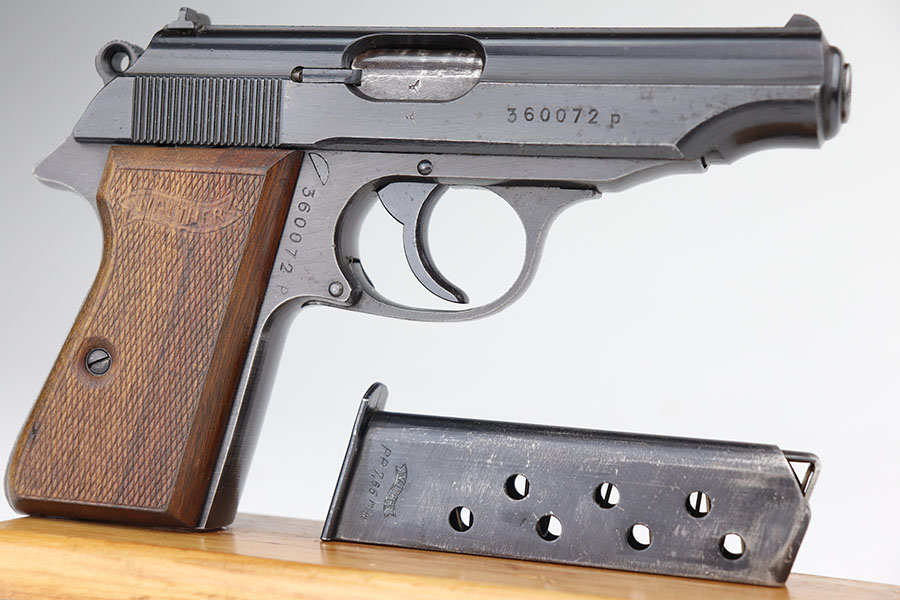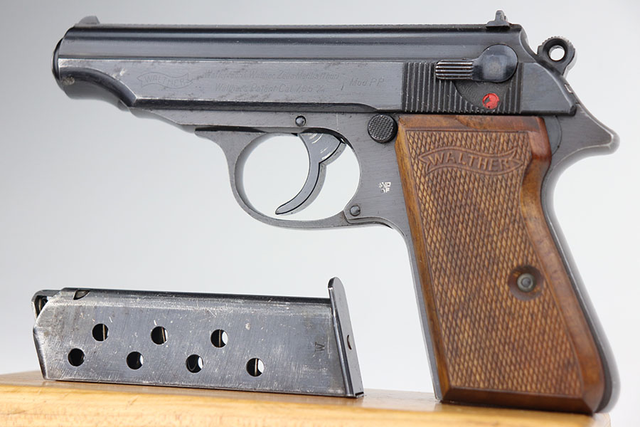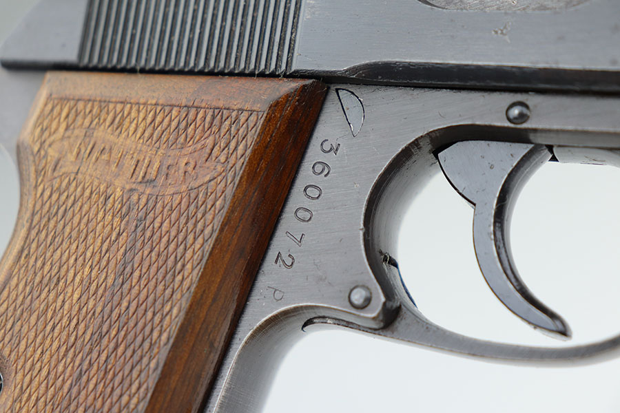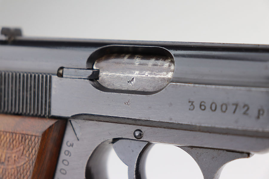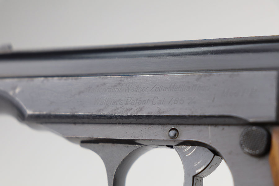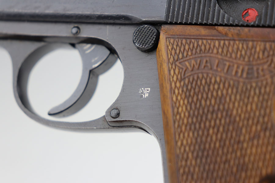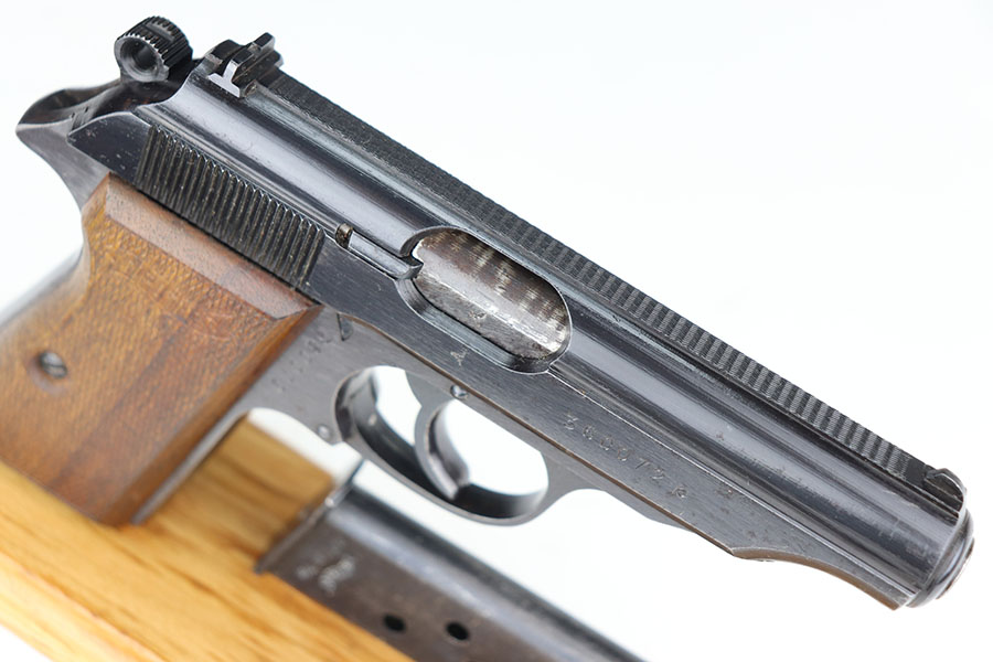 1/26/21 – This is a scarce Police Walther PP from 1944. One of about 5,000 of this variation produced with Eagle/F on left side of frame. The gun is all original and in excellent condition, with only minor thinning on the straps. There is some oxidation on both sides of the slide though. Terrific late-war wood grips and a minty bore. Correct magazine with ‘W’ on the body.