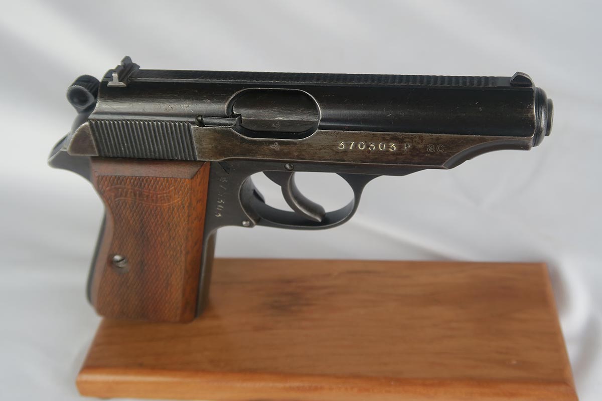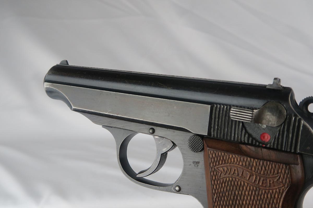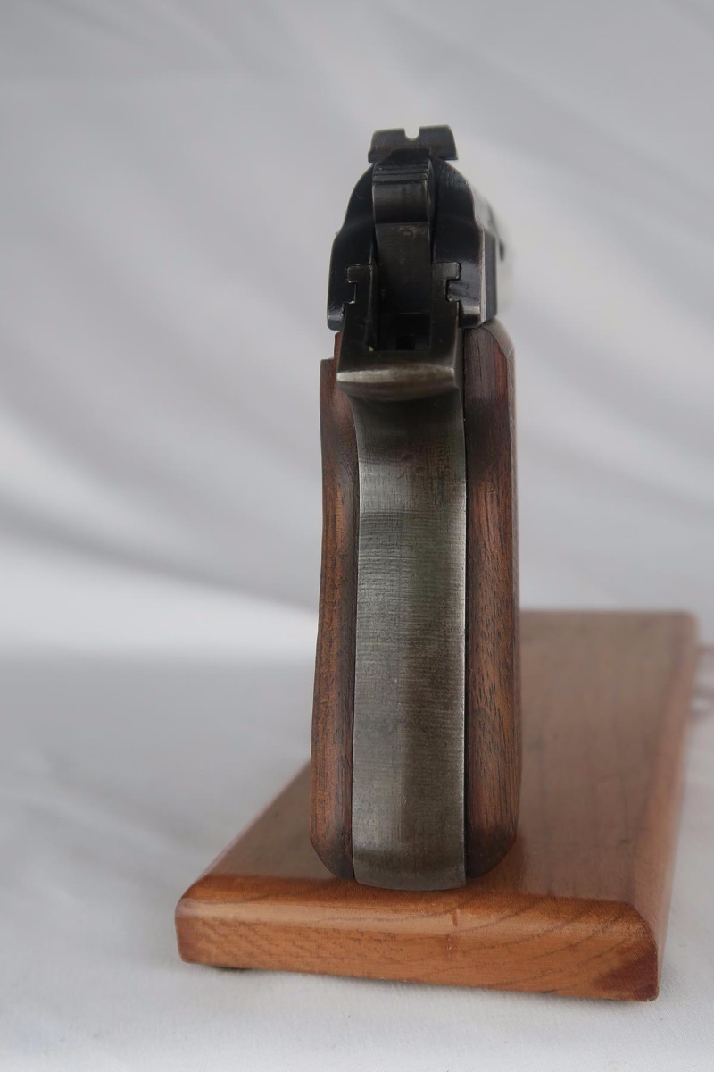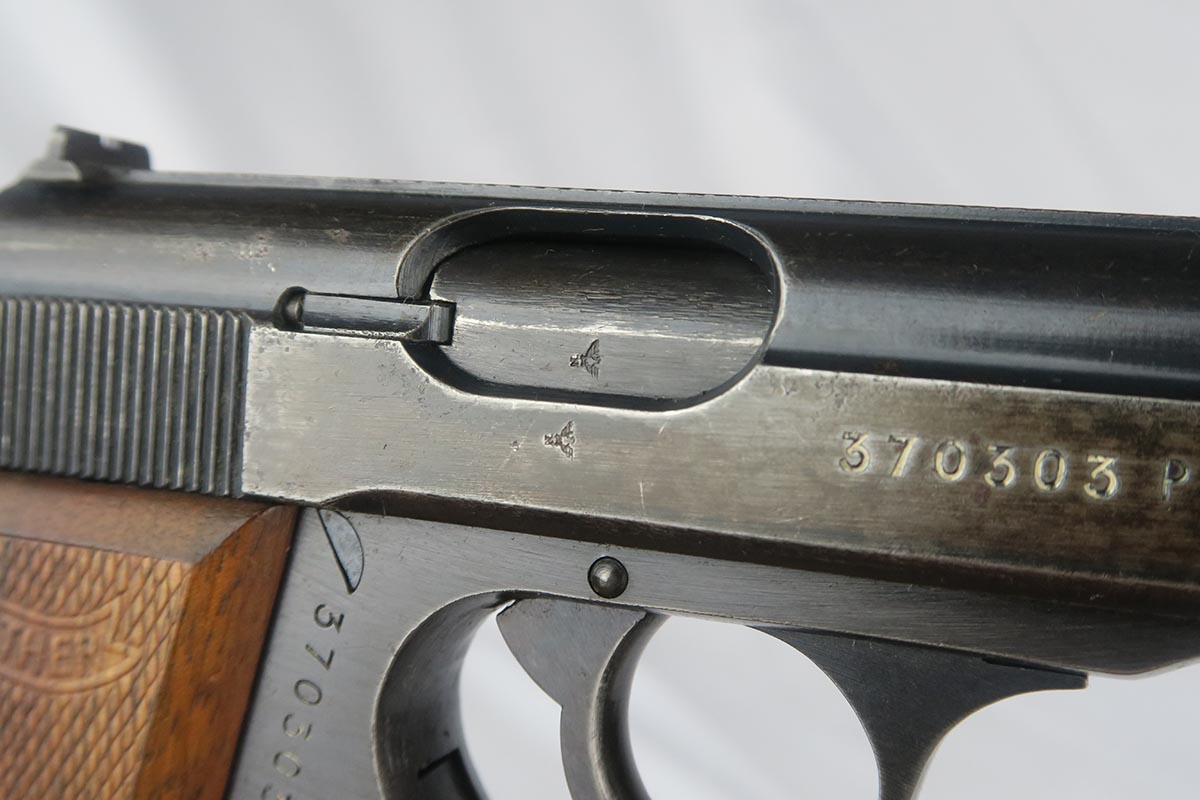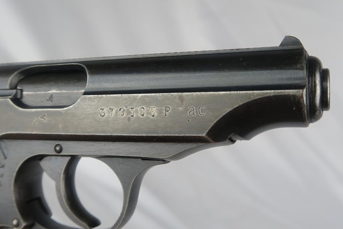 9/21/17 – This is a fairly rare Police Walther PP, with Eagle/F proof on the frame and ‘ac’ code on the slide.  There were only ~6,000 of this variation produced.  This one is all correct and original with maybe 90% bluing remaining.  Straps have some thinning and the right side of the slide has browning showing through. Nice late-war wood grips.  Excellent wartime mag.  Very nice bore with no issues.