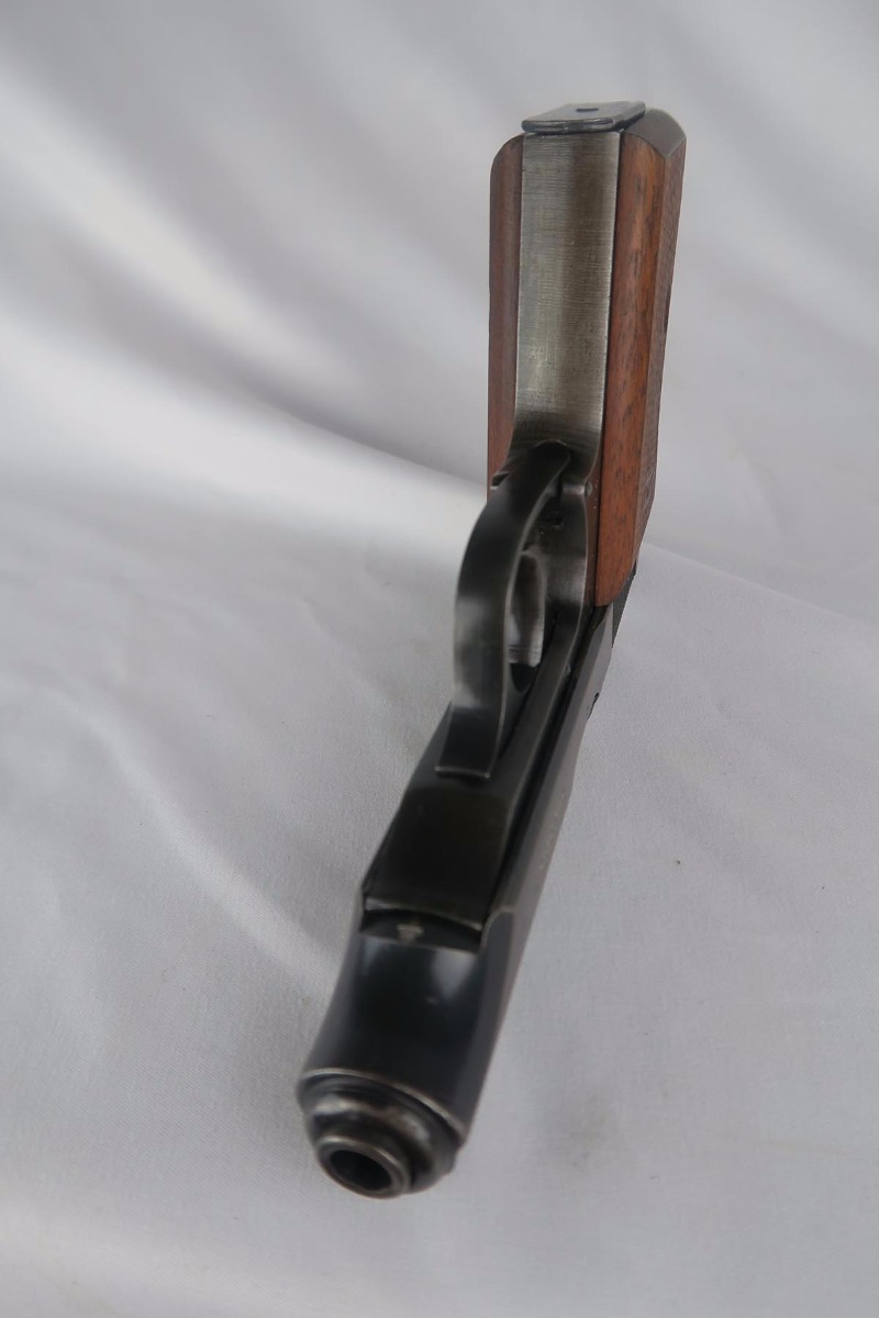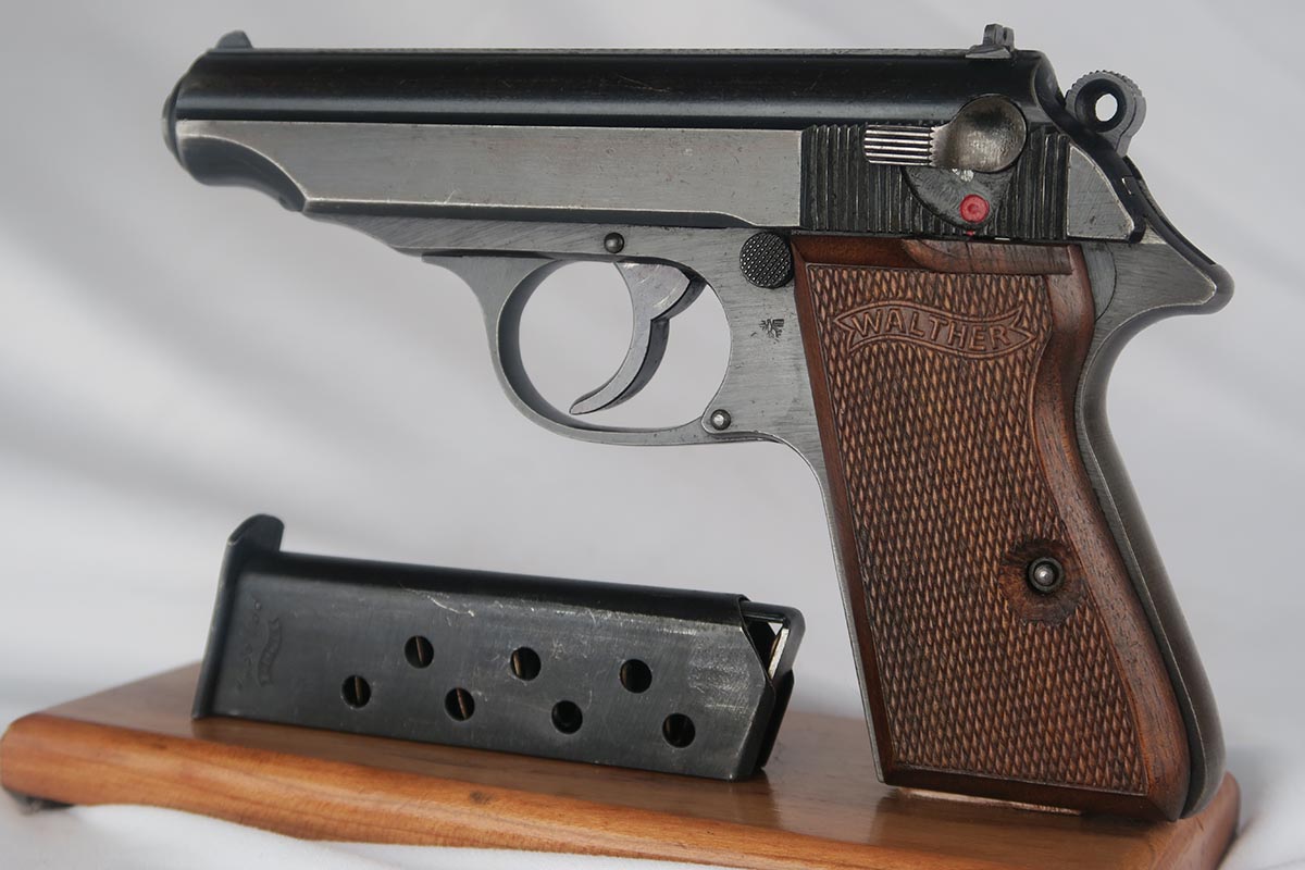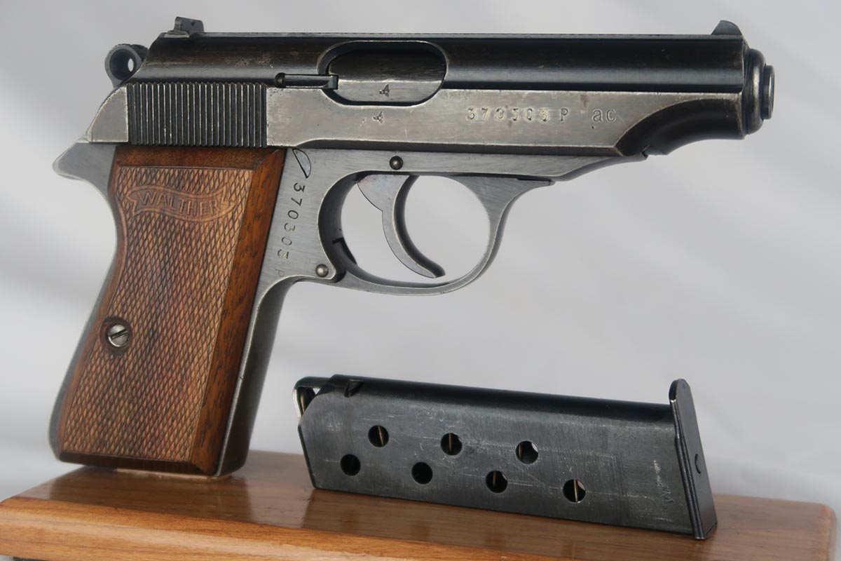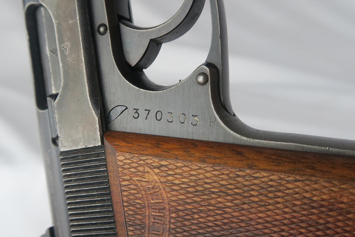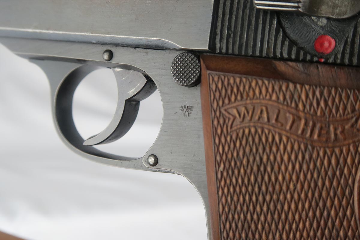 9/21/17 – This is a fairly rare Police Walther PP, with Eagle/F proof on the frame and ‘ac’ code on the slide.  There were only ~6,000 of this variation produced.  This one is all correct and original with maybe 90% bluing remaining.  Straps have some thinning and the right side of the slide has browning showing through. Nice late-war wood grips.  Excellent wartime mag.  Very nice bore with no issues.