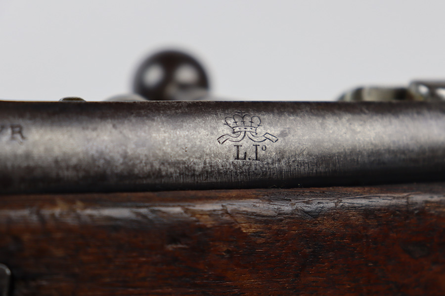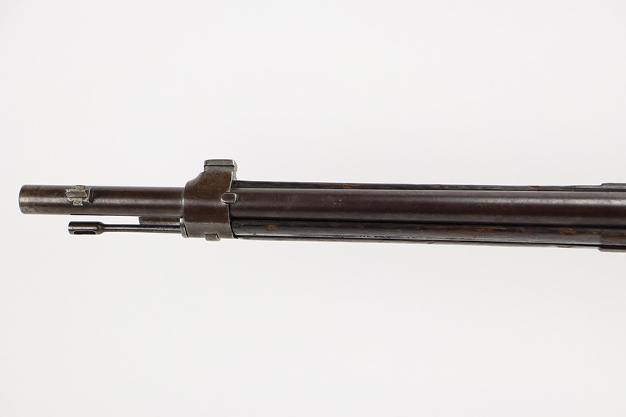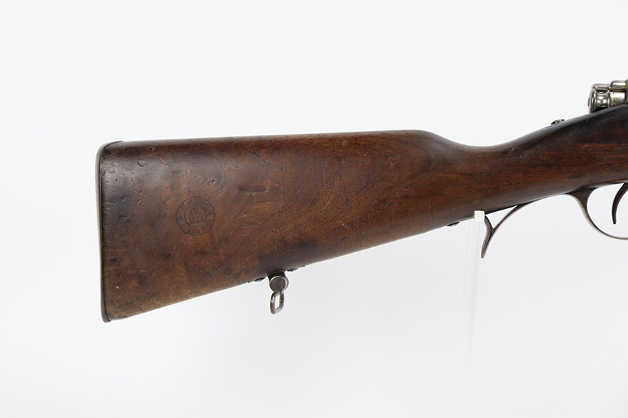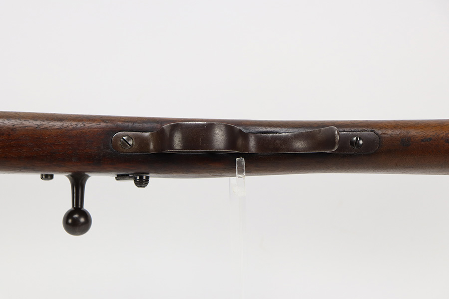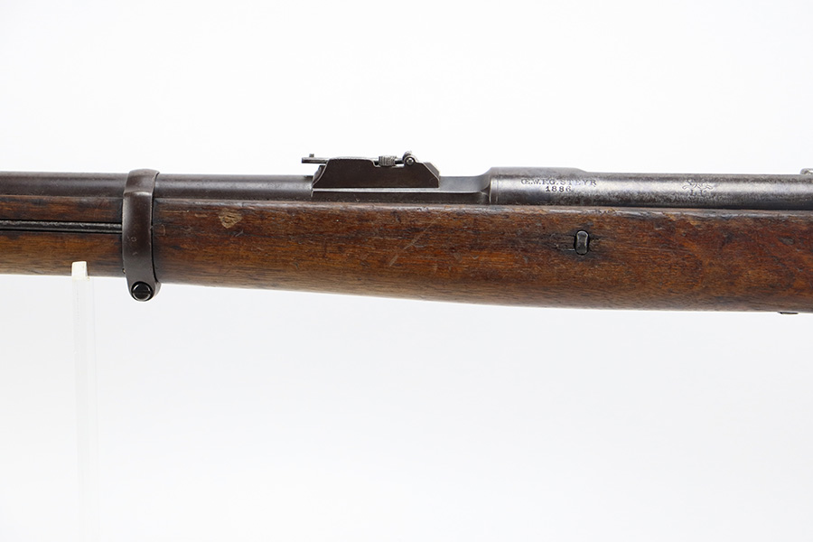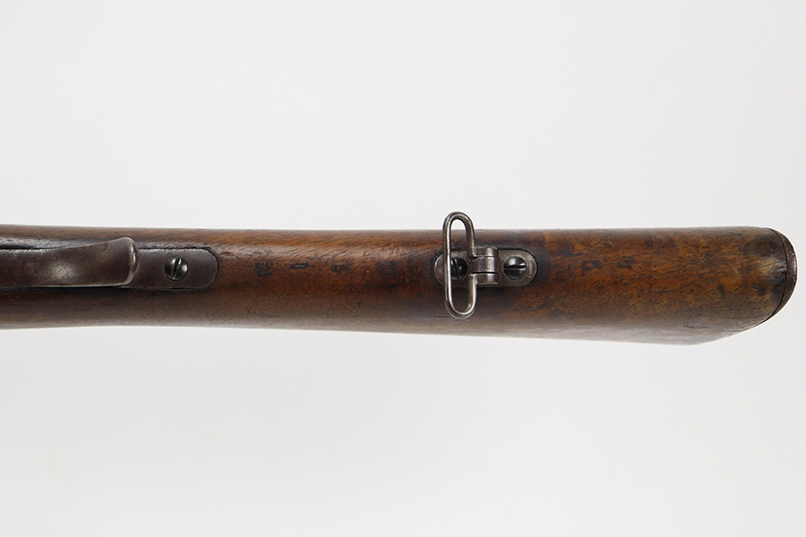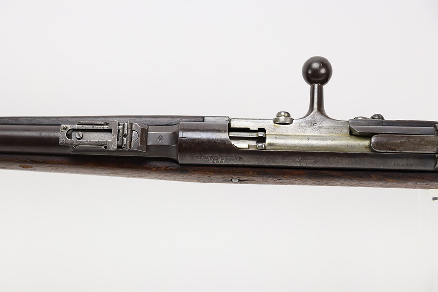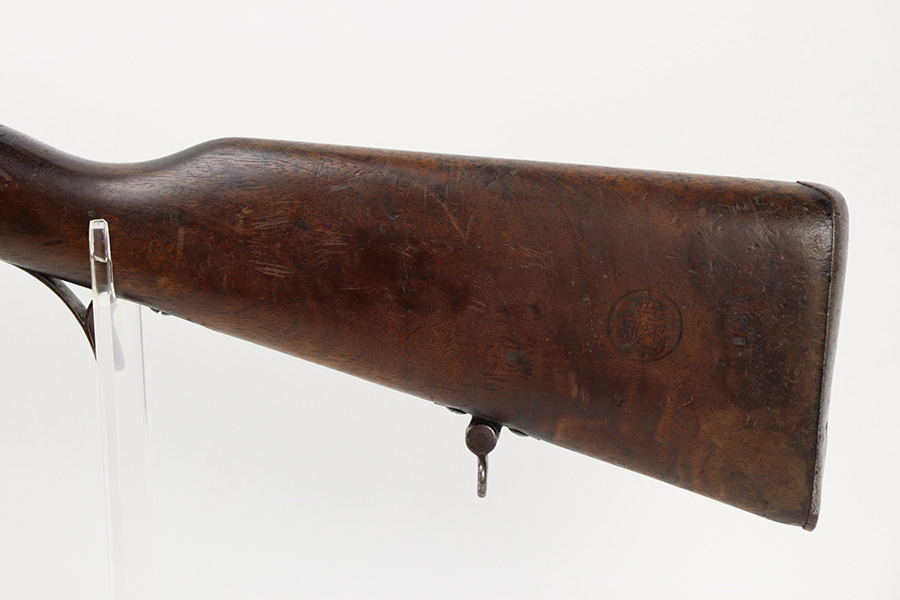 7/24/23 – This is a Scarce Portuguese Kropatschek Model 1886 Short Rifle, utilizing the iconic tubular magazine that many rifles copied in the late 18th century. Only 4,800 of this 26″ short rifle variant were produced, making them exceedingly rare relative to the more common rifle and carbine. The Model 1886 was designed too late to enter Austro-Hungarian service as the Steyr Model 1886 Mannlicher had already been adopted. The Portuguese and the French Navy would take interest in adopting these rifles. The rifle is fully matching, on the barrel, bolt head, bolt body, rear of the bolt, safety flag, magazine body next to the cutoff, and stock. The metal has retained about 80% of its original finish, with visible patina on the receiver and barrel. The receiver is marked “CE.W.F.G Steyr 1886”, a Crown over LI stamp, identifying it as the property of King Louis of Portugal, and “M.1886” on the rear of the receiver. The wood is in good overall condition, aside from a crack to the left of the receiver tang, and a small chip in front of the rear sight. The stock has a crisp cartouche and serial number. Bore is bright with strong rifling, and a little frost in the grooves. The rifle is missing its front barrel band. Antique, so no licensing required.