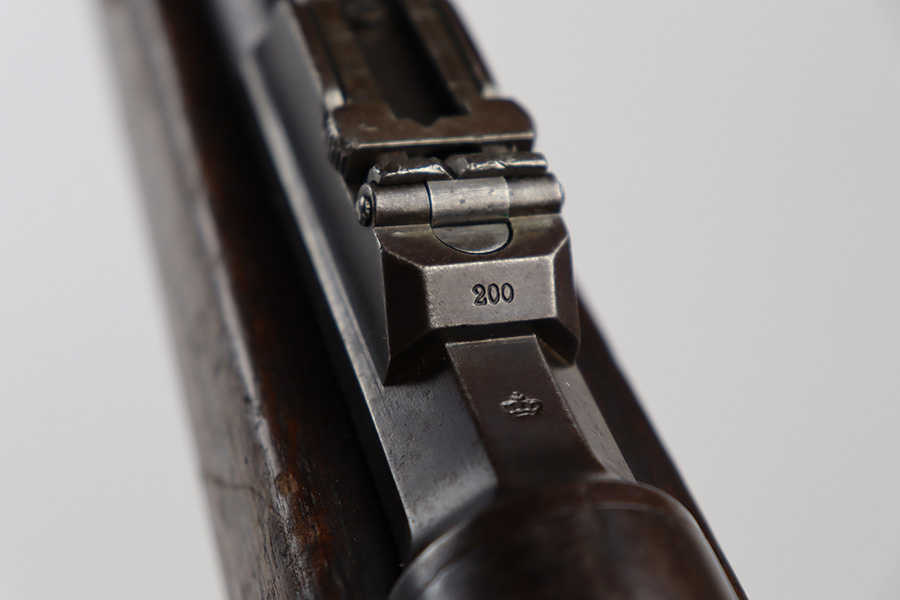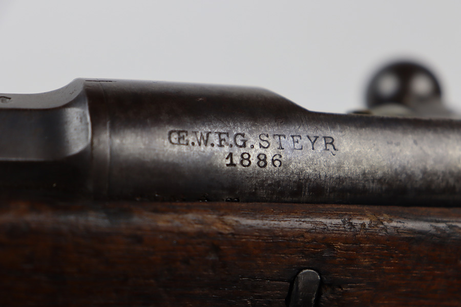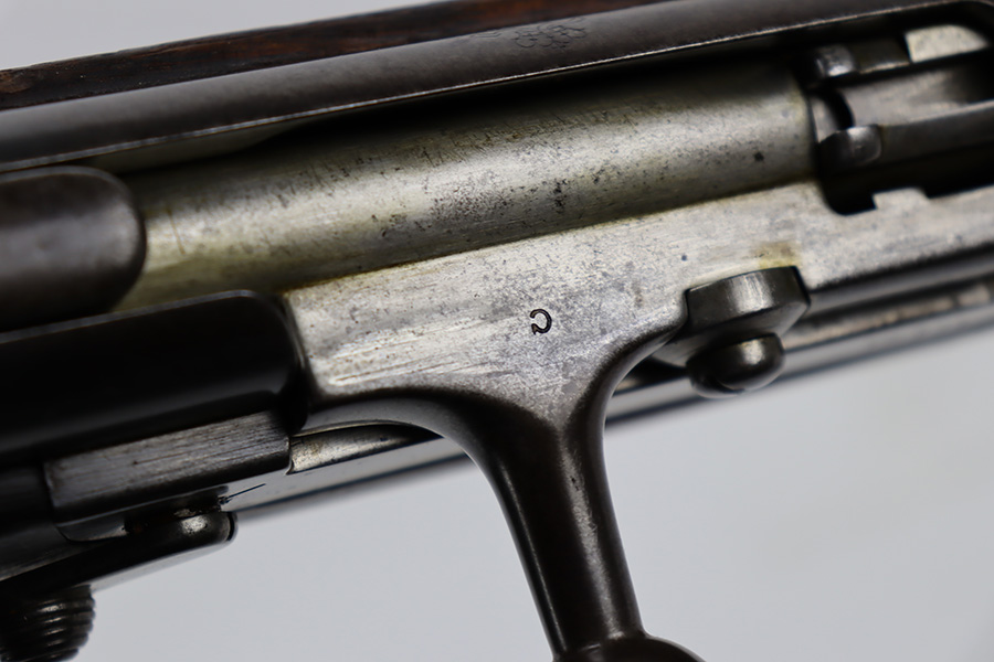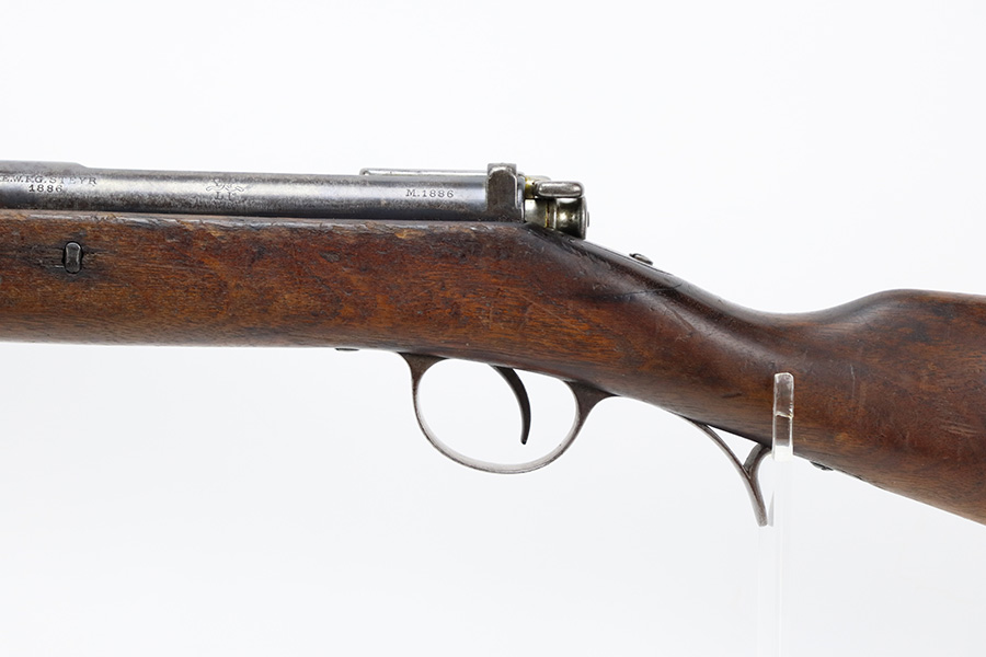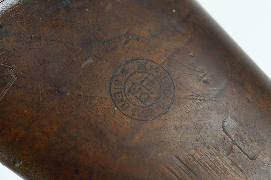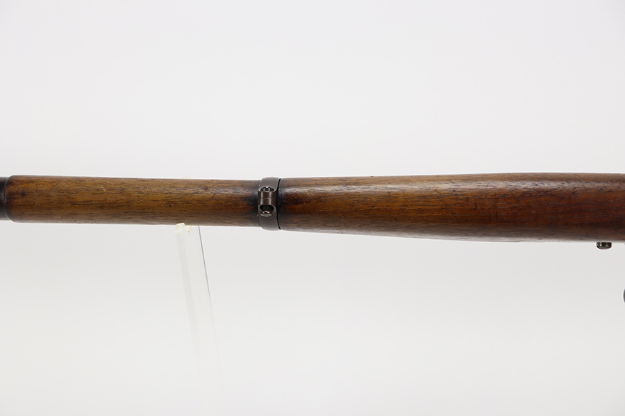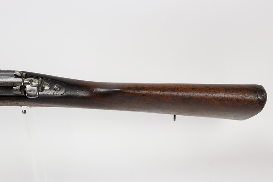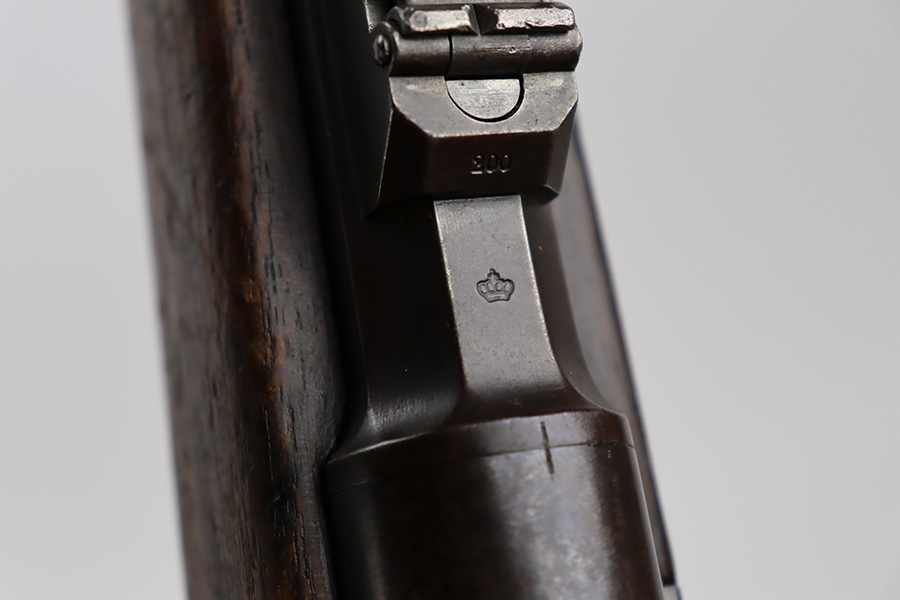 7/24/23 – This is a Scarce Portuguese Kropatschek Model 1886 Short Rifle, utilizing the iconic tubular magazine that many rifles copied in the late 18th century. Only 4,800 of this 26″ short rifle variant were produced, making them exceedingly rare relative to the more common rifle and carbine. The Model 1886 was designed too late to enter Austro-Hungarian service as the Steyr Model 1886 Mannlicher had already been adopted. The Portuguese and the French Navy would take interest in adopting these rifles. The rifle is fully matching, on the barrel, bolt head, bolt body, rear of the bolt, safety flag, magazine body next to the cutoff, and stock. The metal has retained about 80% of its original finish, with visible patina on the receiver and barrel. The receiver is marked “CE.W.F.G Steyr 1886”, a Crown over LI stamp, identifying it as the property of King Louis of Portugal, and “M.1886” on the rear of the receiver. The wood is in good overall condition, aside from a crack to the left of the receiver tang, and a small chip in front of the rear sight. The stock has a crisp cartouche and serial number. Bore is bright with strong rifling, and a little frost in the grooves. The rifle is missing its front barrel band. Antique, so no licensing required.