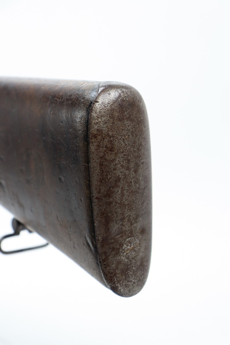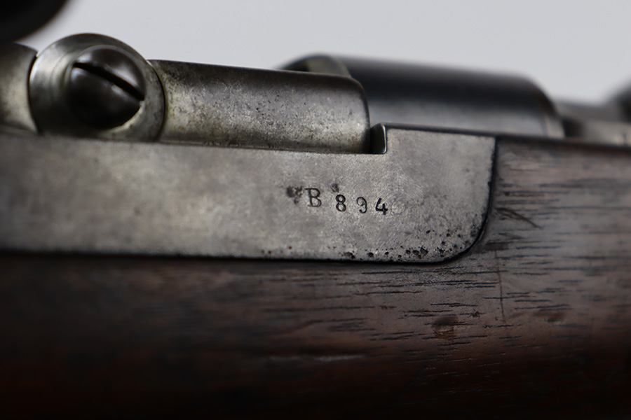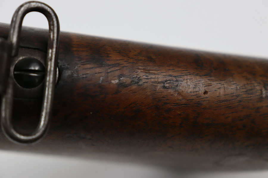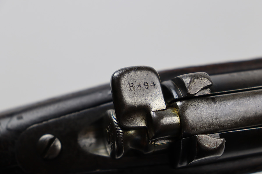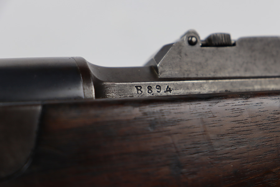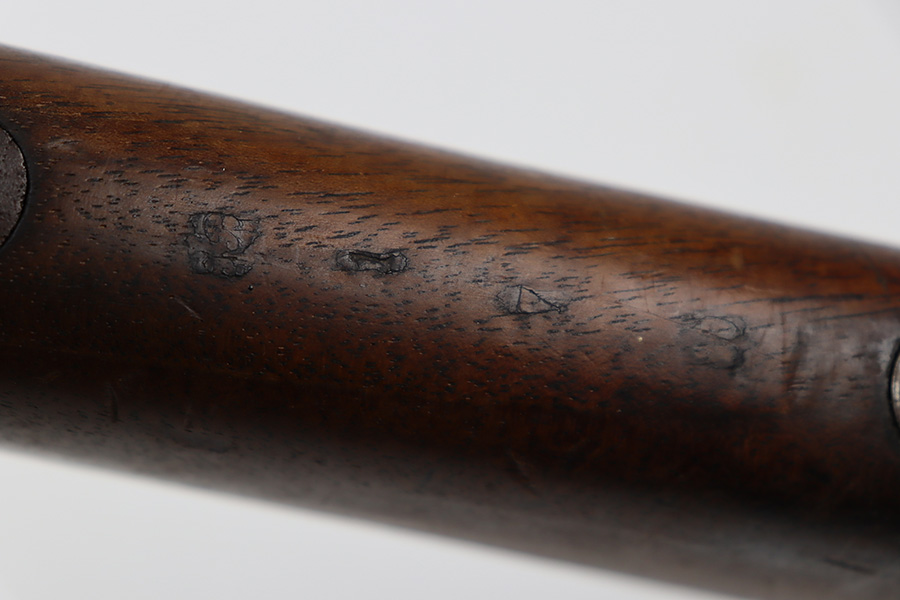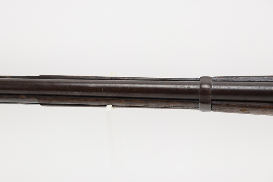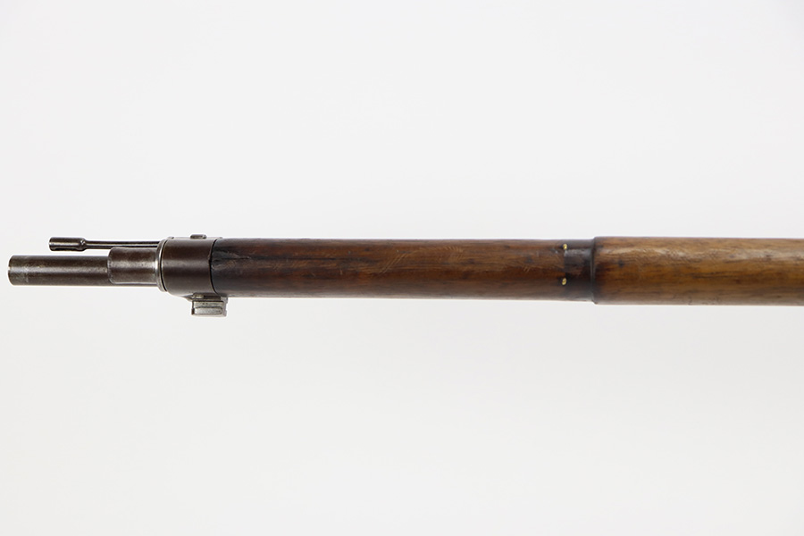 7/24/23 – This is a Scarce Portuguese Kropatschek Model 1886 Short Rifle, utilizing the iconic tubular magazine that many rifles copied in the late 18th century. Only 4,800 of this 26″ short rifle variant were produced, making them exceedingly rare relative to the more common rifle and carbine. The Model 1886 was designed too late to enter Austro-Hungarian service as the Steyr Model 1886 Mannlicher had already been adopted. The Portuguese and the French Navy would take interest in adopting these rifles. The rifle is fully matching, on the barrel, bolt head, bolt body, rear of the bolt, safety flag, magazine body next to the cutoff, and stock. The metal has retained about 80% of its original finish, with visible patina on the receiver and barrel. The receiver is marked “CE.W.F.G Steyr 1886”, a Crown over LI stamp, identifying it as the property of King Louis of Portugal, and “M.1886” on the rear of the receiver. The wood is in good overall condition, aside from a crack to the left of the receiver tang, and a small chip in front of the rear sight. The stock has a crisp cartouche and serial number. Bore is bright with strong rifling, and a little frost in the grooves. The rifle is missing its front barrel band. Antique, so no licensing required.