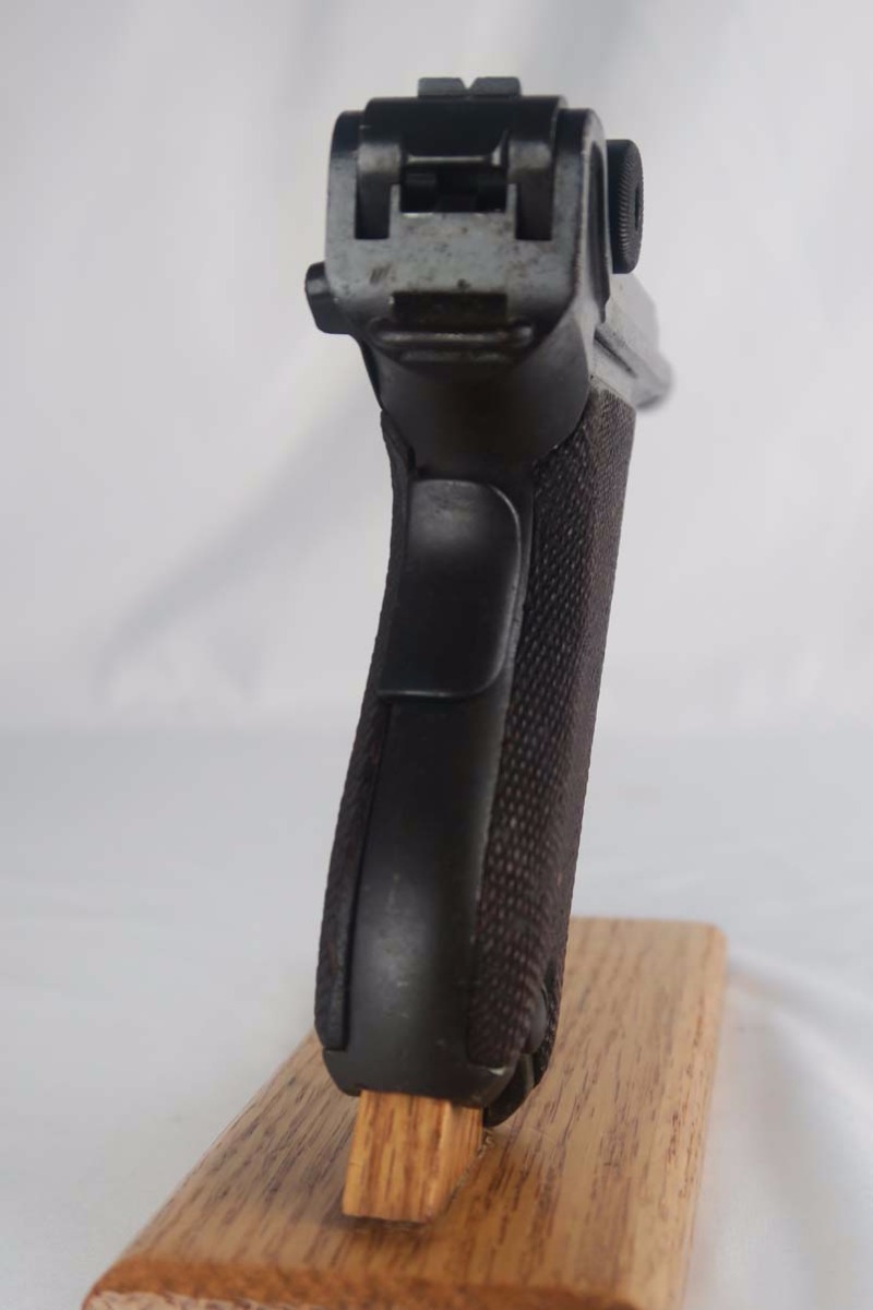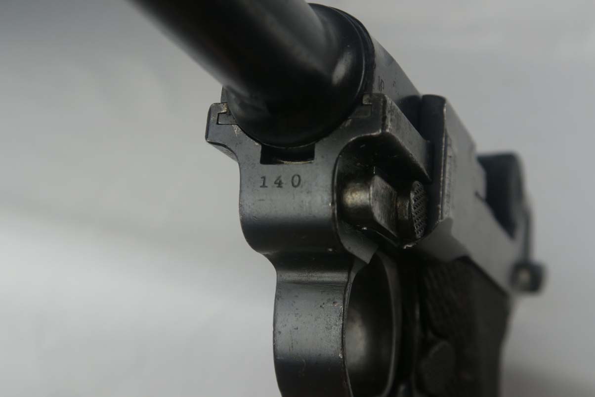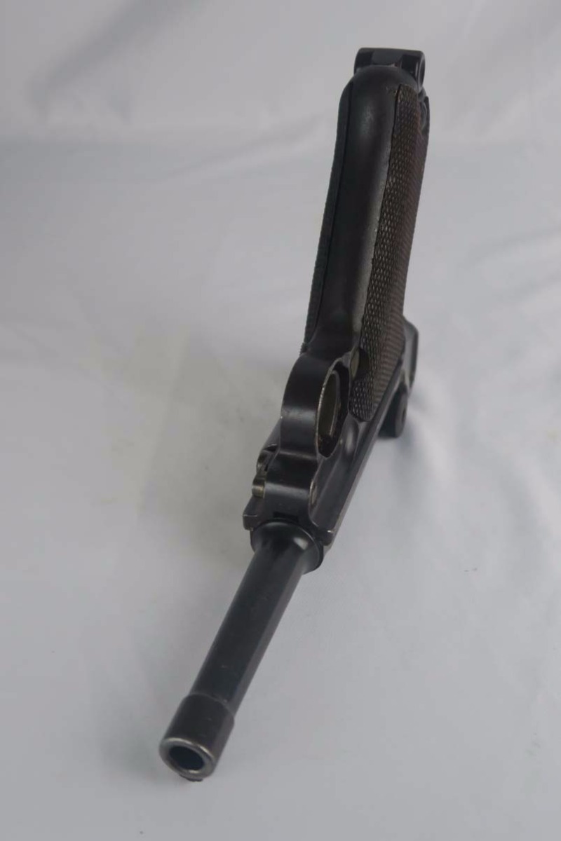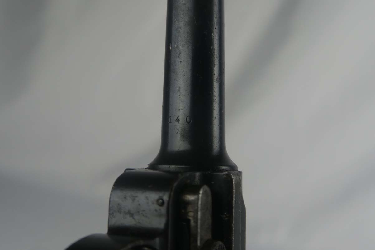 7/25/17 – This is an example of the First Contract Model 1906 DWM Luger pistol that was produced for the “Royal Portuguese Navy”. This was the original contract model made before 1910 when the Republic of Portugal was established. It is estimated that a total of only 1,000 were produced, however the highest known serial number to date is 769. The top of the chamber is marked with the large “Portuguese Crown over a single fouled “Naval Anchor” with the “DWM” logo on the front toggle. This first model has the earlier 1906 style frame with grip safety, no stock lug, with the correct polished lower safety area (with no markings). The lower left side of the barrel extension is also correctly stamped with the Portuguese proof of “MP”, with no other inspection or acceptance proofs. As noted this model is numbered in the correct commercial manner, with no letter suffix. It has the standard commercial finish and rates at about 95% with most of the wear on the sideplate and barrel.  It is a rough finish but doesn’t have much actual bluing loss.  Decent amount of patina on the straps.  Postwar mag.  Bore is a little frosted but should shoot just fine.