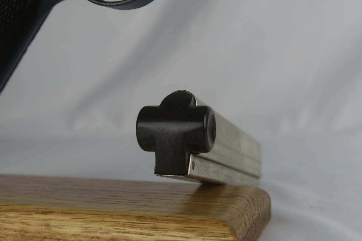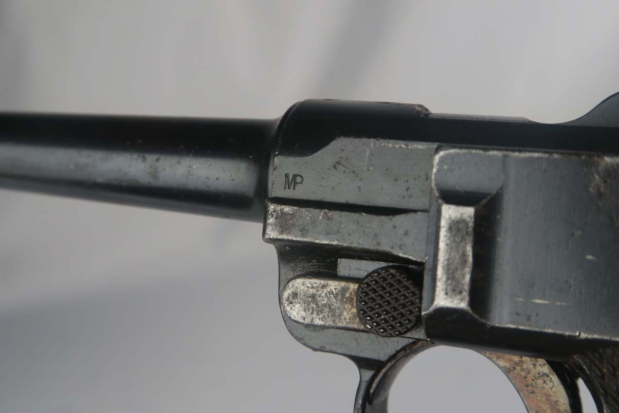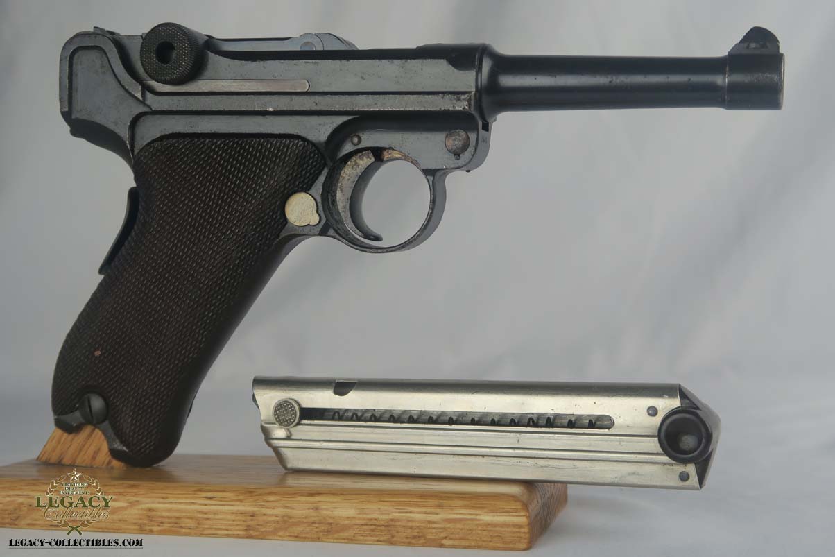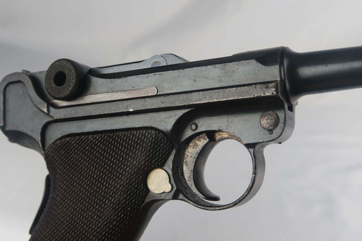 7/25/17 – This is an example of the First Contract Model 1906 DWM Luger pistol that was produced for the “Royal Portuguese Navy”. This was the original contract model made before 1910 when the Republic of Portugal was established. It is estimated that a total of only 1,000 were produced, however the highest known serial number to date is 769. The top of the chamber is marked with the large “Portuguese Crown over a single fouled “Naval Anchor” with the “DWM” logo on the front toggle. This first model has the earlier 1906 style frame with grip safety, no stock lug, with the correct polished lower safety area (with no markings). The lower left side of the barrel extension is also correctly stamped with the Portuguese proof of “MP”, with no other inspection or acceptance proofs. As noted this model is numbered in the correct commercial manner, with no letter suffix. It has the standard commercial finish and rates at about 95% with most of the wear on the sideplate and barrel.  It is a rough finish but doesn’t have much actual bluing loss.  Decent amount of patina on the straps.  Postwar mag.  Bore is a little frosted but should shoot just fine.