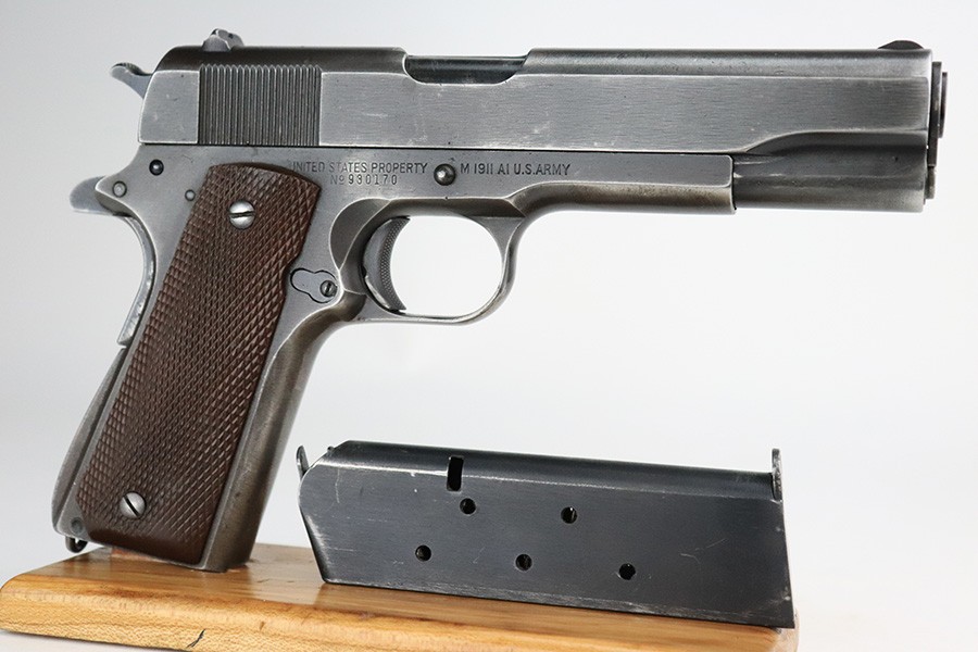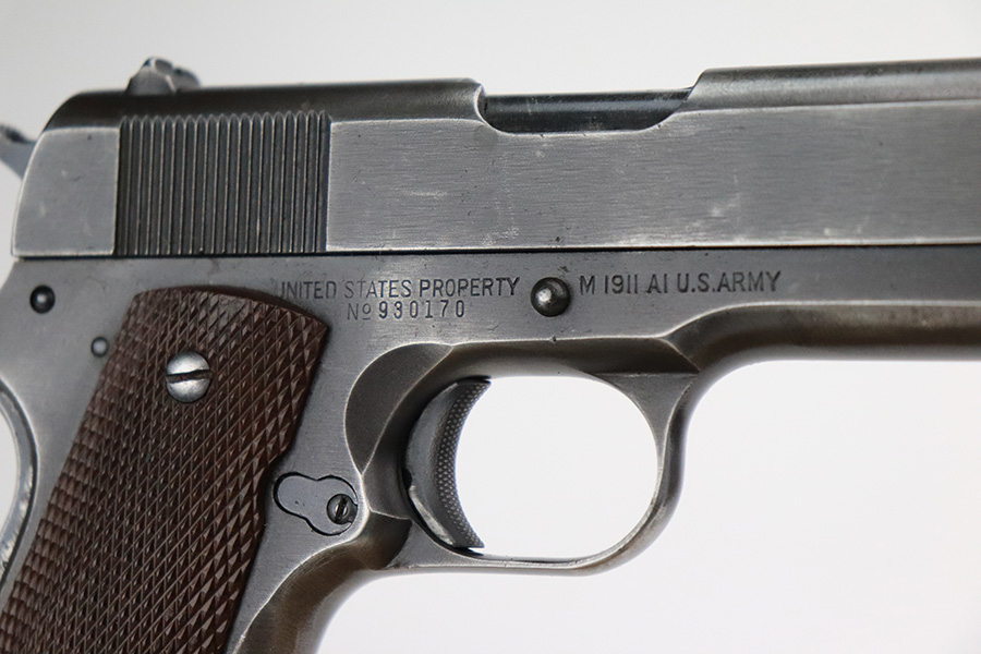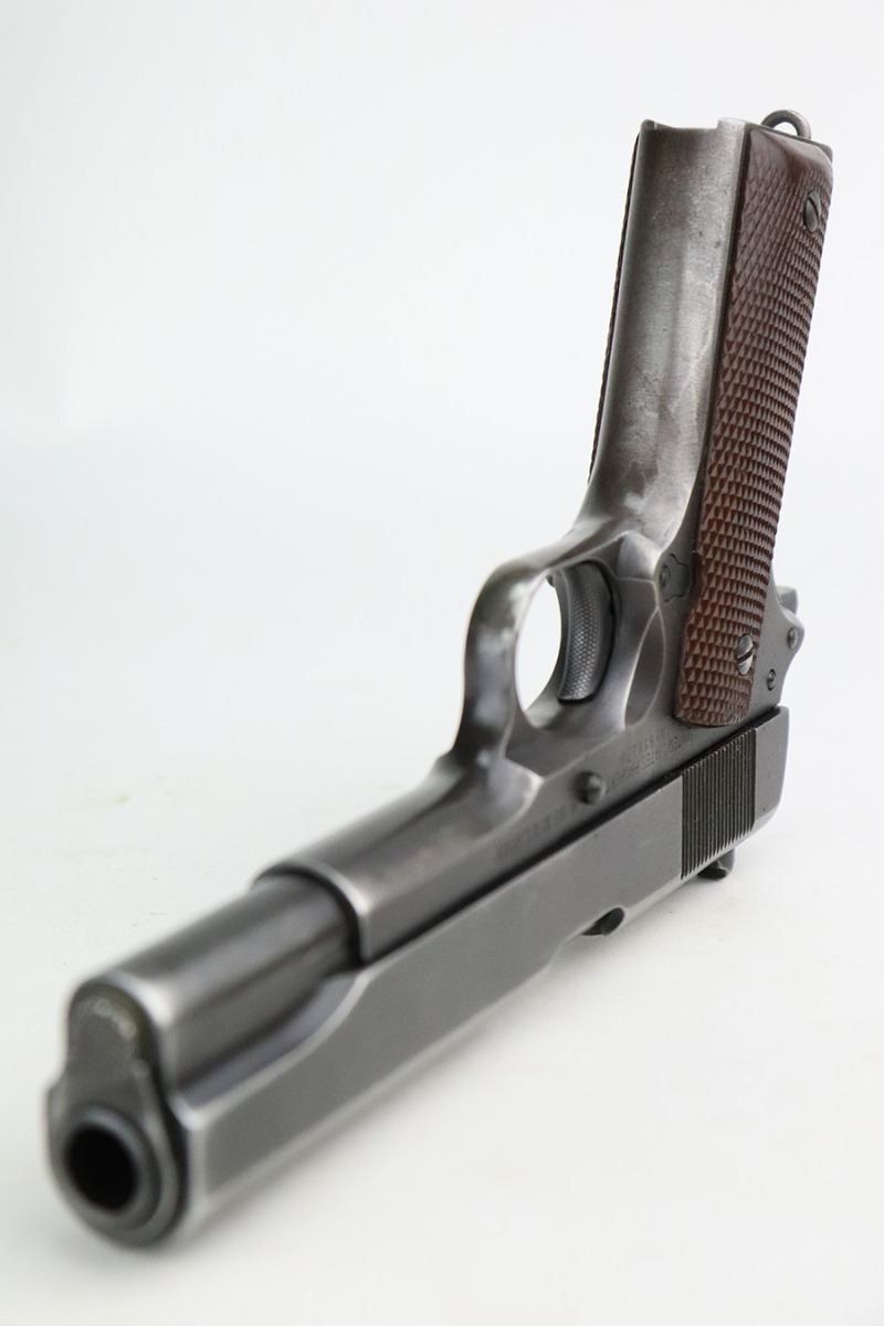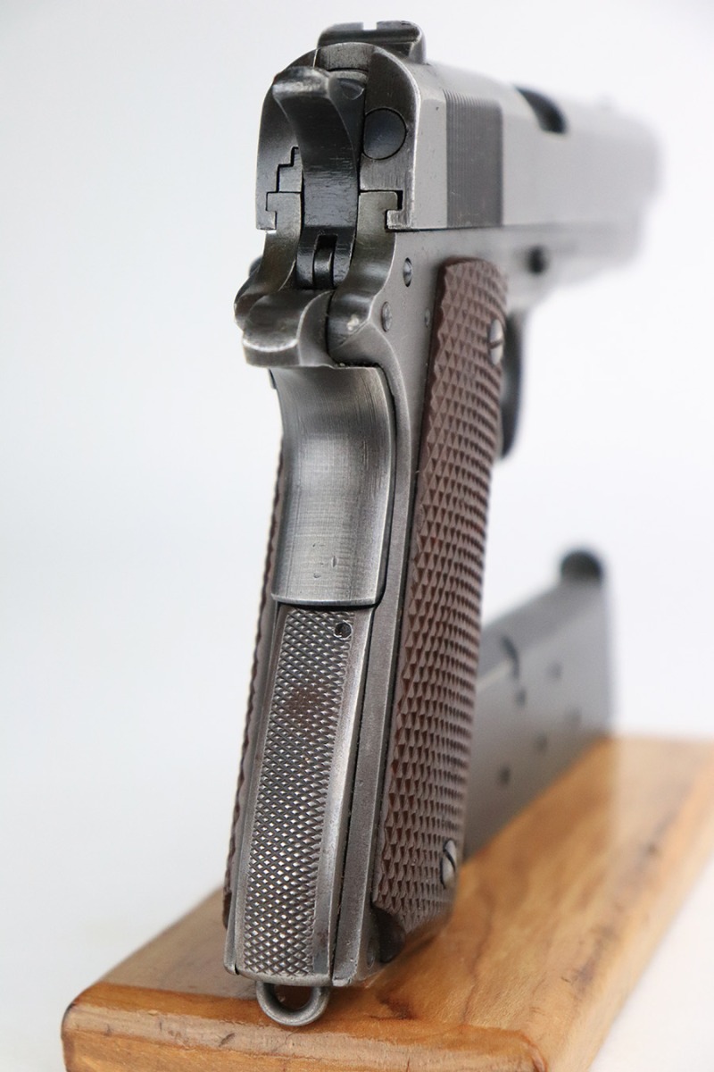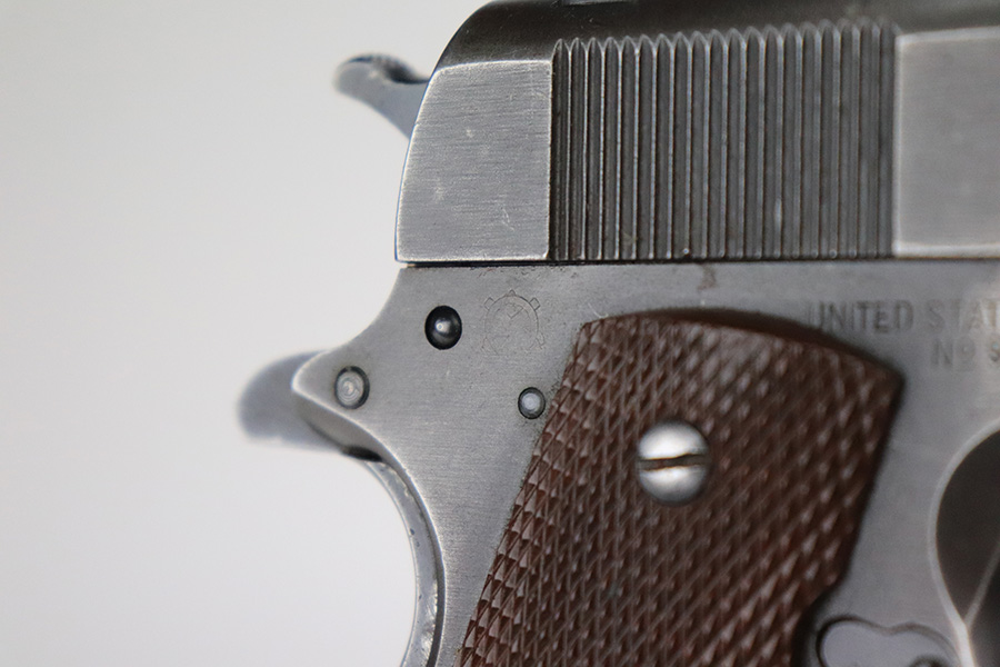 7/26/22 – This is a fairly scarce and desirable second variation Remington 1911A1 from late ’42 or early ’43. It has the proper slide variation where the legend extends past the slide stop, and it has a correct HS barrel. The parkerized finish is original with some thinning in a few areas, and was somewhat difficult to provide a percentage rating on. The grips show some smoothing, especially the left panel, but no cracks. ‘S’ marked magazine. Excellent bore that was seemingly well cared for.