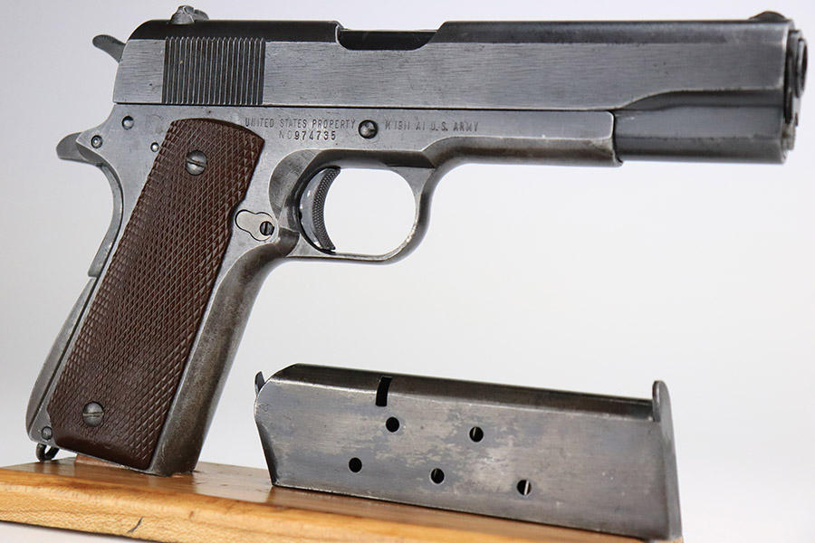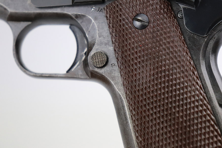 11/15/22 – This is an original example of a scarce, second variation Remington Rand 1911A1 from 1943. It has the proper 2nd variation slide with larger legend, and is in the correct serial range. It has about 70-80% of the original Dulite finish, with the most notable wear on the left side of the slide and the front strap. Correct HS barrel with good rifling but there is some minor pitting in the grooves. The original grips have smoothing on both panels. Postwar magazine marked ‘COLT .45 AUTO’ on the base.