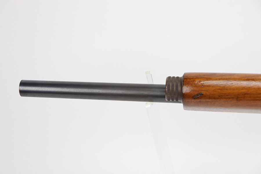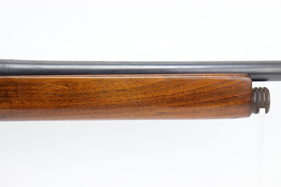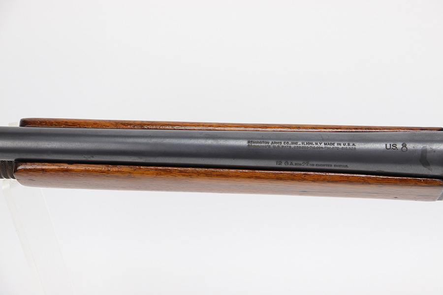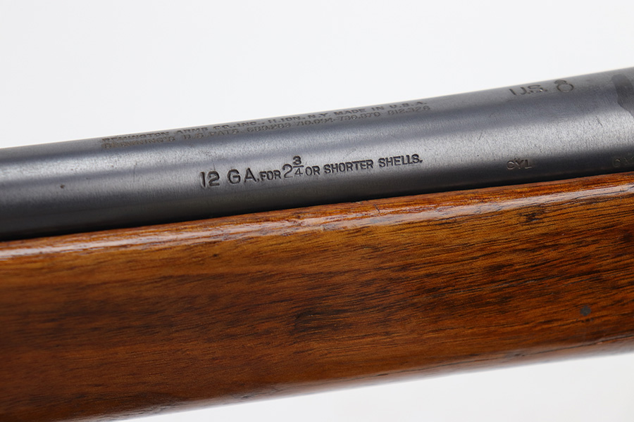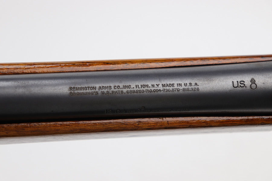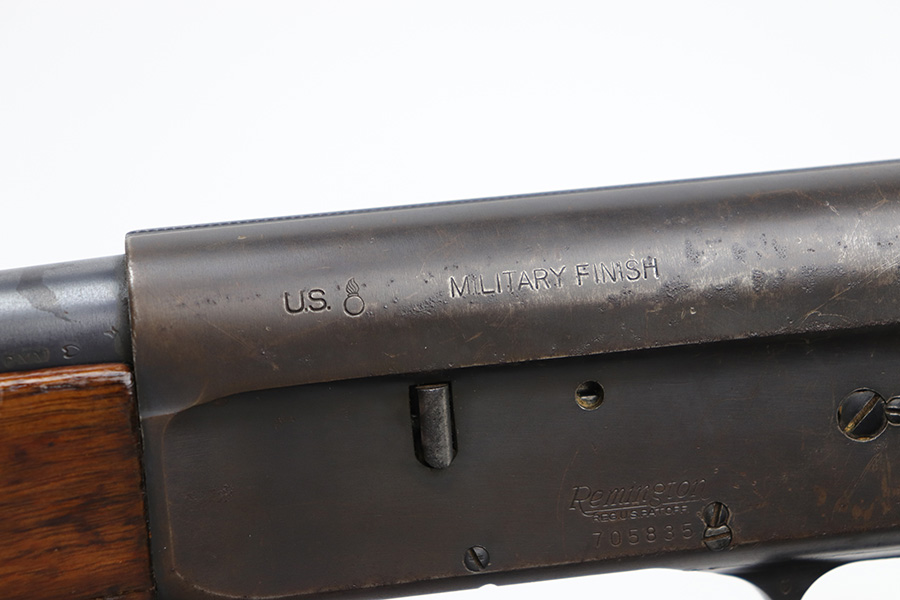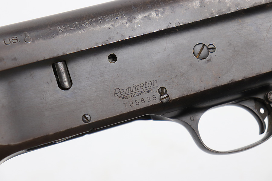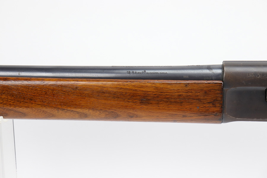 6/15/23 – This is a very nice example of a US Military issued Remington Model 11 riot shotgun. It has the proper military flaming bomb proofs and “US” property markings on the barrel and receiver. Extremely faint “FJA” inspection stamp on the left side of the butt stock, but the wood furniture has been lacquered and sanded, so it is very hard to see. The metal parts have retained about 90% of their original finish. There is not much actual finish loss, but there is general high edge wear, minor spotty wear and spotty oxidation on the left side of the receiver, and some areas of dark discoloration along the barrel. The wood furniture is generally nice, but there are two repaired cracks on the underside of the foregrip. Replaced butt plate. Near-mint bore.