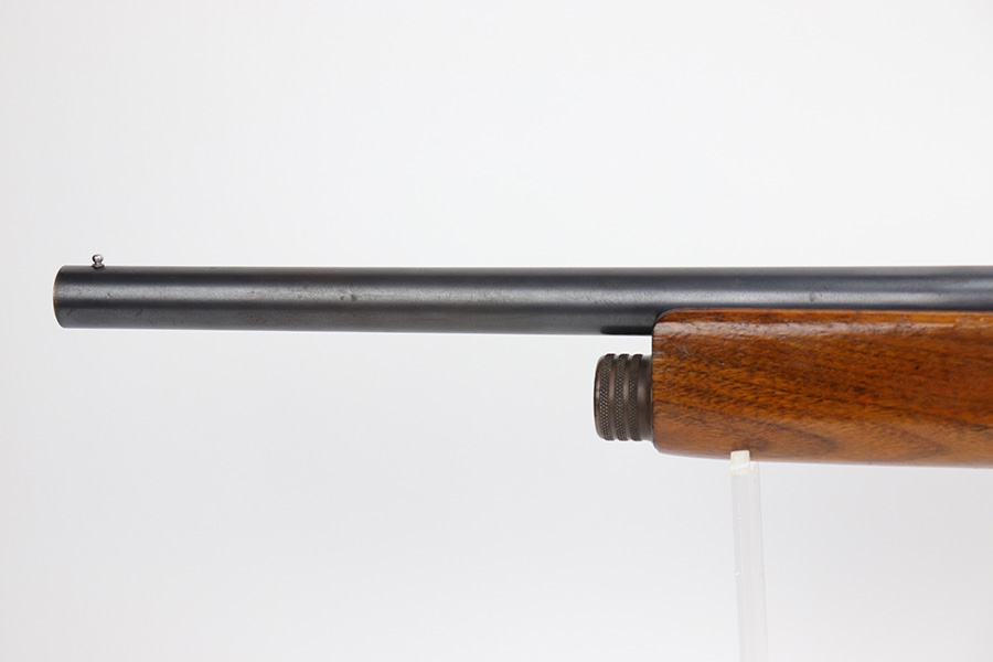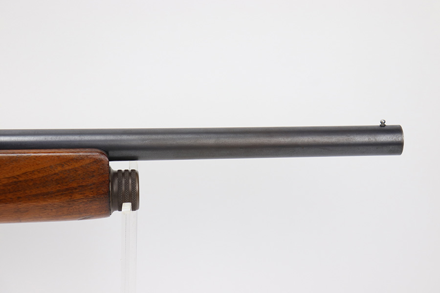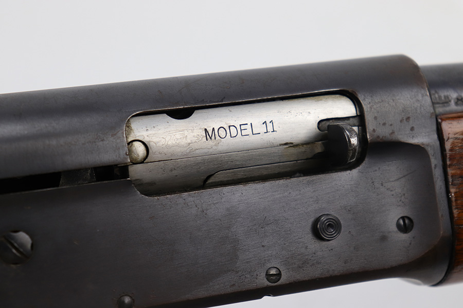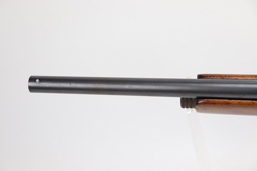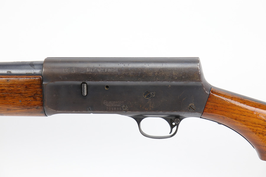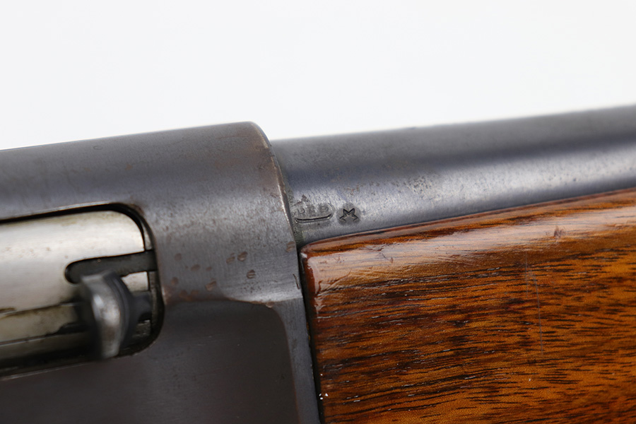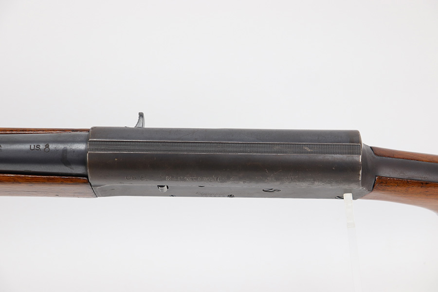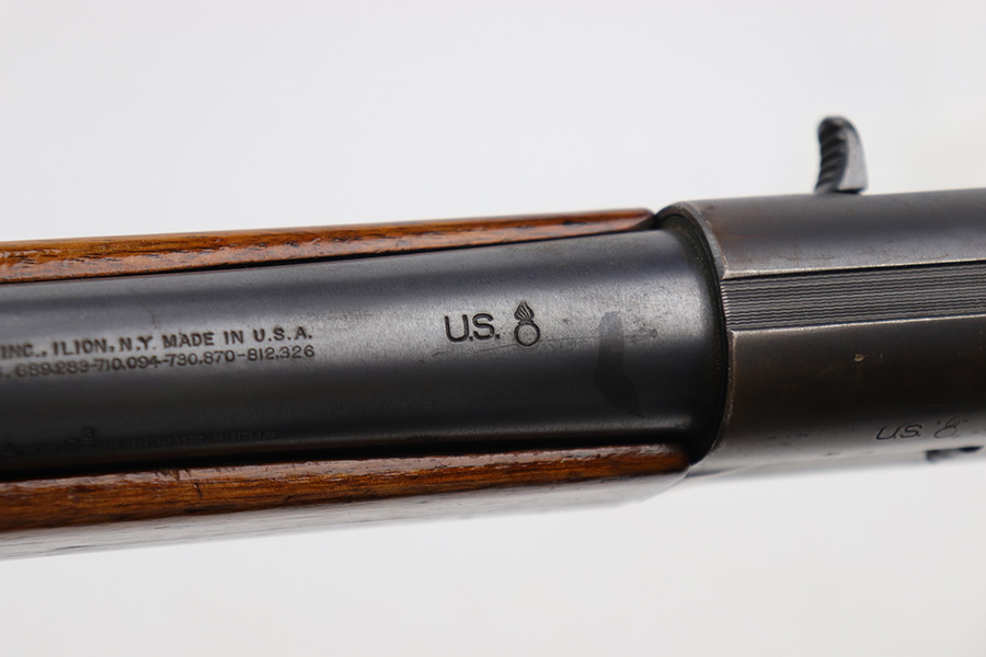 6/15/23 – This is a very nice example of a US Military issued Remington Model 11 riot shotgun. It has the proper military flaming bomb proofs and “US” property markings on the barrel and receiver. Extremely faint “FJA” inspection stamp on the left side of the butt stock, but the wood furniture has been lacquered and sanded, so it is very hard to see. The metal parts have retained about 90% of their original finish. There is not much actual finish loss, but there is general high edge wear, minor spotty wear and spotty oxidation on the left side of the receiver, and some areas of dark discoloration along the barrel. The wood furniture is generally nice, but there are two repaired cracks on the underside of the foregrip. Replaced butt plate. Near-mint bore.