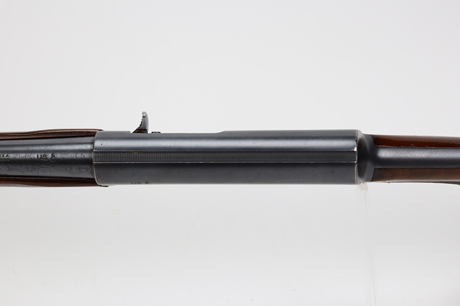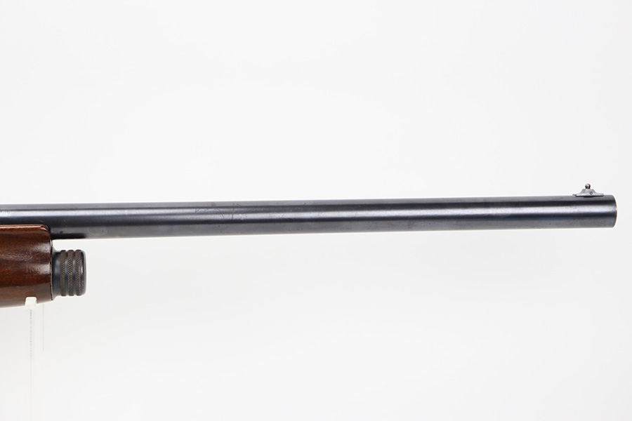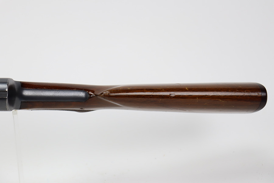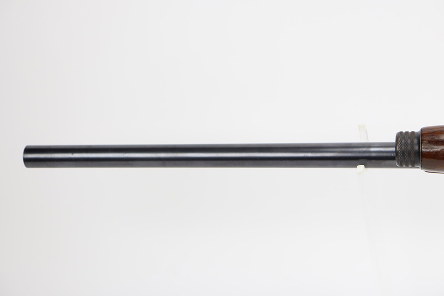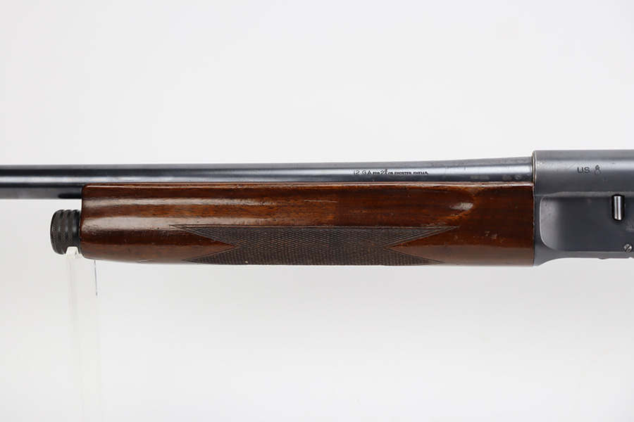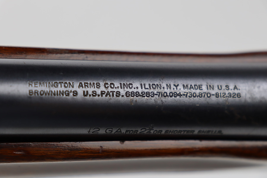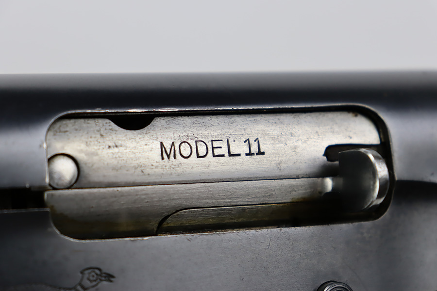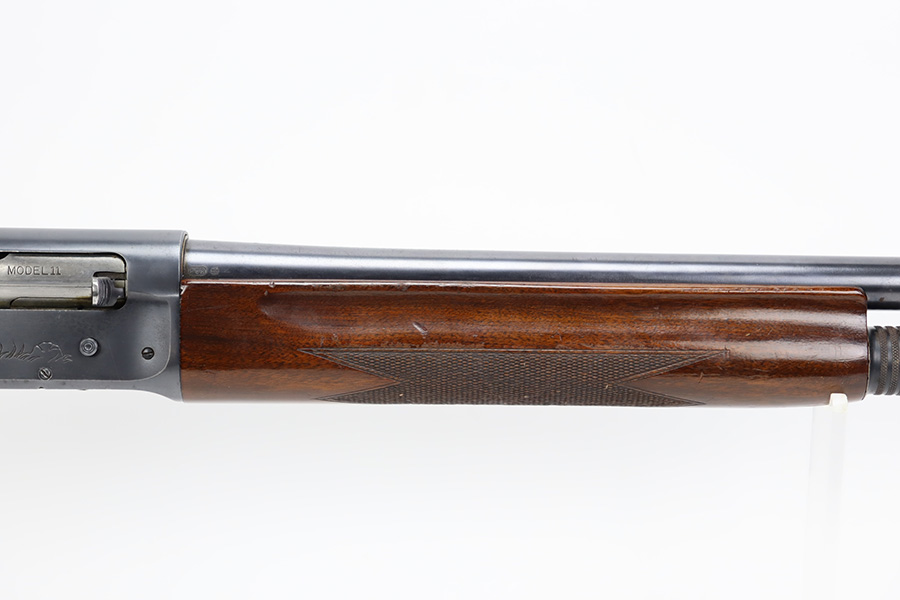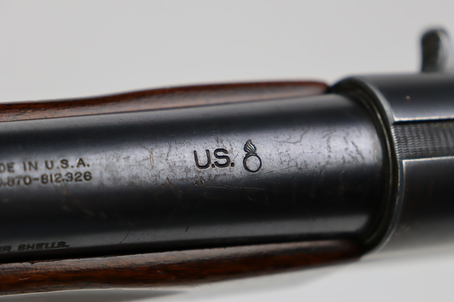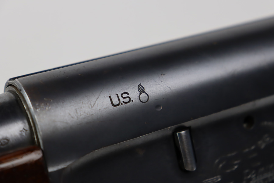 10/2/23 – This is a very nice example of a US Military issued Remington Model 11 riot shotgun. It has the proper military flaming bomb proofs and “US” property markings on the barrel and receiver. There is also a clear “FJA” inspection stamp and cross-canon cartouche on the left side of the butt stock. The metal parts have retained about 96% of their original finish. While there is very little actual finish loss, there is noticeable scratching on the receiver and on the barrel where it meets the receiver. Minor high edge wear in general. The wood is nice overall, but there are tiny dings and scratches throughout. Mint bore.