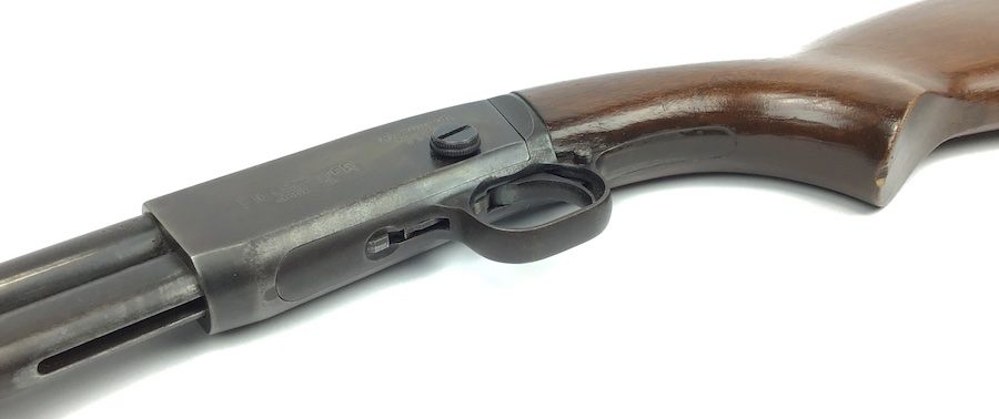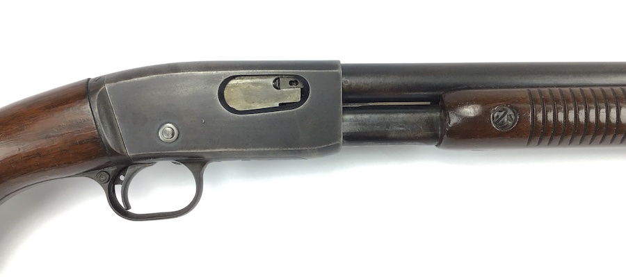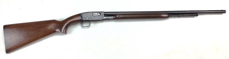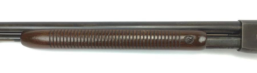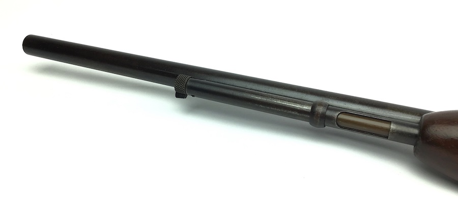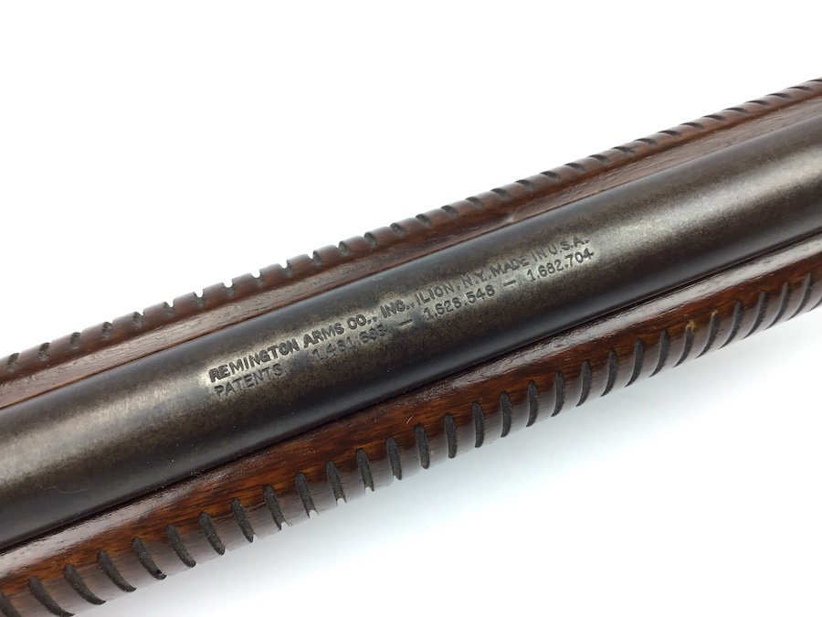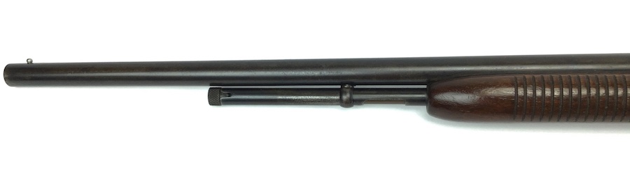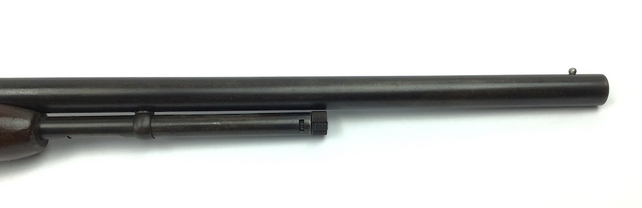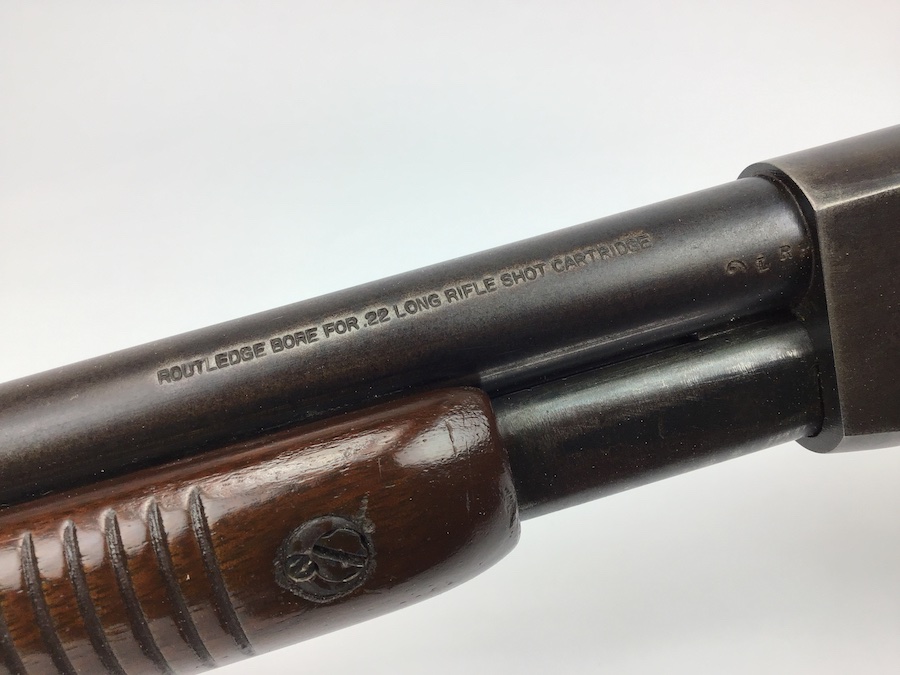 8/8/20 – This unique Remington model was made for trap shooting and was sometimes sold in kits with the “Moskeeto” clay bird thrower. There were approximately 3000 of this model manufactured. This rifle takes .22 cal shot loads and has the rare Routledge smooth bore barrel. This package includes the gun, clay thrower and approximately 50 rounds of .22 cal shot shells. Mechanically sound and completely functional. This beautiful piece has about 85 – 90% original bluing with hardwood stock an pump handle. Believed to be all original. The left side of the barrel is stamped “ROUTLEDGE BORE FOR .22 LONG RIFLE SHOT CARTRIDGE”, and the Remington Field Master markings on the left side of the receiver. Checkered Remington butt plate. Excellent bore.