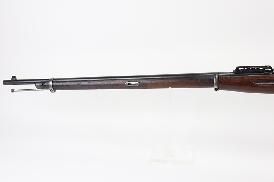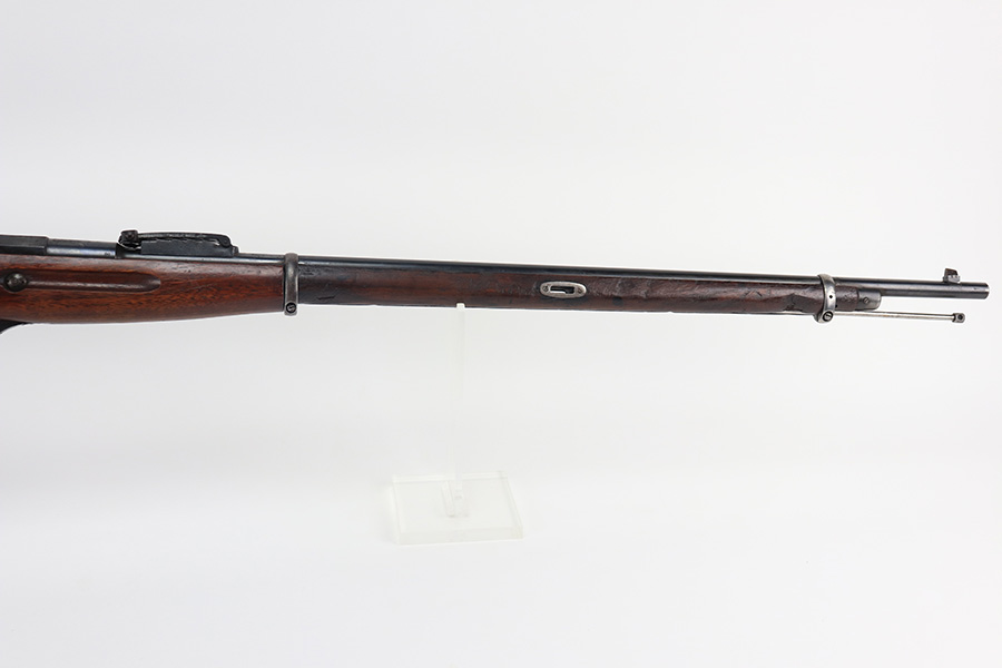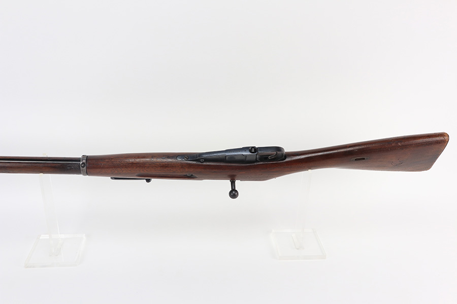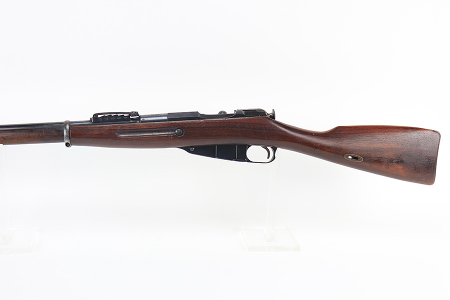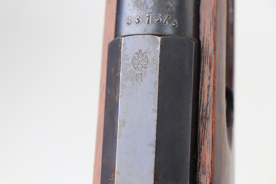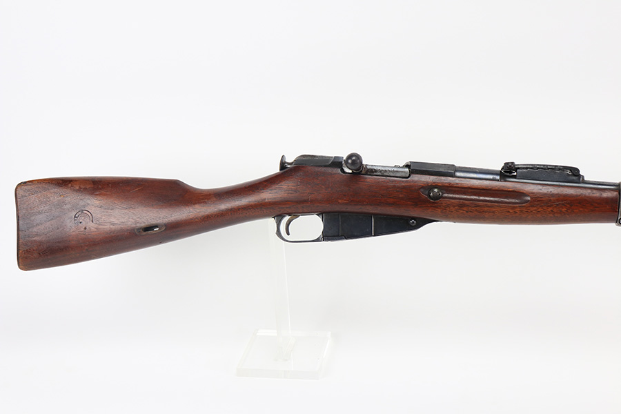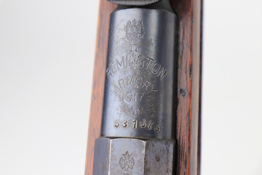 2/15/22 – This is a scarce Remington Armory Mosin-Nagant M1891 pattern rifle from 1917. During World War I, Russia could not keep up with the military demand for rifles, so they order over a million M1891 Mosin-Nagants from Remington Armory with matching bayonets. Remington had produced just under eight hundred and fifty thousand guns between 1915 and 1917 with only a little more than one hundred and thirty thousand having reached Russia by January of that year and of the seven hundred seventy thousand guns Westinghouse made, a quarter-million of those had made it to its destination by the time the Tsar’s government was overthrown the next month. A period of chaos broke out and by the time the Bolsheviks took charge, they defaulted on their contract to Remington and Westinghouse, claiming the guns were substandard, which was hardly the case. The U.S. Government then stepped in and bought the remaining inventory, and this example bears the original (but faint) flaming bomb and U.S. marking on the stock. In 1918, the U.S. Army designated the M1891s as the Russian Three-Line Rifle and they were marked with that bomb and eagle insignia. This particular example is original and has matching receiver, magazine, and buttplate. The bolt is correct for this model but is a mismatched example. Nice blued finish throughout, with a little freckling and oxidation along the top of the receiver. Stock is in good shape but was duffel cut many years ago, though the rear band holds it confidently in place. Fairly crisp Russian cartouche is still visible on the right side with the Romanof Eagle present. Bore has strong rifling but deep frost throughout and could use a thorough cleaning.