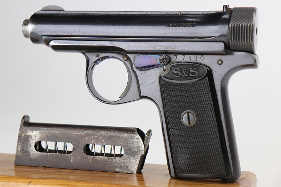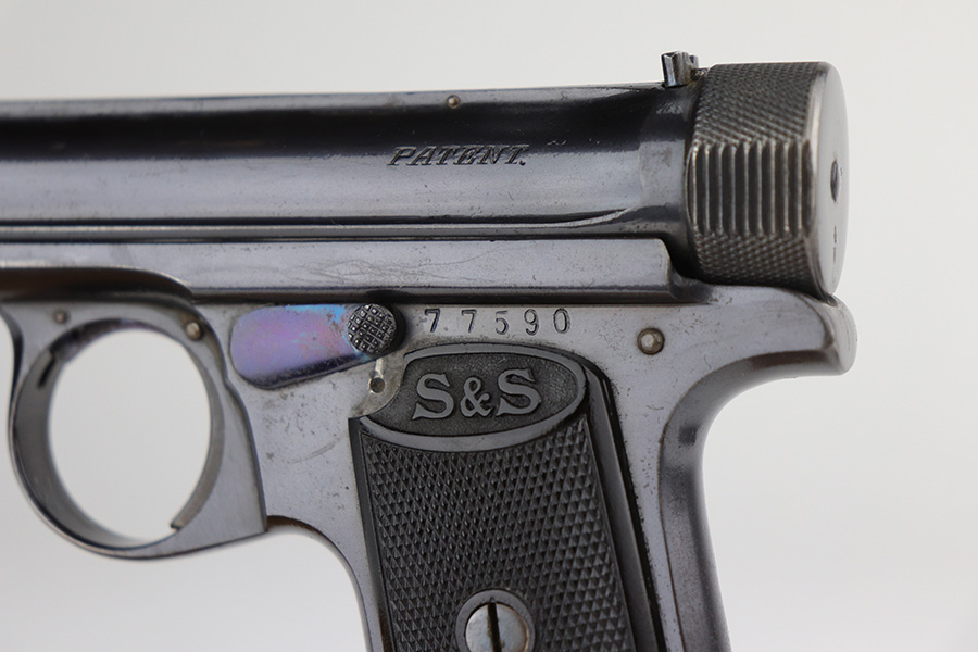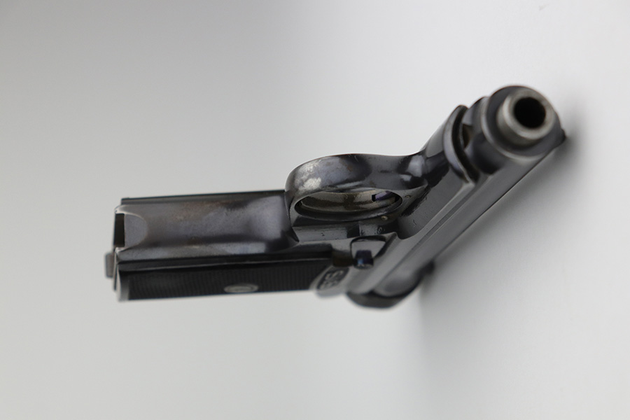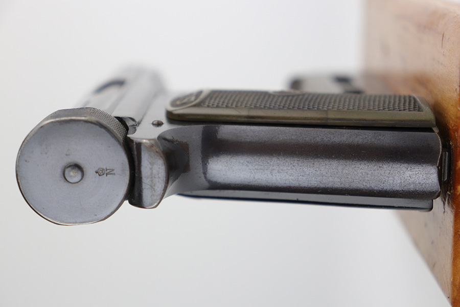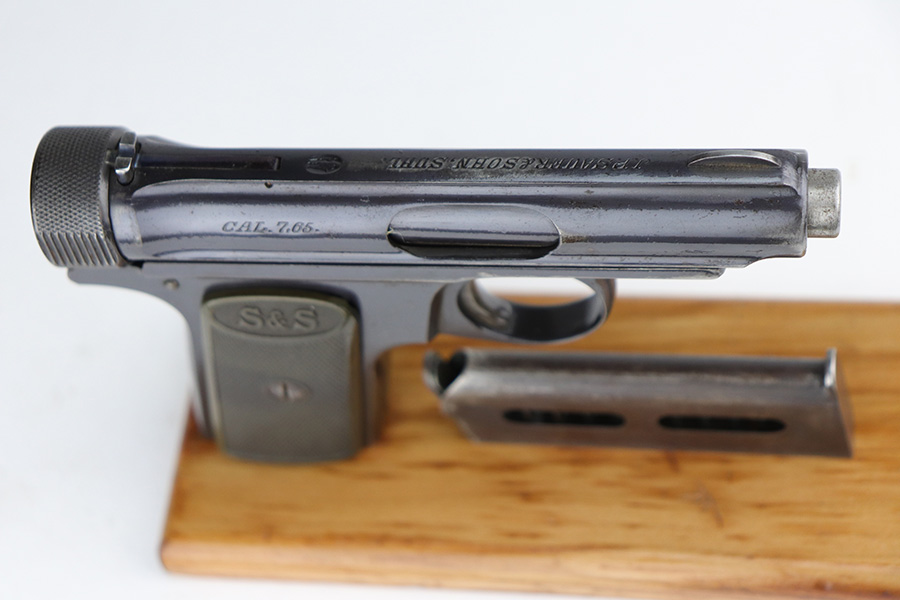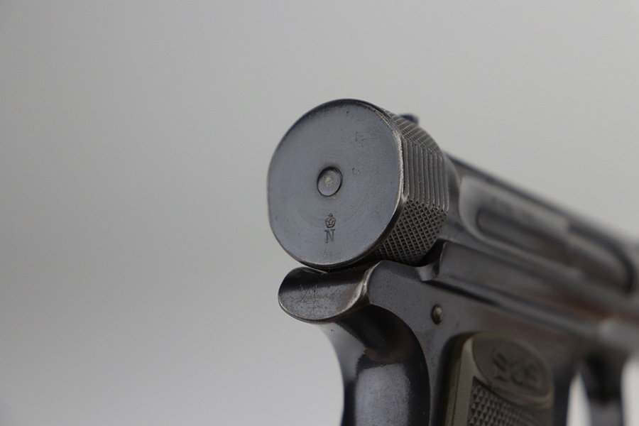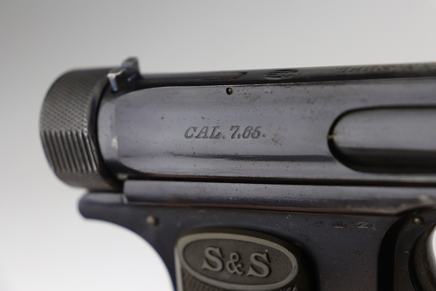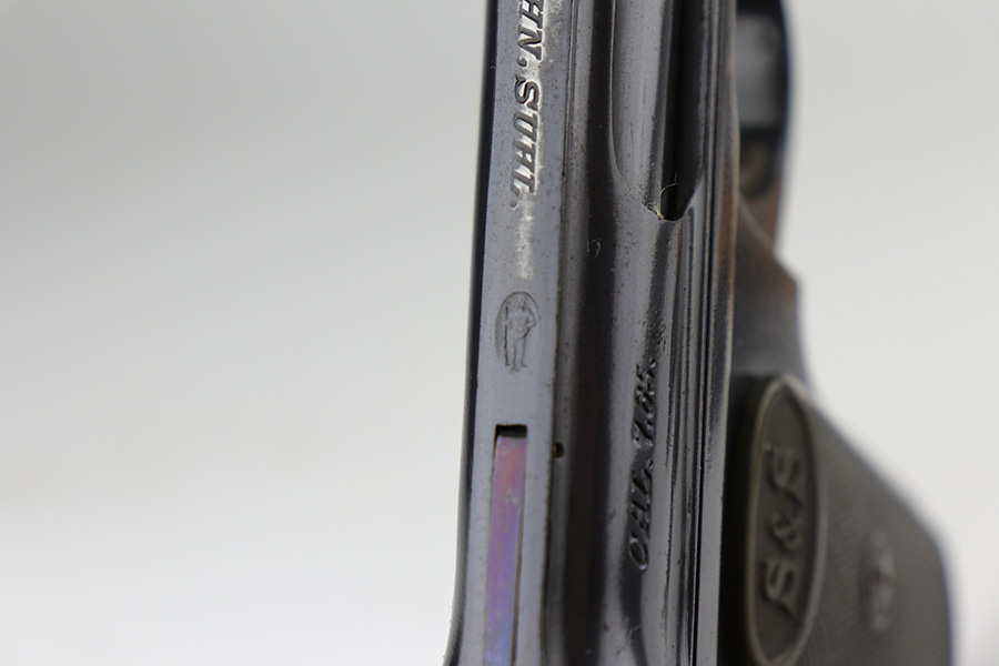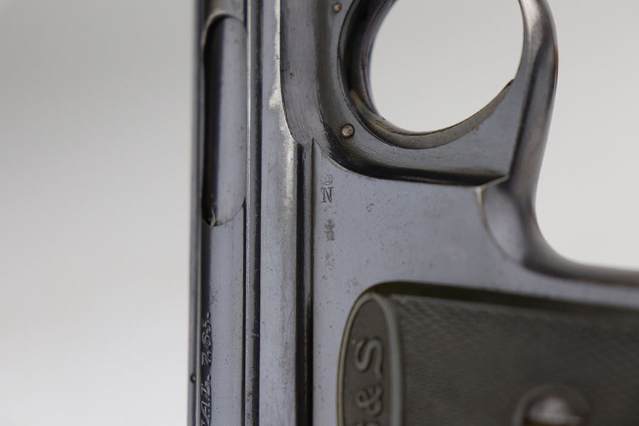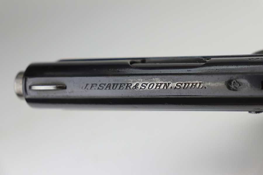 9/21/21 – This is a scarce Sauer Model 1913 that is Imperial proofed, indicating it was issued to the German Army during World War I. Only 30,000 such examples were produced, but they have a low survival rate and we very rarely see them. This one is all original with maybe 92% of the blue remaining. High edge wear around muzzle and on the frame rails. Grip frame also has minor oxidation throughout. Strong, shiny bore. Excellent grips.