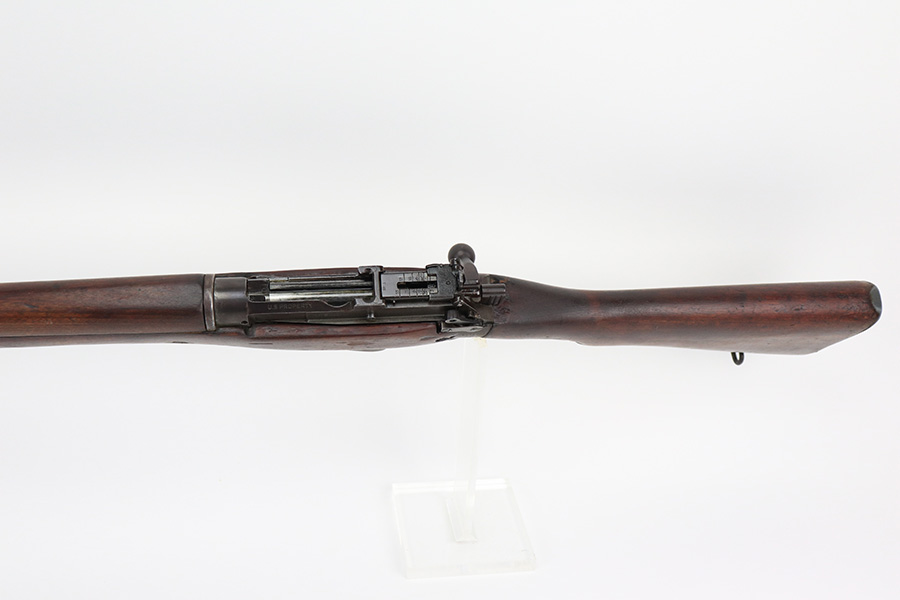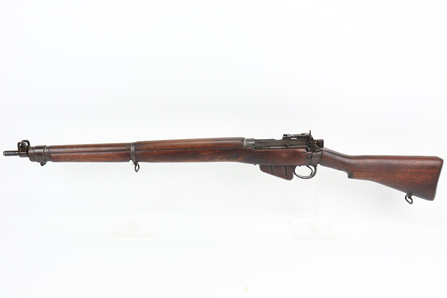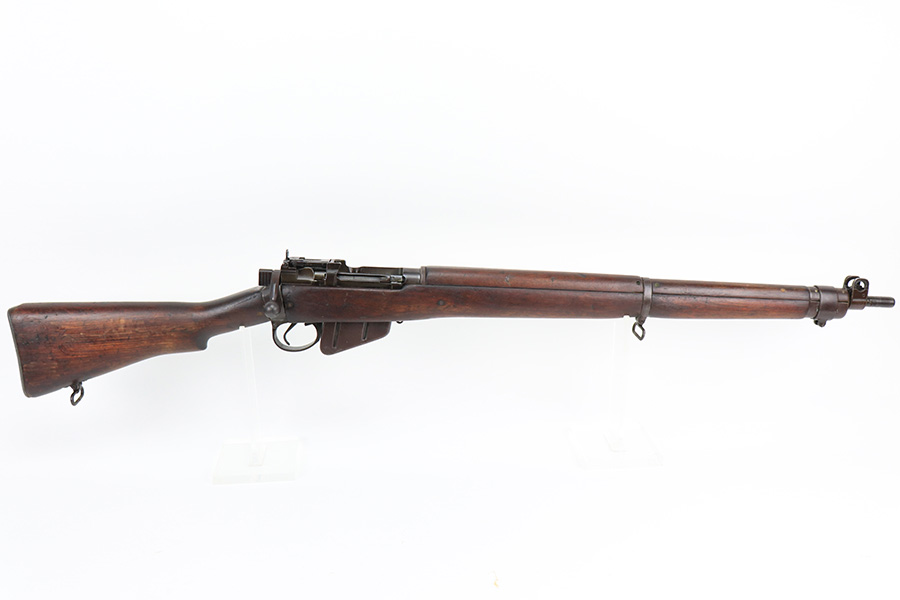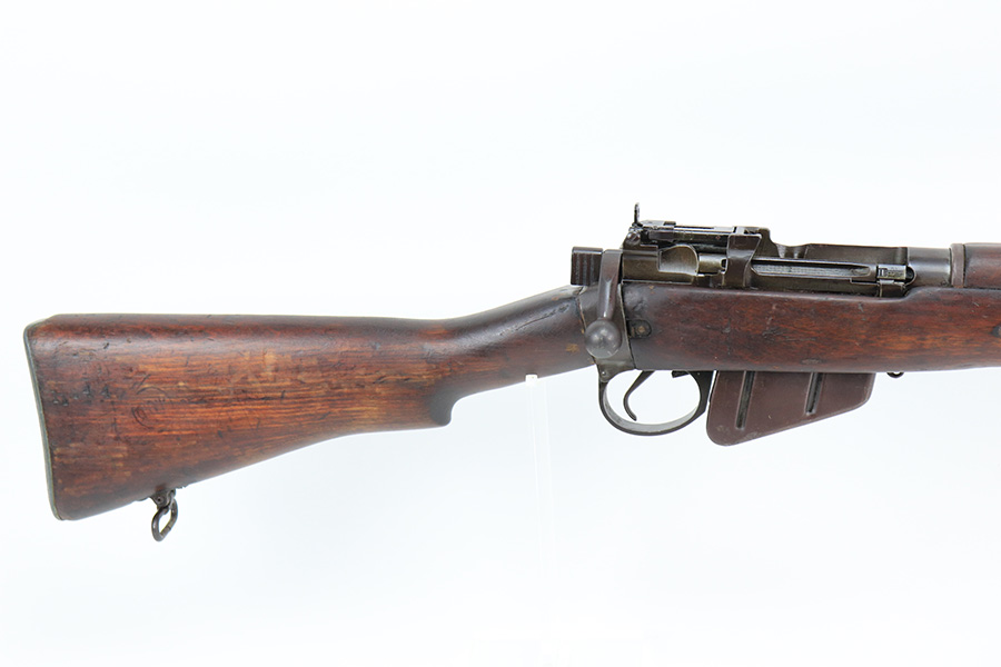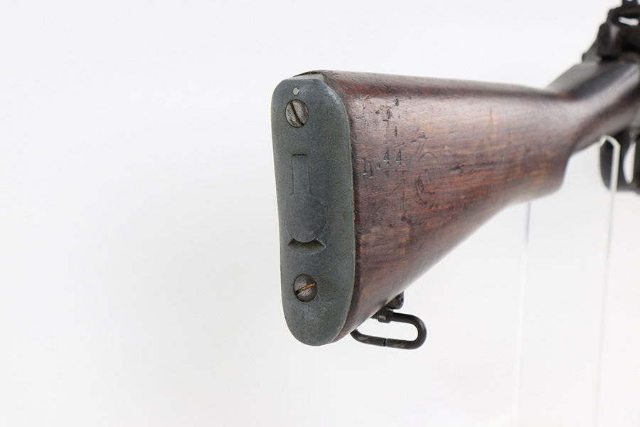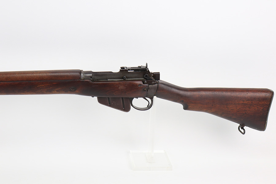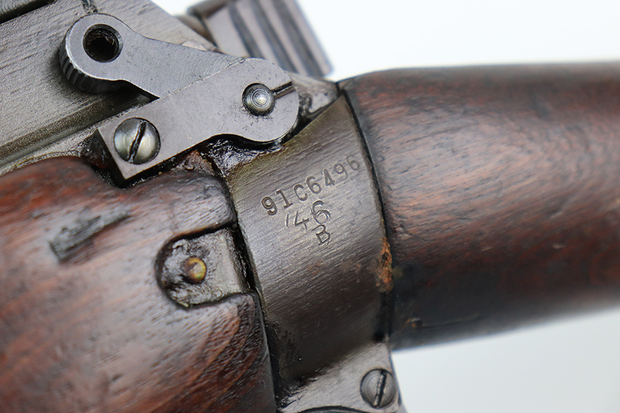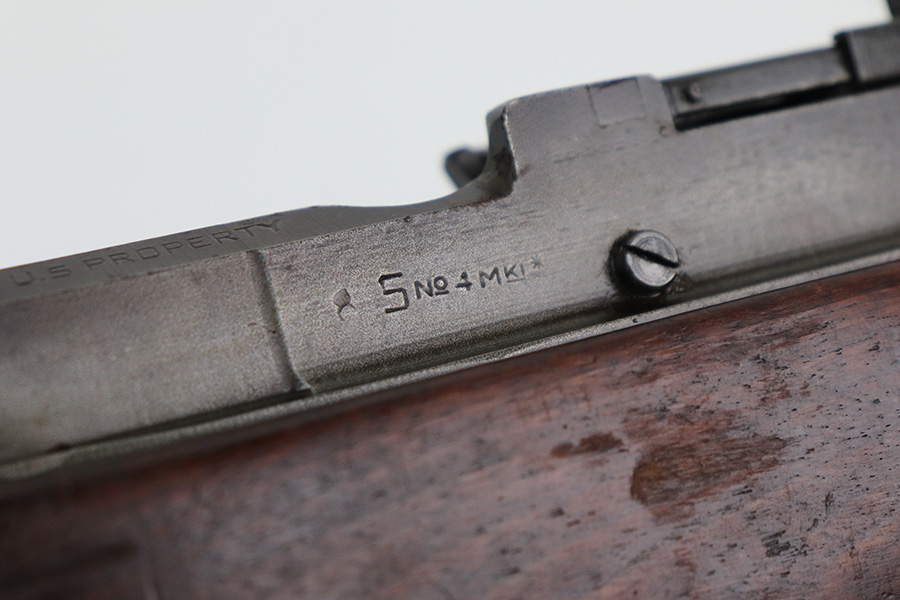 5/6/22 – This is a very nice example of a scarce Enfield No 4 Mk 1* made by Savage in 1944. These guns were manufactured in the US during WW2 to assist England as a part of the Lend-Lease Program between England and the US. These guns are “US Property” marked and have US military flaming bomb and “P” proofs. The small parts are marked with a Savage “block S”. This one is all matching and has all of the proper markings. Very small import mark on the underside of the barrel. There isn’t much actual finish loss, but there is brown patina covering all of the metal parts. Some minor thinning on the sides of the receiver. The stock is numbered on the underside, just behind the front barrel band. The numbering is matching but very faint, so we believe the stock was lightly sanded. The right side of the stock has a faint circular marking and is dated November of 1944. The bore has good rifling with minor pin-pricking throughout.