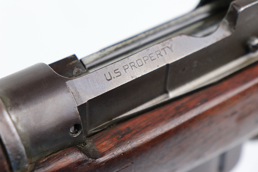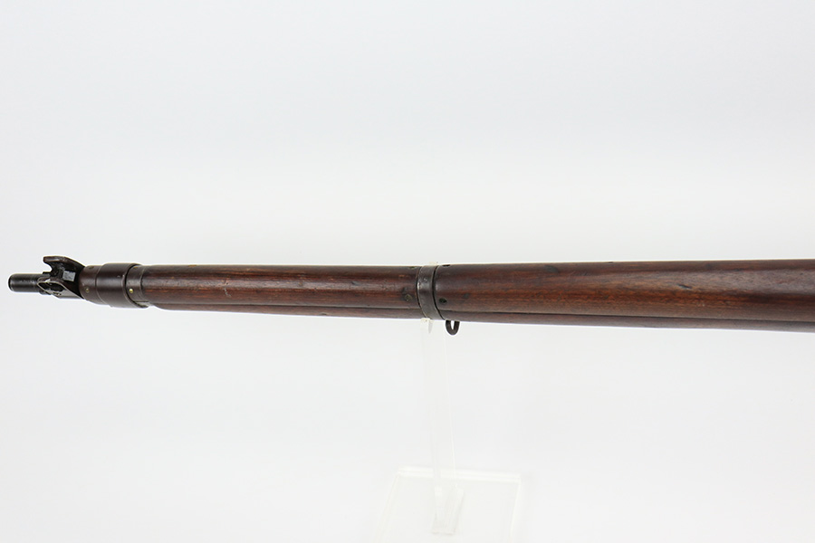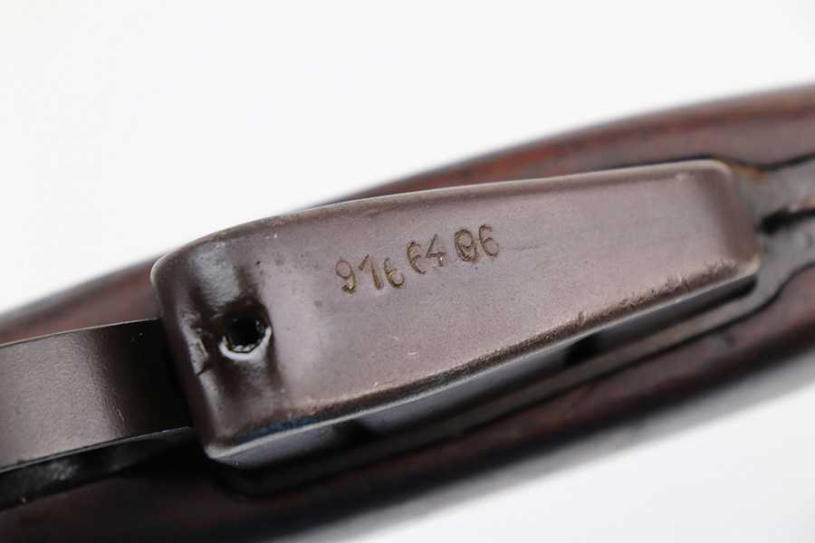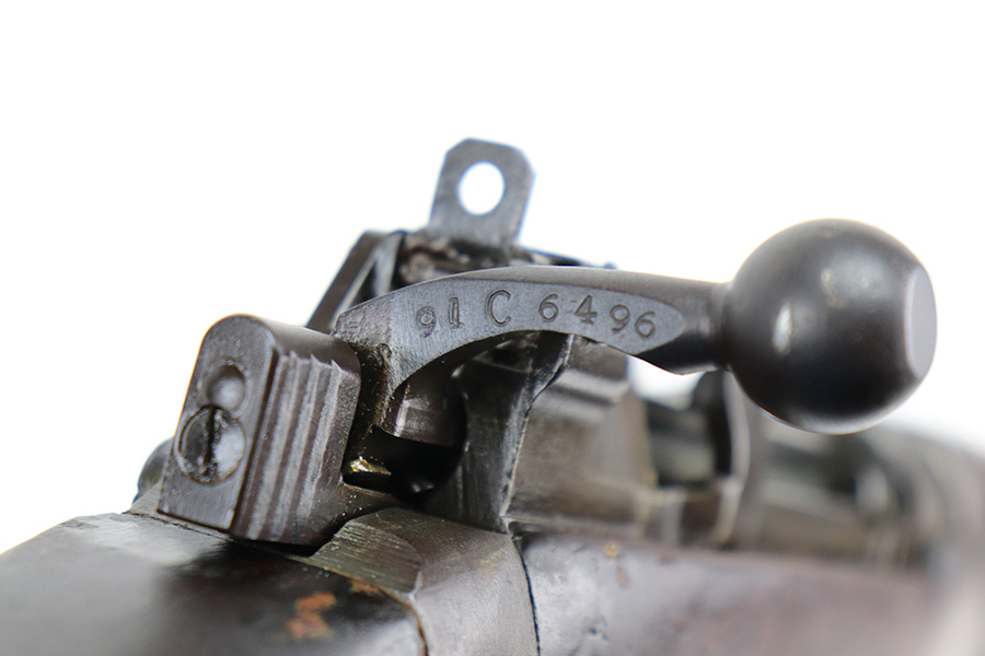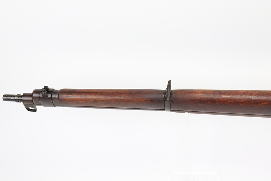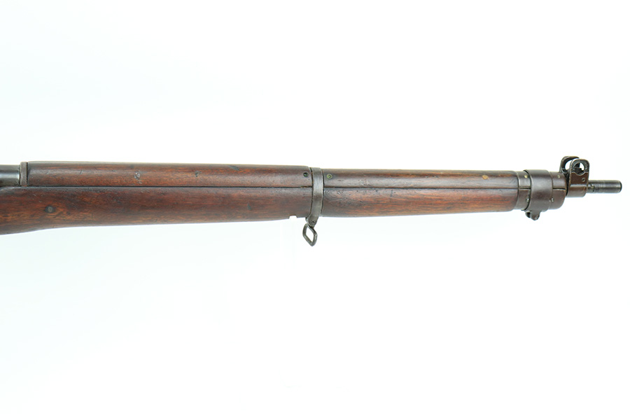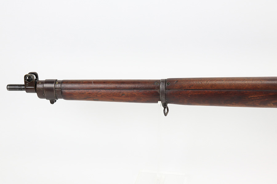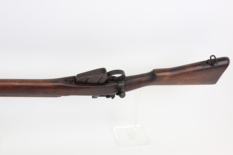 5/6/22 – This is a very nice example of a scarce Enfield No 4 Mk 1* made by Savage in 1944. These guns were manufactured in the US during WW2 to assist England as a part of the Lend-Lease Program between England and the US. These guns are “US Property” marked and have US military flaming bomb and “P” proofs. The small parts are marked with a Savage “block S”. This one is all matching and has all of the proper markings. Very small import mark on the underside of the barrel. There isn’t much actual finish loss, but there is brown patina covering all of the metal parts. Some minor thinning on the sides of the receiver. The stock is numbered on the underside, just behind the front barrel band. The numbering is matching but very faint, so we believe the stock was lightly sanded. The right side of the stock has a faint circular marking and is dated November of 1944. The bore has good rifling with minor pin-pricking throughout.