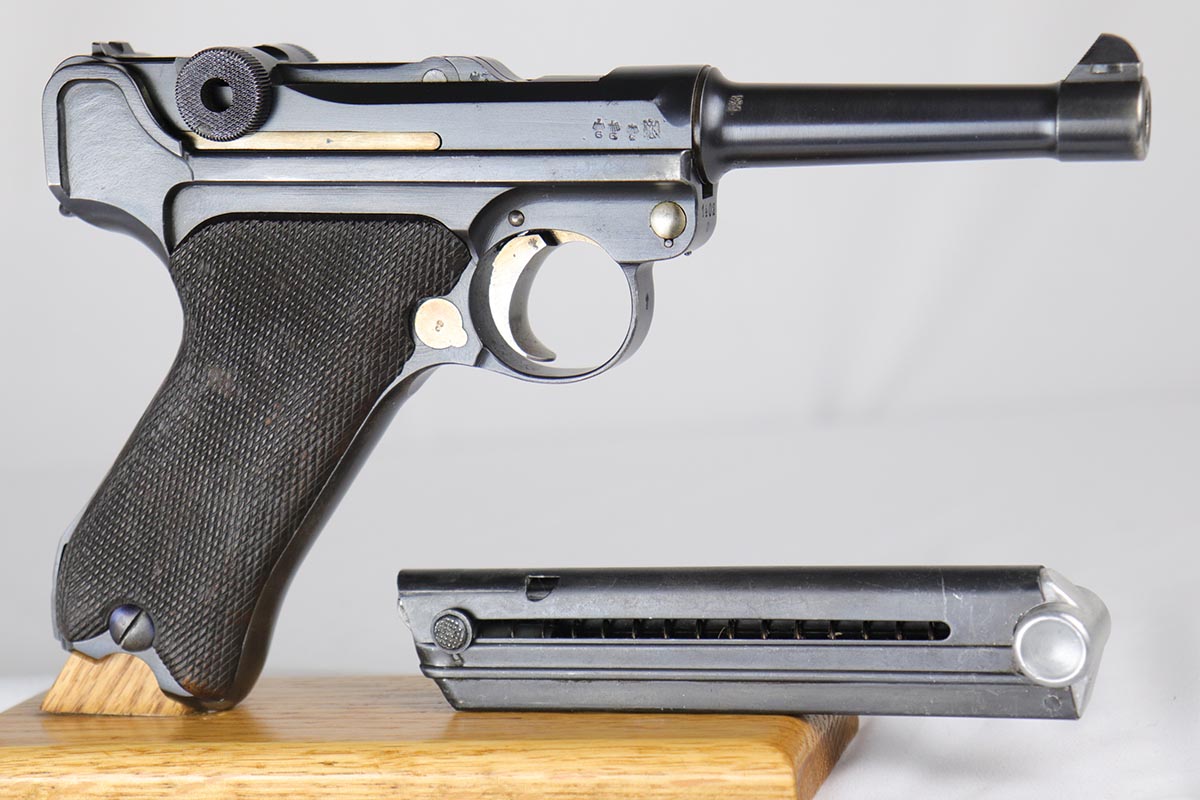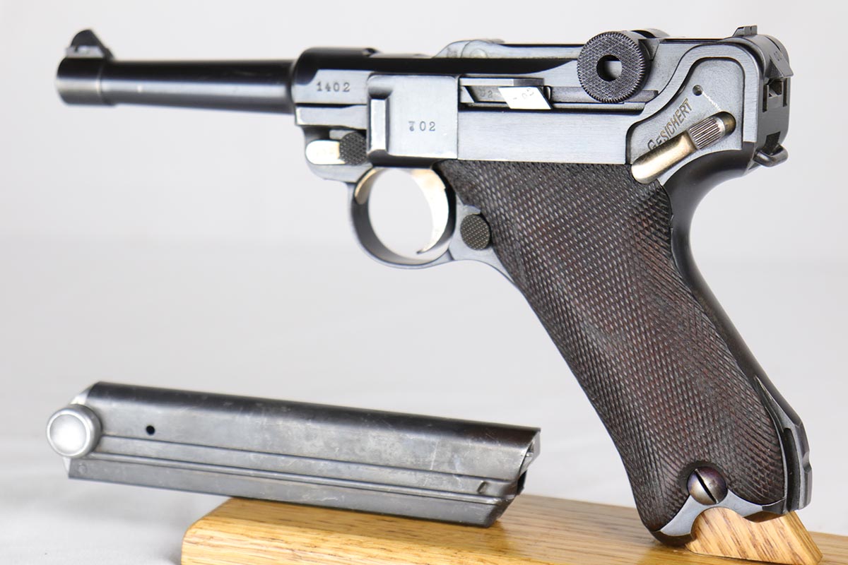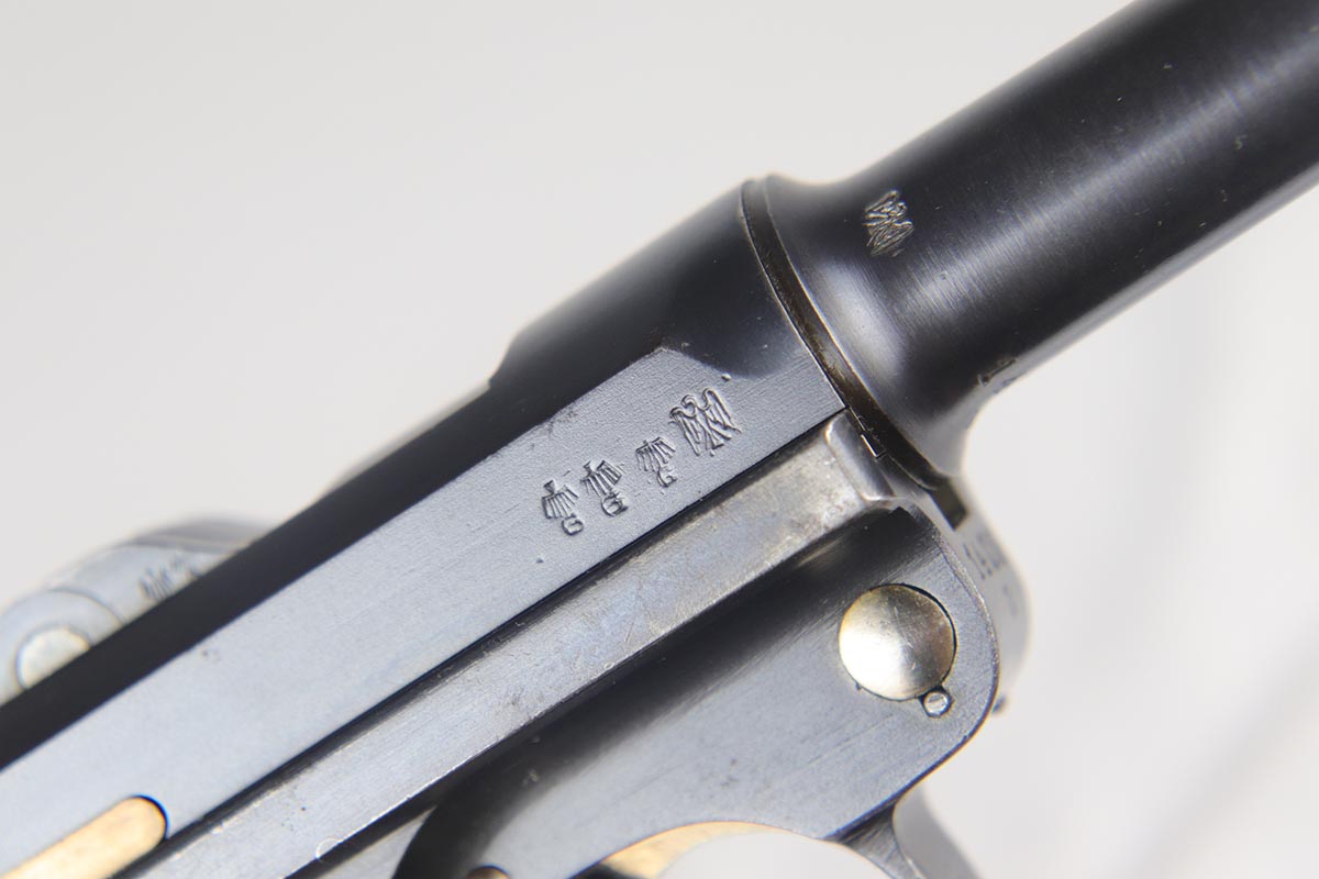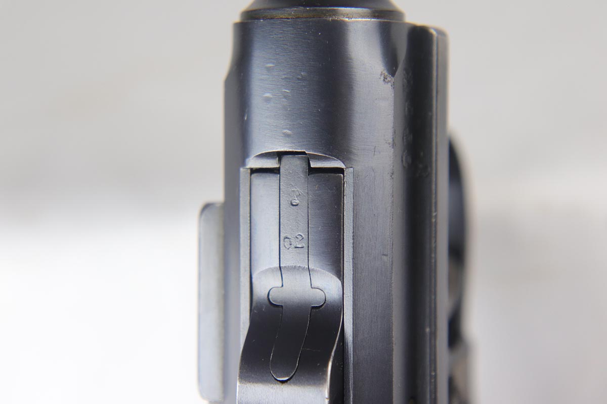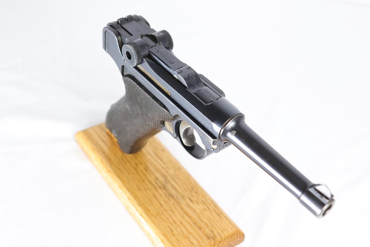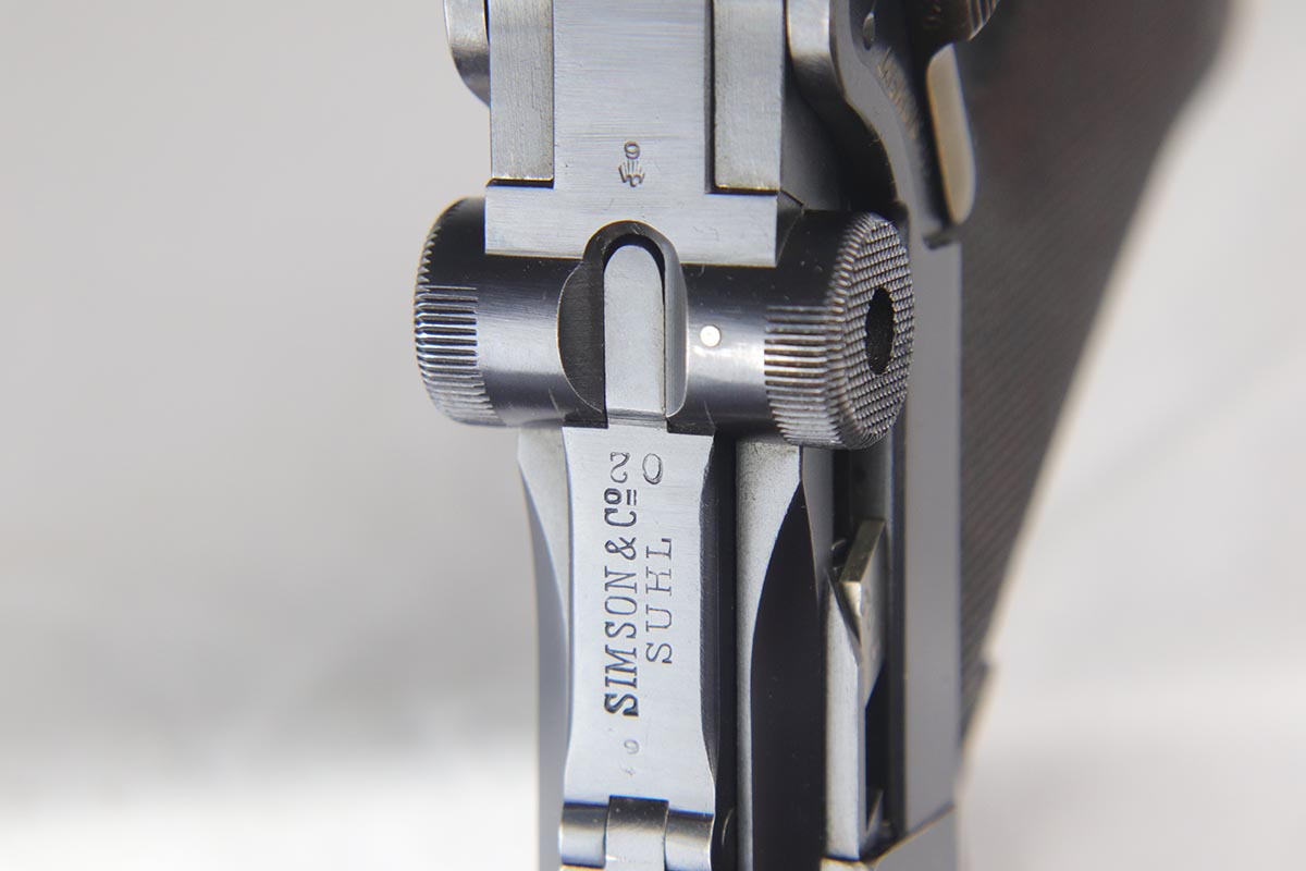 7/12/18 – This is a scarce, excellent Simson military luger from the 1930s.  All numbered parts are matching and original, including the grips.  The finish rates at 95+% with minor edge wear, mainly on the sideplate and left side of the muzzle.  The straps also show some patina coming through.  The small parts show very nice original straw, rating at maybe 80-90%.  Small parts are also Simson proofed, even down to the grip screws.  The grips are numbered and matching to the gun but were renumbered at some point.  The magazine is unmarked.  Strong, shiny bore.