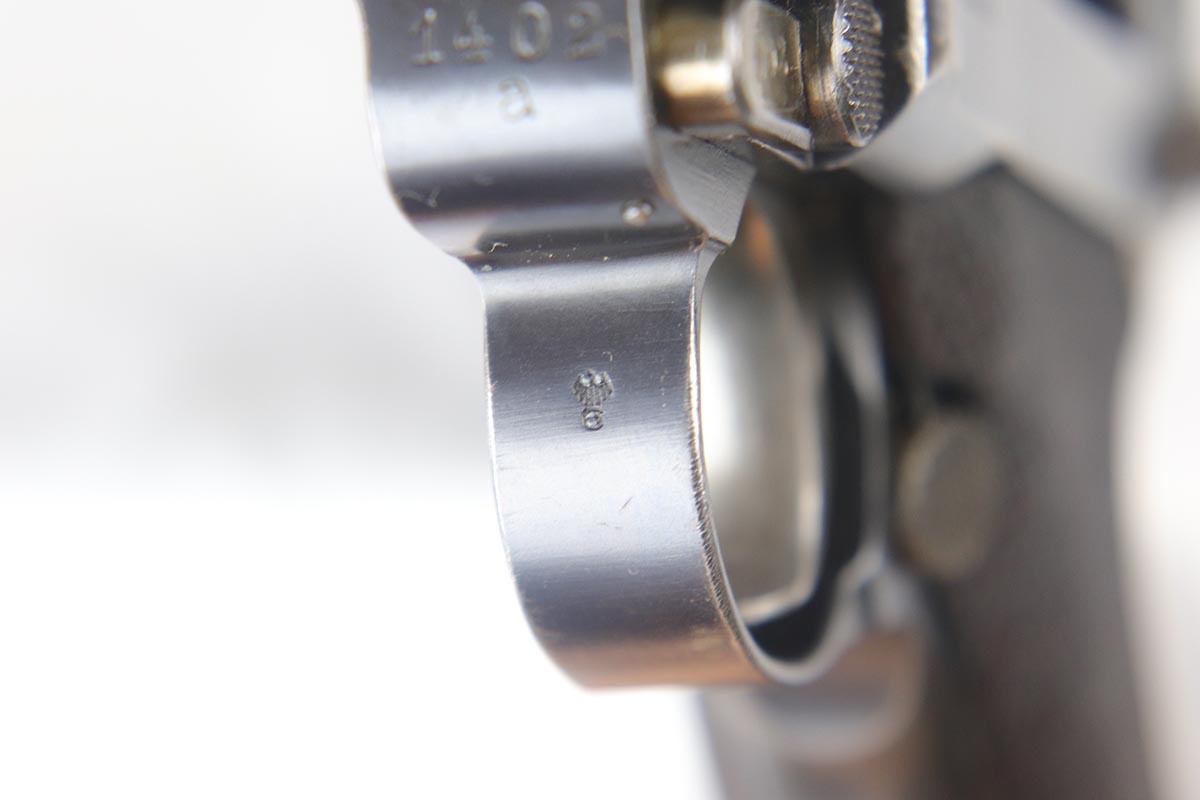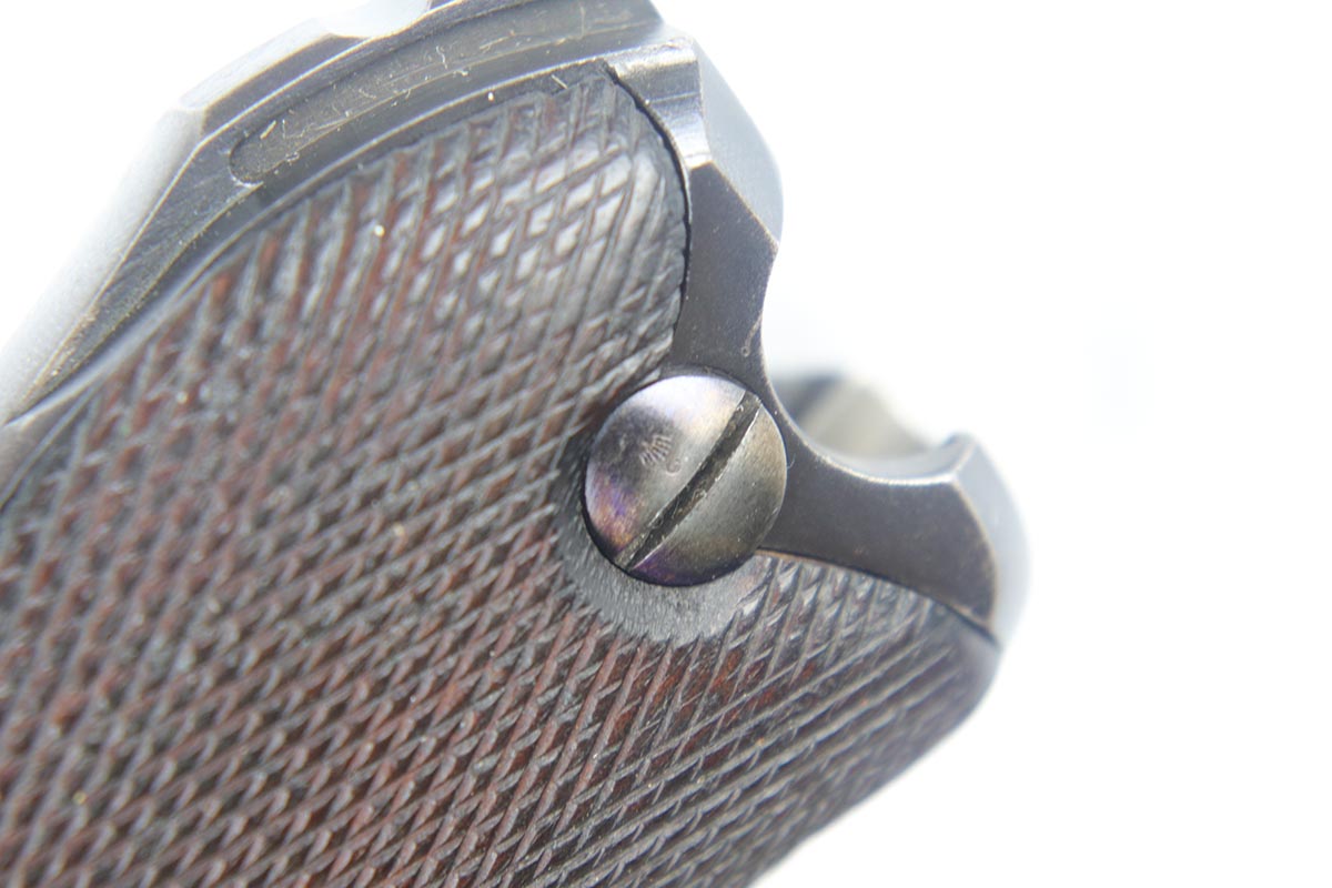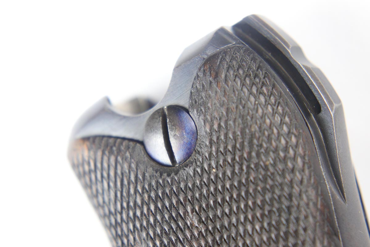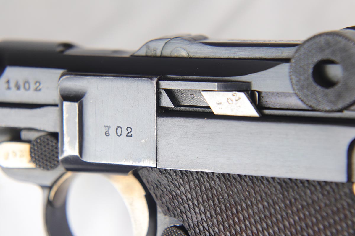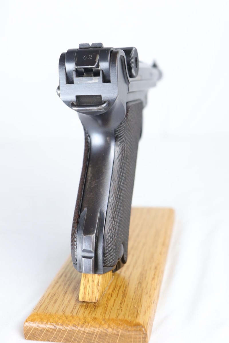 7/12/18 – This is a scarce, excellent Simson military luger from the 1930s.  All numbered parts are matching and original, including the grips.  The finish rates at 95+% with minor edge wear, mainly on the sideplate and left side of the muzzle.  The straps also show some patina coming through.  The small parts show very nice original straw, rating at maybe 80-90%.  Small parts are also Simson proofed, even down to the grip screws.  The grips are numbered and matching to the gun but were renumbered at some point.  The magazine is unmarked.  Strong, shiny bore.