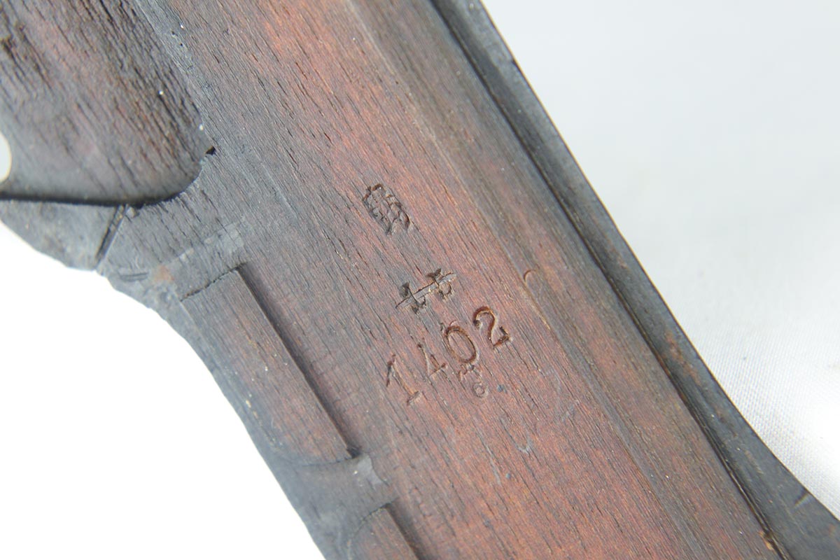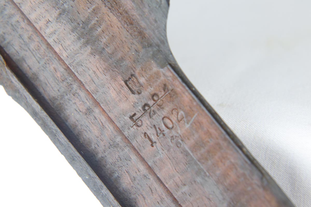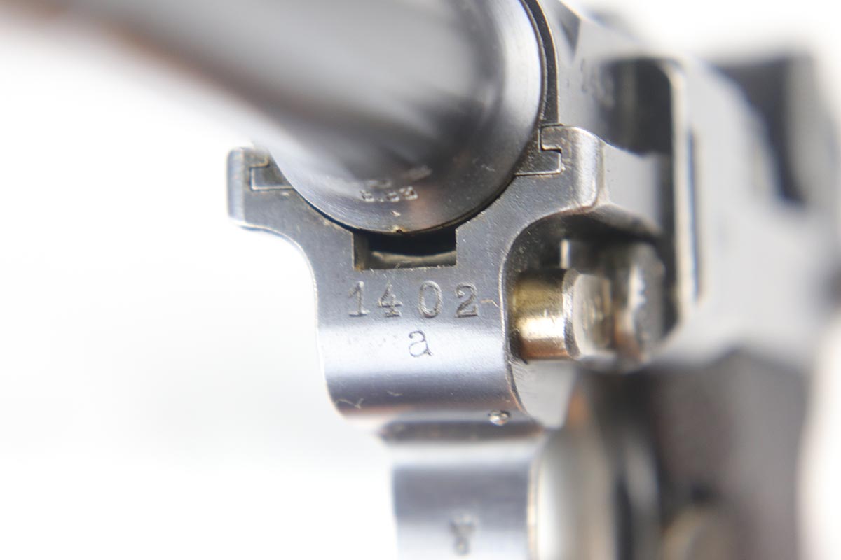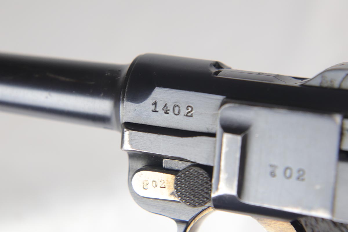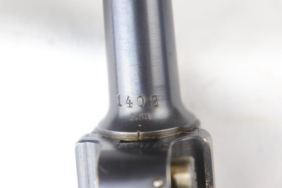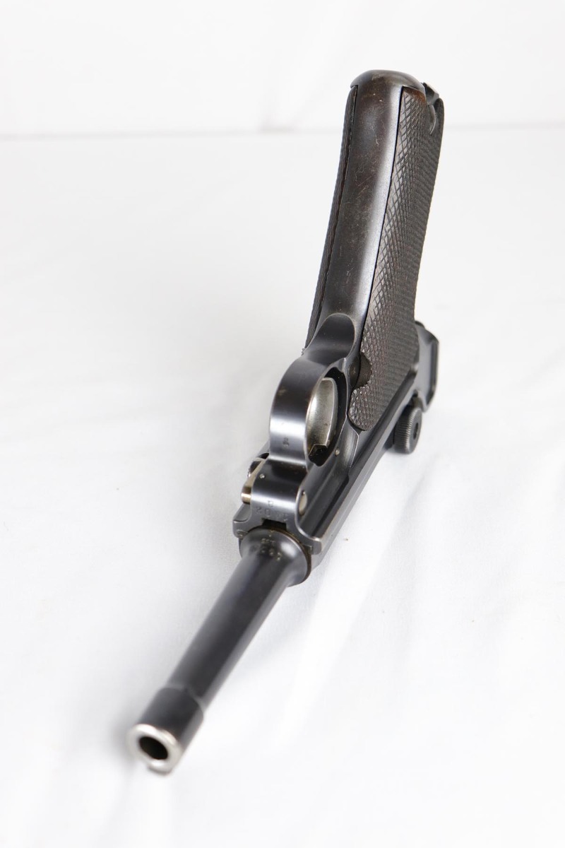 7/12/18 – This is a scarce, excellent Simson military luger from the 1930s.  All numbered parts are matching and original, including the grips.  The finish rates at 95+% with minor edge wear, mainly on the sideplate and left side of the muzzle.  The straps also show some patina coming through.  The small parts show very nice original straw, rating at maybe 80-90%.  Small parts are also Simson proofed, even down to the grip screws.  The grips are numbered and matching to the gun but were renumbered at some point.  The magazine is unmarked.  Strong, shiny bore.