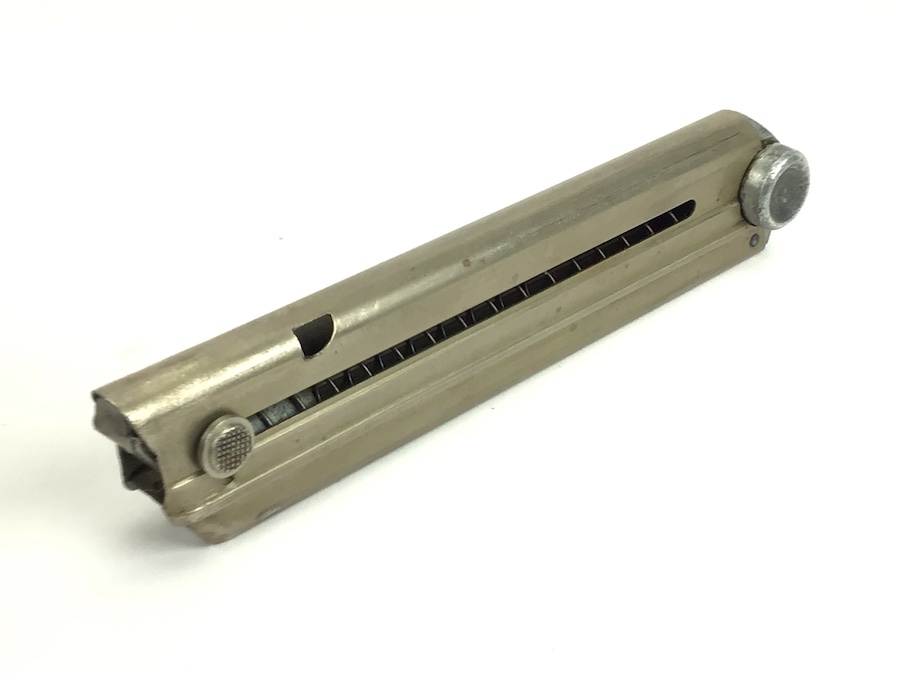 6/22/21 – Original and excellent condition. Pre WW2 production Simson Luger magazine. The frame has no rust or pitting. The base of the magazine is serial numbered “1202 a” with two Simpson eagle/6 proof stamps. The spring is strong and fully functional. This is a very rare and desirable Luger magazine.