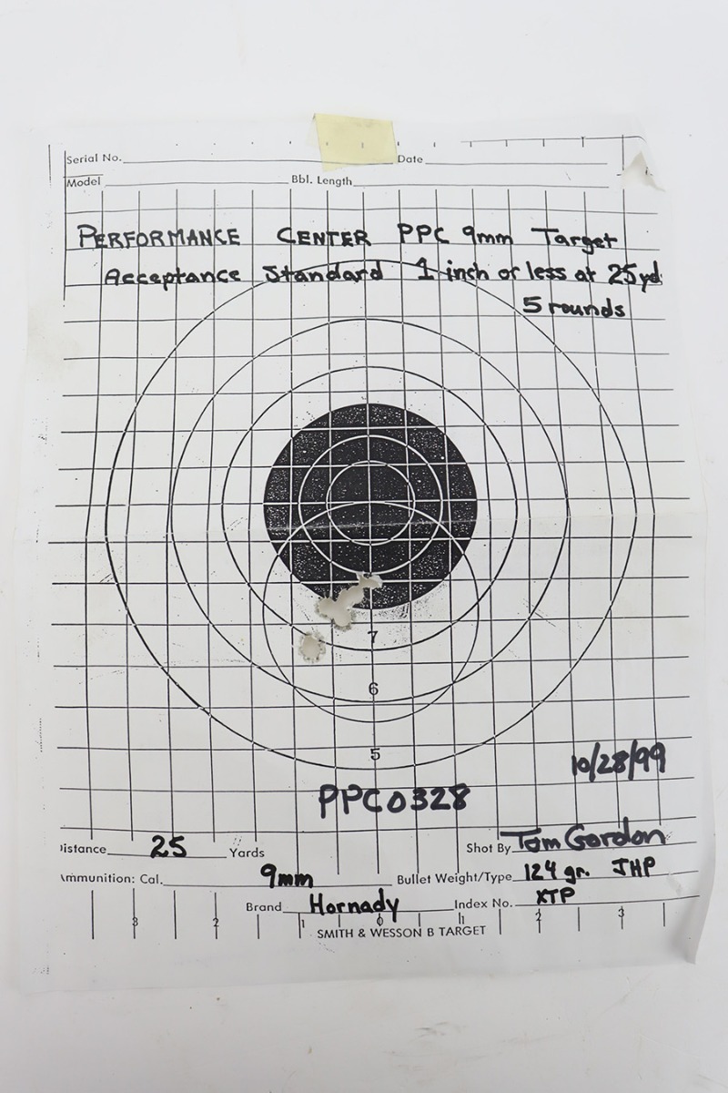 11/29/23 – This is a scarce and desirable Smith & Wesson 5906 PPC Target Model, manufactured in October of 1999. This is a modified, hand built 5906, made by the Performance Center specifically for police pistol competition, and was only available to LEOs. Another interesting feature is the Aristocrat sight. The PPC matches shot at multiple distances out to 50 yards, so the sight has 3 Allen adjustments on the top, to set zero’s at three separate distances, so you could sight it in at 7, 25, and 50 yards, then the screw on the side clicks between the 3 different zero’s for easy adjustment during a match. This example is in fantastic condition, with zero wear to note on the metal and a terrific bore. Minty grips. Comes with original test target and a S&W Performance Center carrying case.