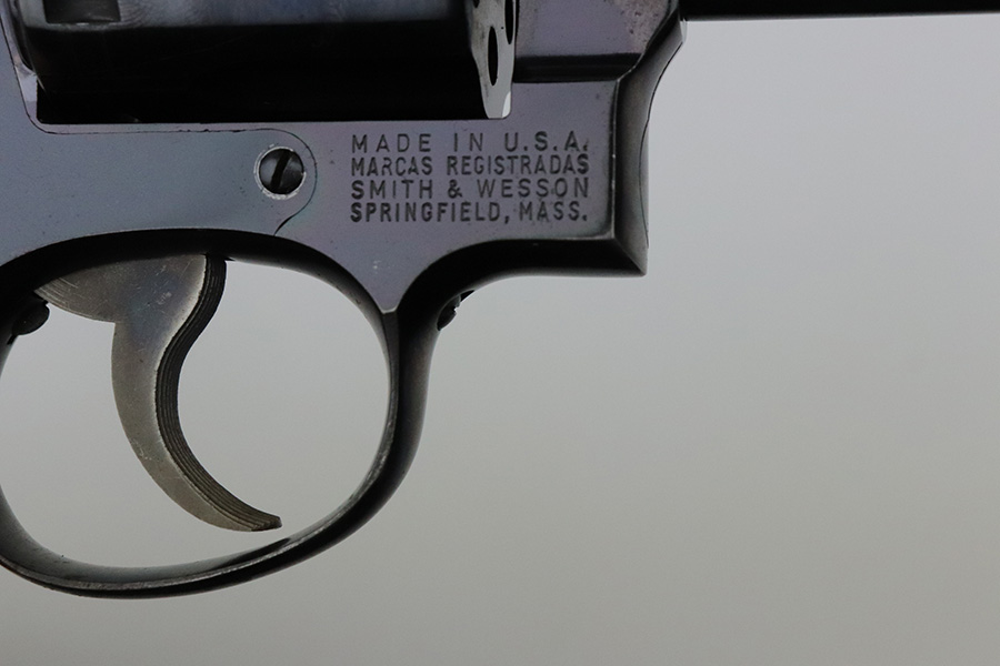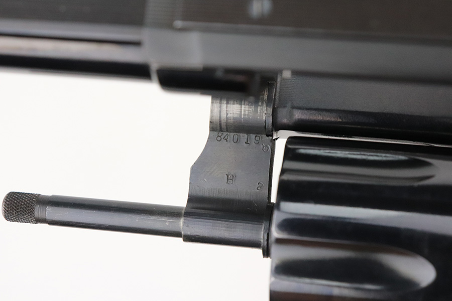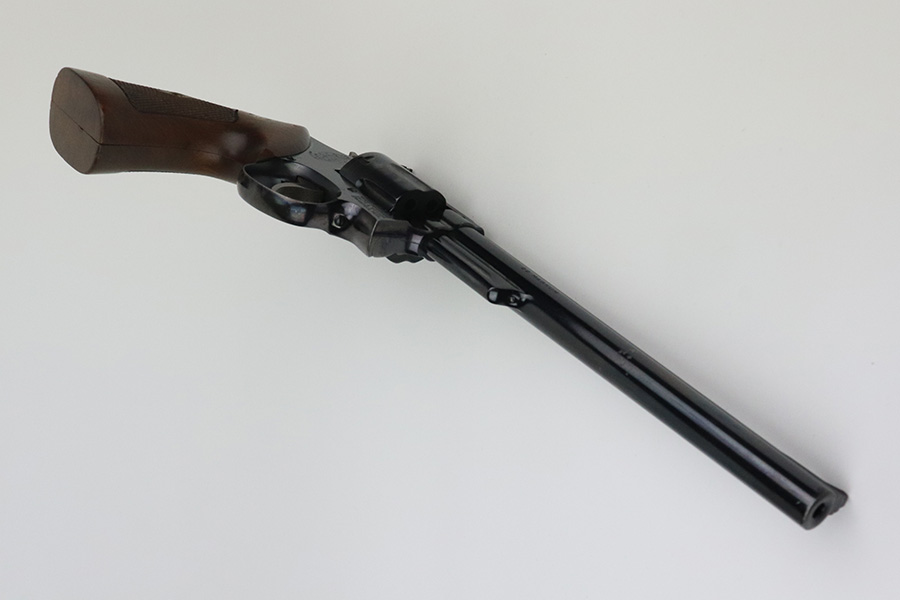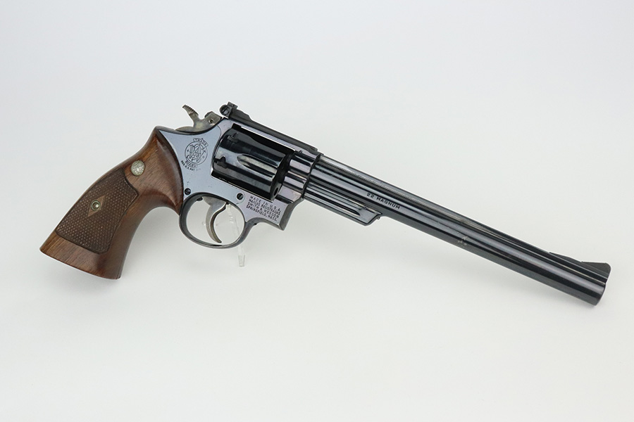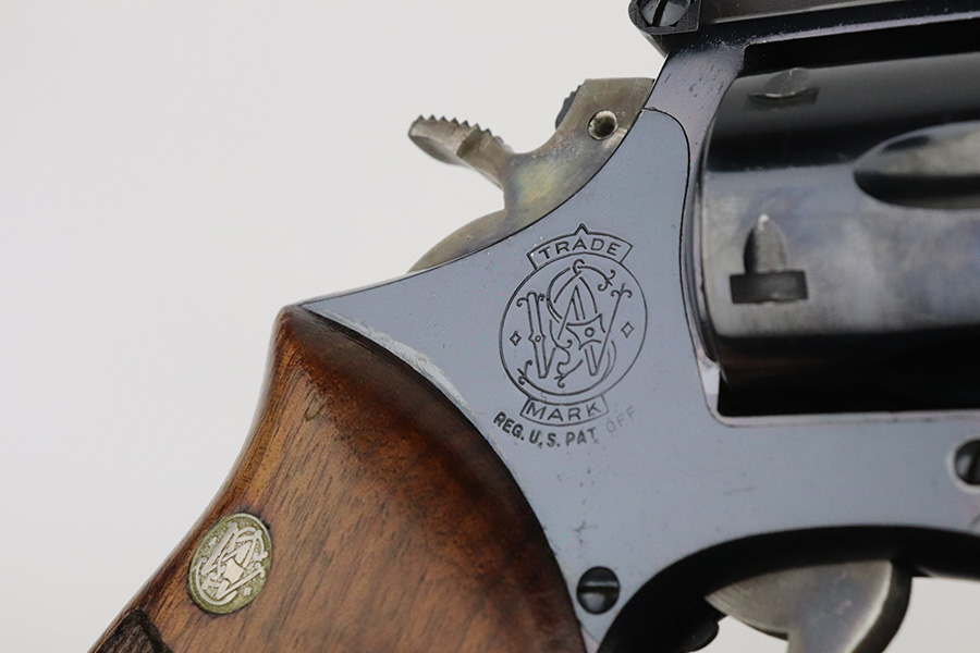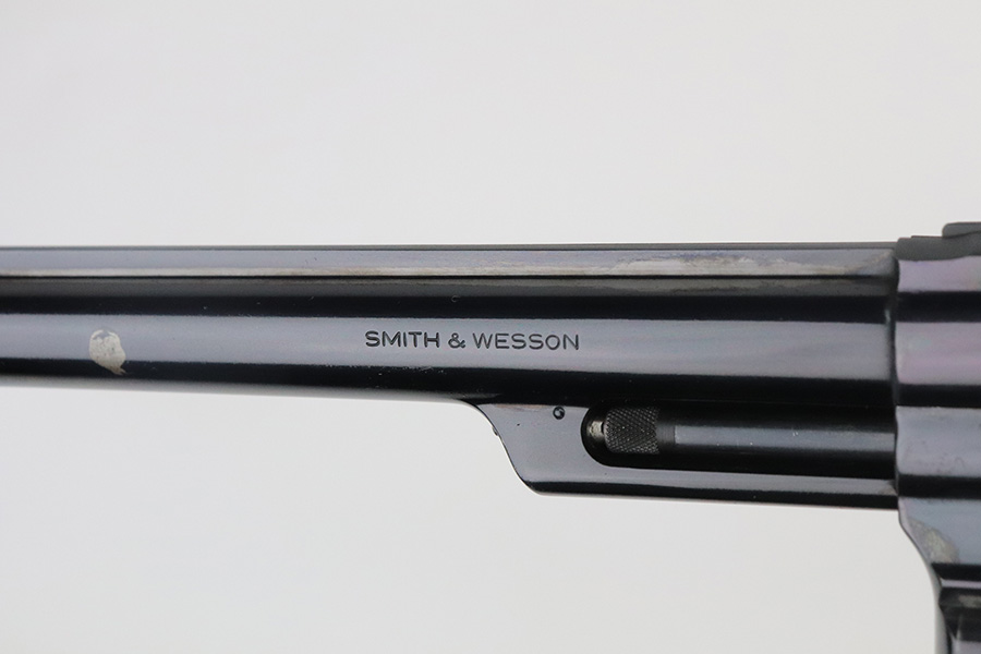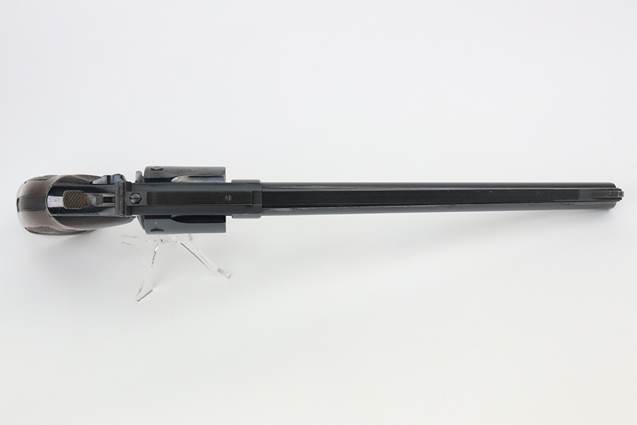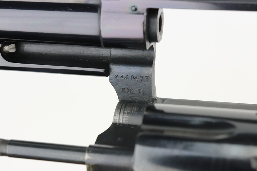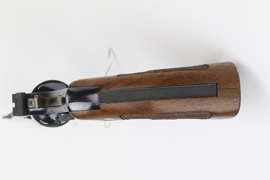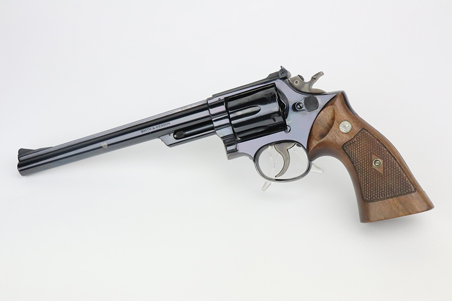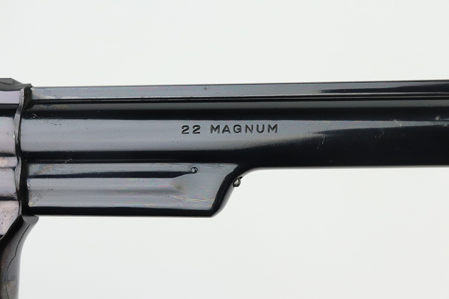 10/6/21 – This is a nice example of the scarce Smith & Wesson Model 53 revolver with 8 3/8in barrel. These revolvers were chambered for .22 Remington Jet, also known as .22 Jet or .22 Magnum. Developed jointly by Remington and Smith & Wesson, it was to be used in the Model 53 revolver, which first appeared late in 1961. While it traced its origins to potent wildcats such as the .224 Harvey Kay-Chuk, which ultimately derive from the .22 Hornet, it was a bottlenecked cartridge based upon the .357 Magnum case necked down to a .22 caliber bullet, with an unusually long tapered shoulder. It has six cylinder inserts to allow shooter to quickly switch from .22 Jet to .22LR. This one has all original blue with a patch of finish loss that wraps around the barrel, and another on the trigger guard. Minty bore and good mechanics. Excellent grips with minor handling wear. C&R eligible.