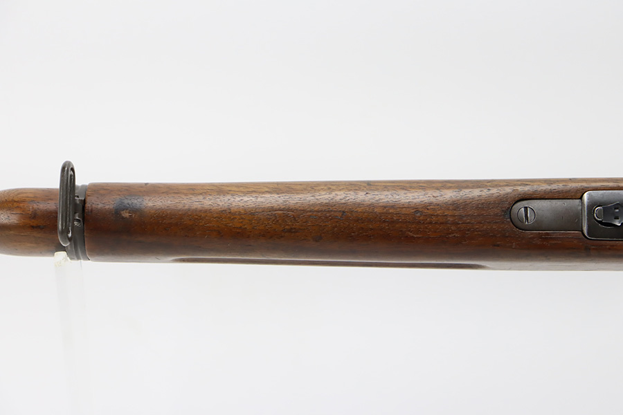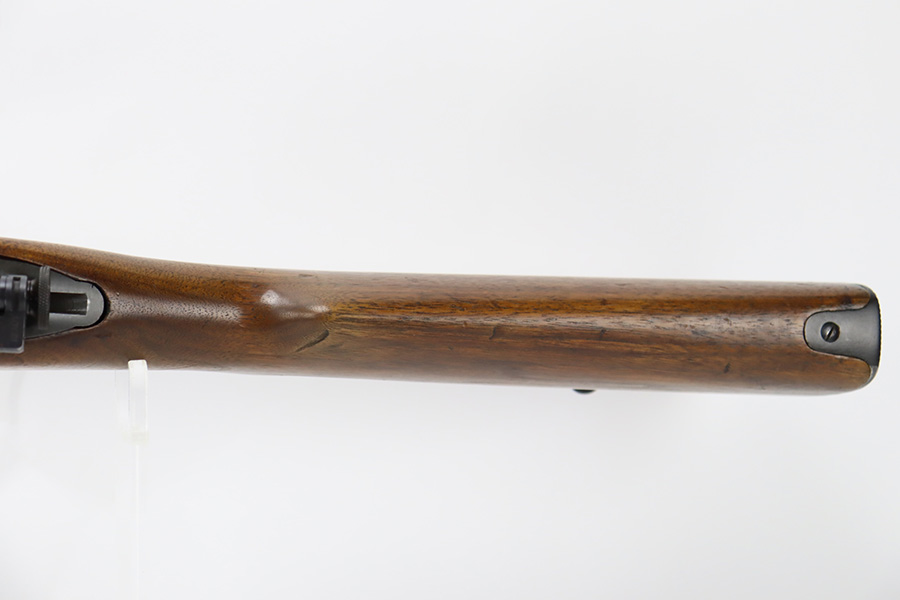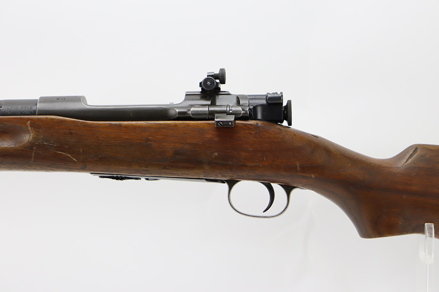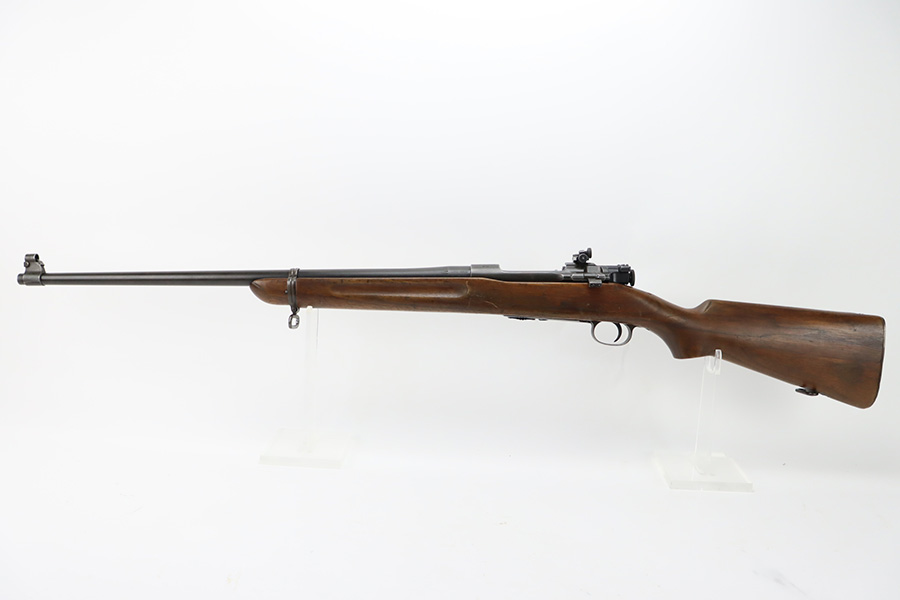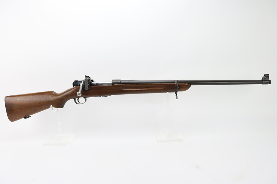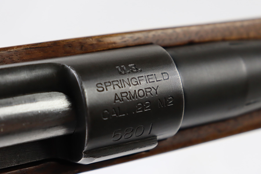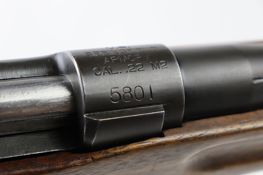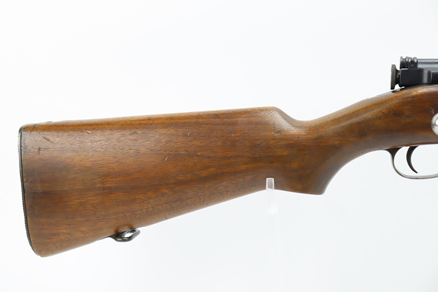 10/6/23 – This is a scarce Springfield Armory M2 rifle. The ‘M2’ designation with no ‘1922’ roll mark started in 1933, and this one has a parkerized finish with a barrel date of July of 1937. These were made to mimic the 1903 rifle for training purposes, and chambered in .22LR. The finish rates about 93% with general high edge wear and some thinning on the barrel band and floor plate/trigger group (some light brown patina in the same areas). There are dings and light scratches on the stock here and there. Comes with one magazine. Mint bore.