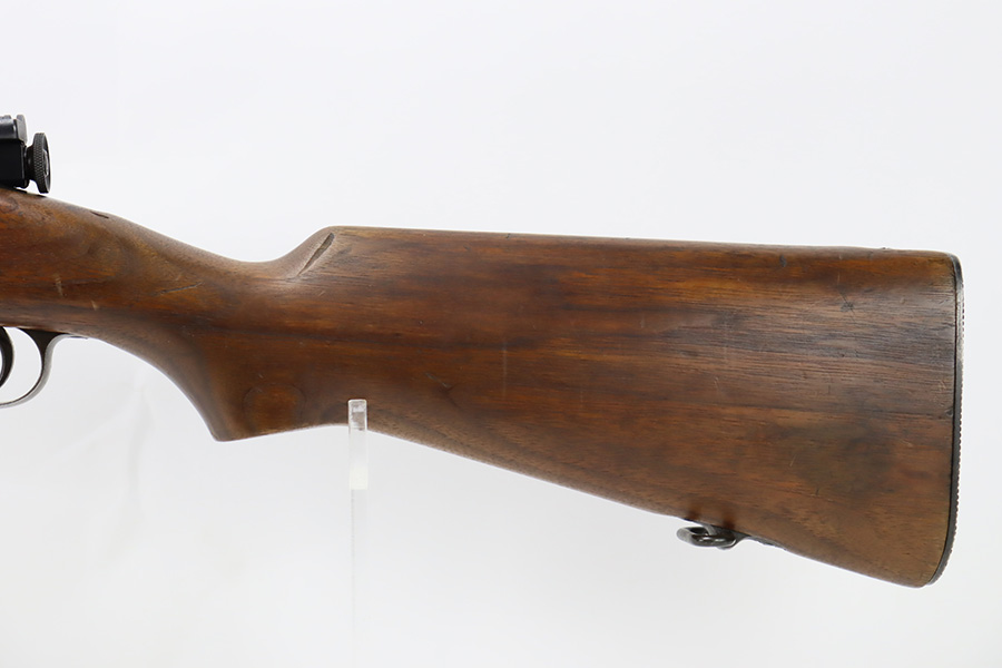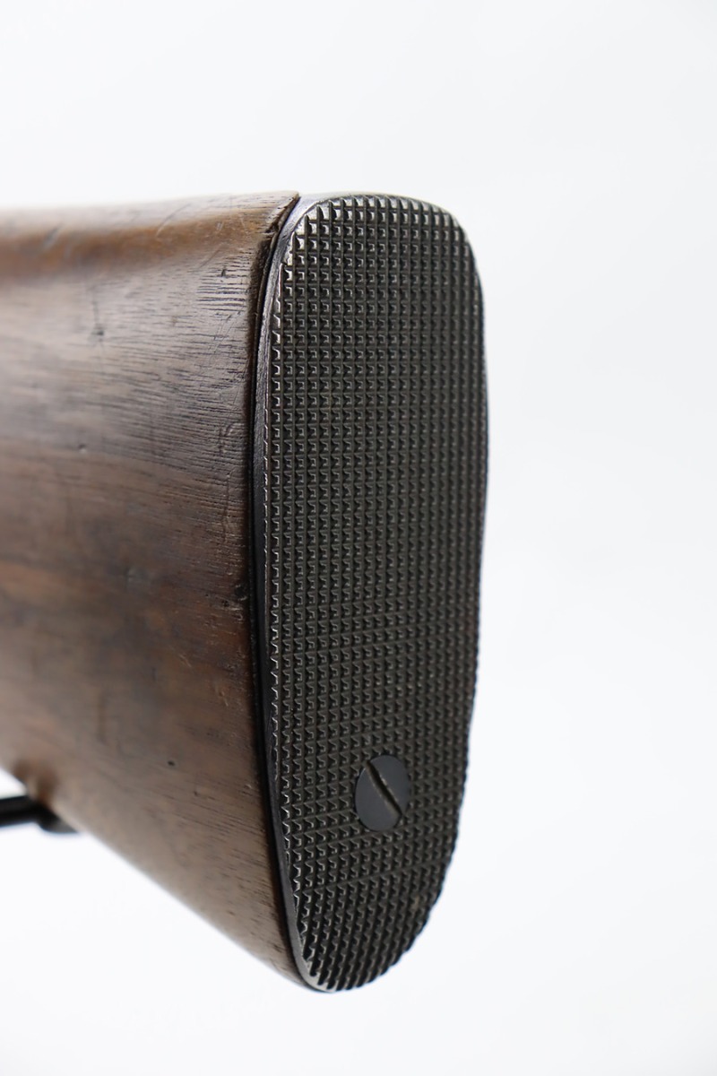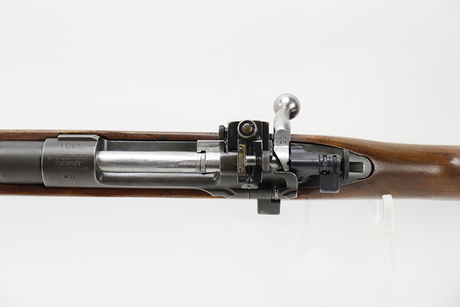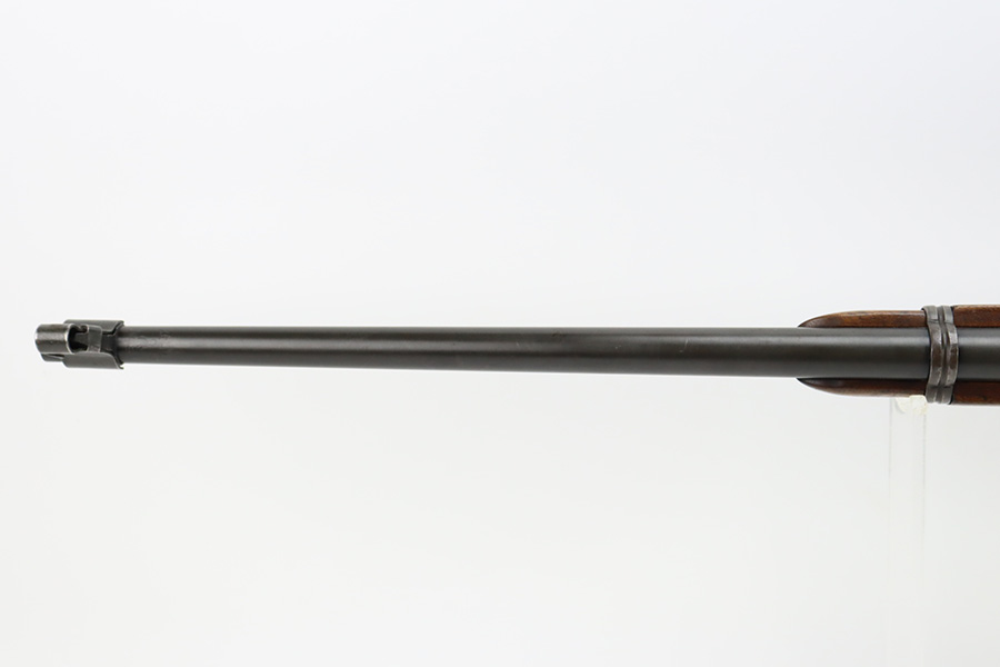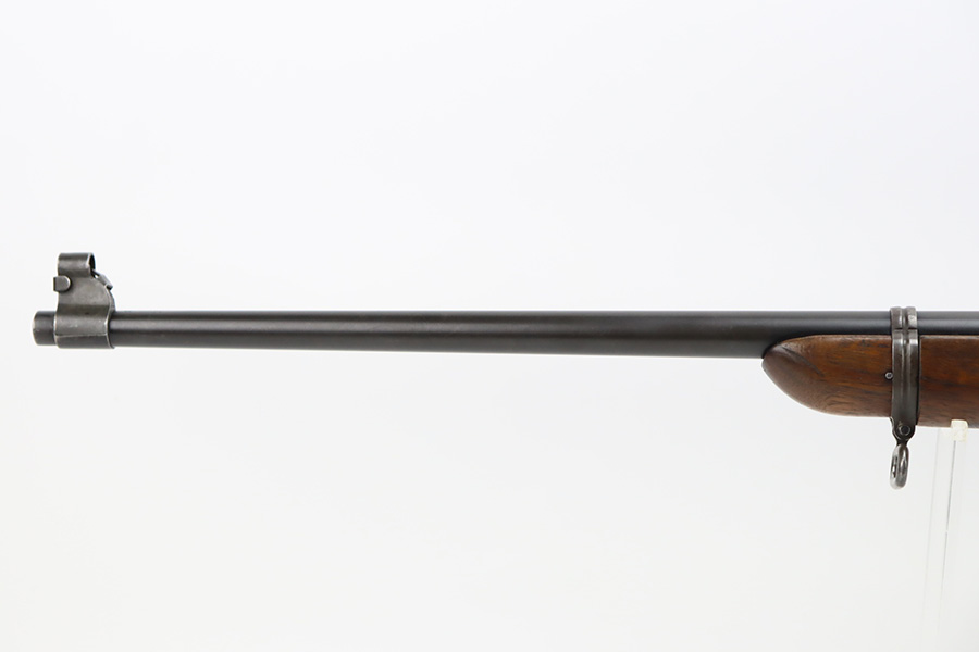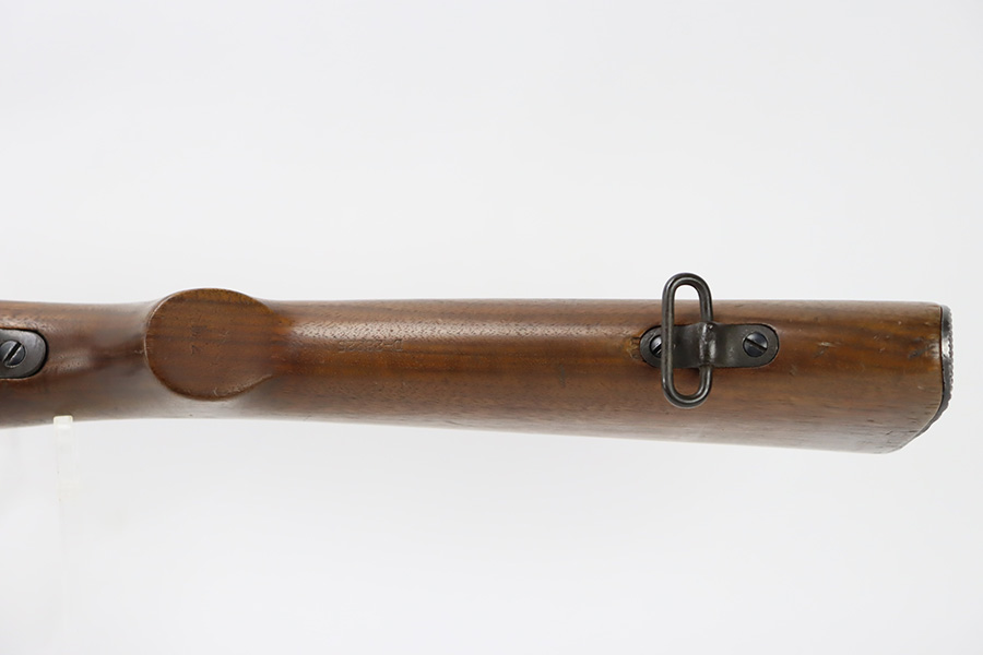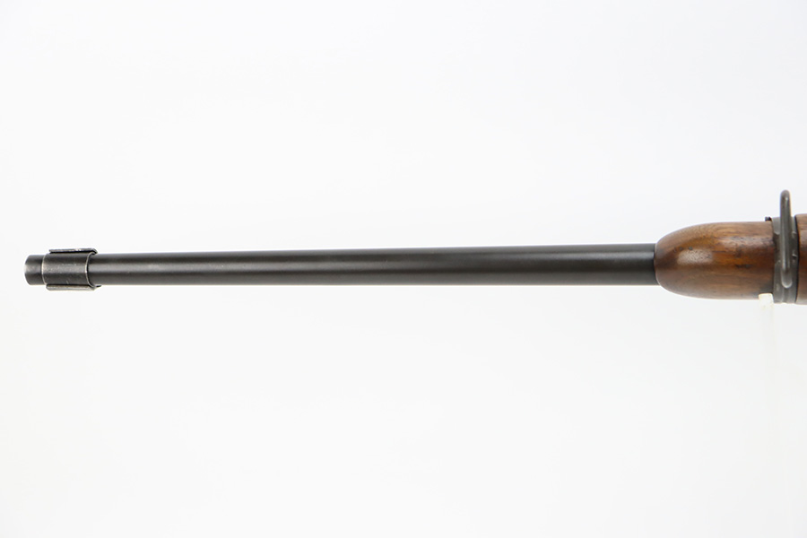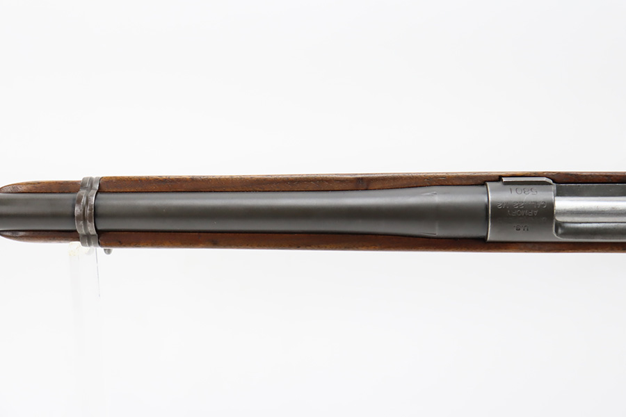 10/6/23 – This is a scarce Springfield Armory M2 rifle. The ‘M2’ designation with no ‘1922’ roll mark started in 1933, and this one has a parkerized finish with a barrel date of July of 1937. These were made to mimic the 1903 rifle for training purposes, and chambered in .22LR. The finish rates about 93% with general high edge wear and some thinning on the barrel band and floor plate/trigger group (some light brown patina in the same areas). There are dings and light scratches on the stock here and there. Comes with one magazine. Mint bore.
